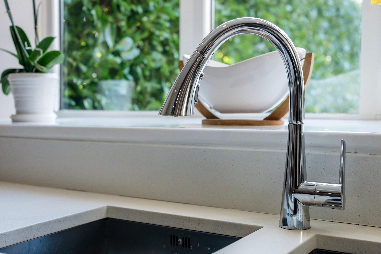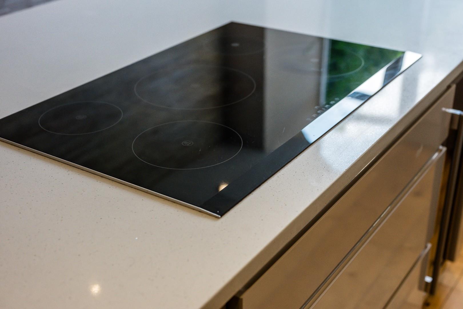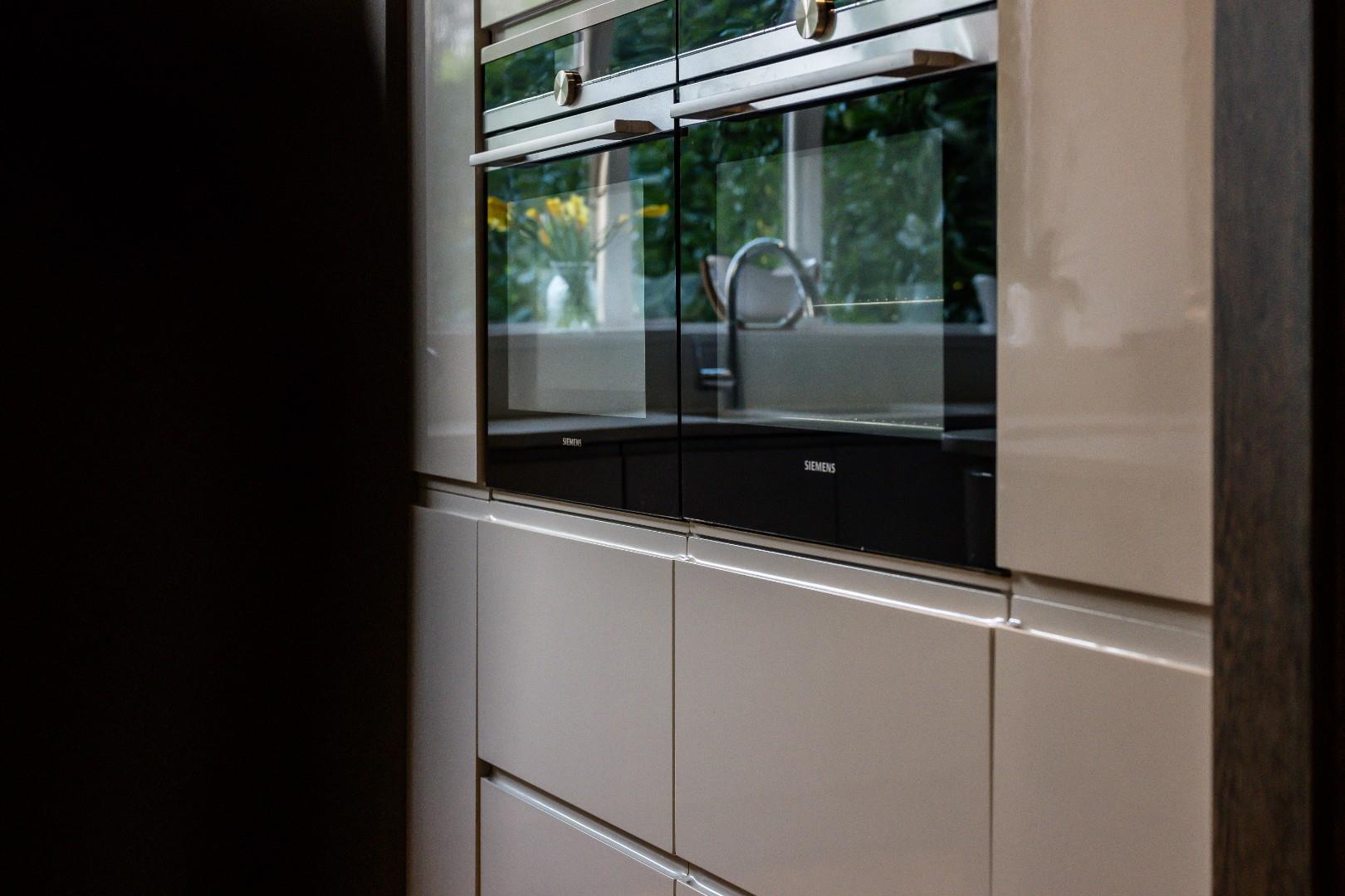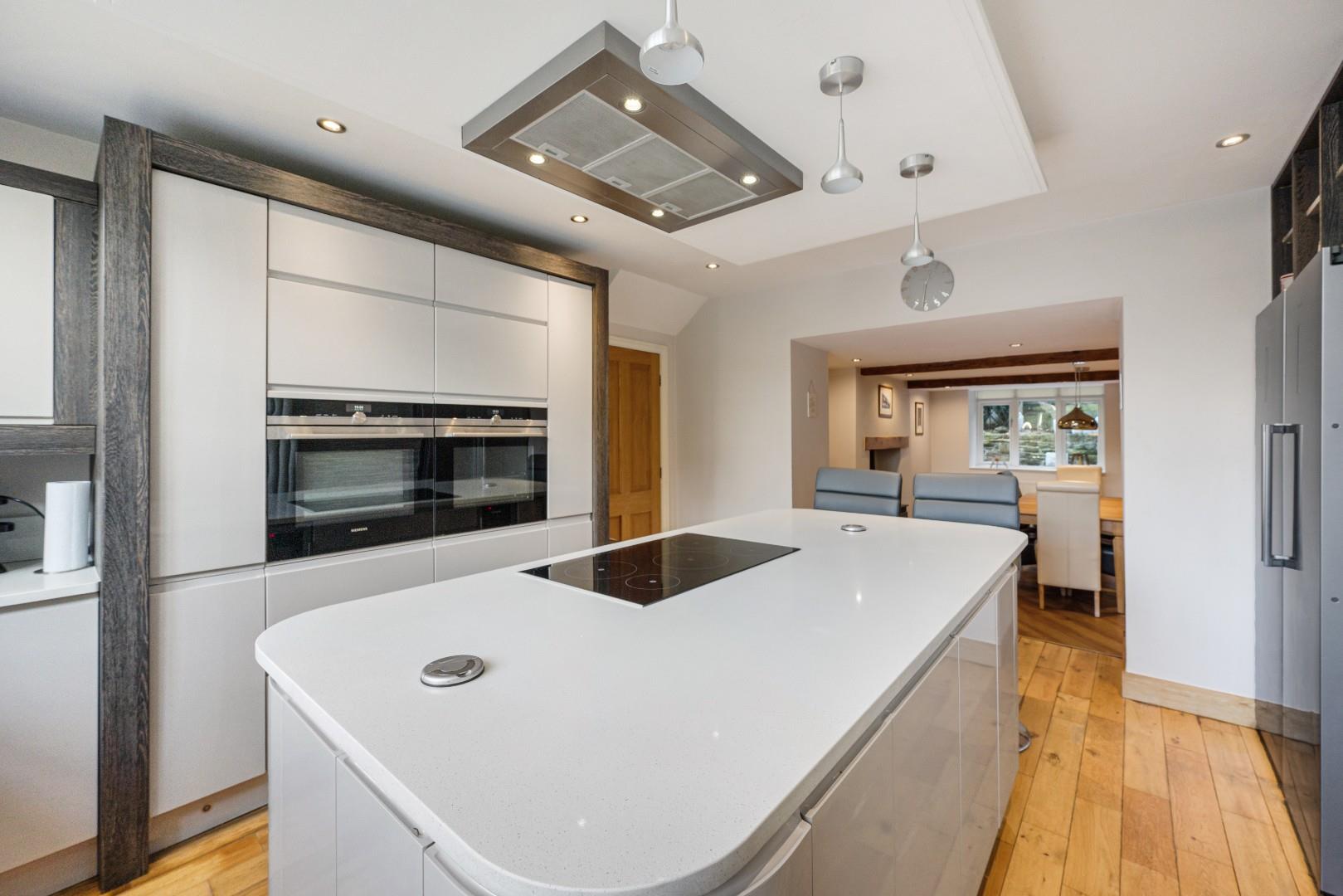 To the right of the entrance hall is a high-quality contemporary kitchen, featuring an oak floor that adds a stylish contrast to the quartz worktop and gloss cabinetry with wood veneer framing. It's a fantastic social space that's perfect for both everyday life and when hosting family and friends. The island gives a huge amount of worktop space and bar seating, and the top-quality integrated appliances include a Siemens oven and a combination oven/microwave, five-plate induction hob with matching ceiling extractor, dishwasher, an inset Smeg sink with Hans Grohe tap, oodles of storage, and an allocated spot for a large freestanding fridge-freezer.