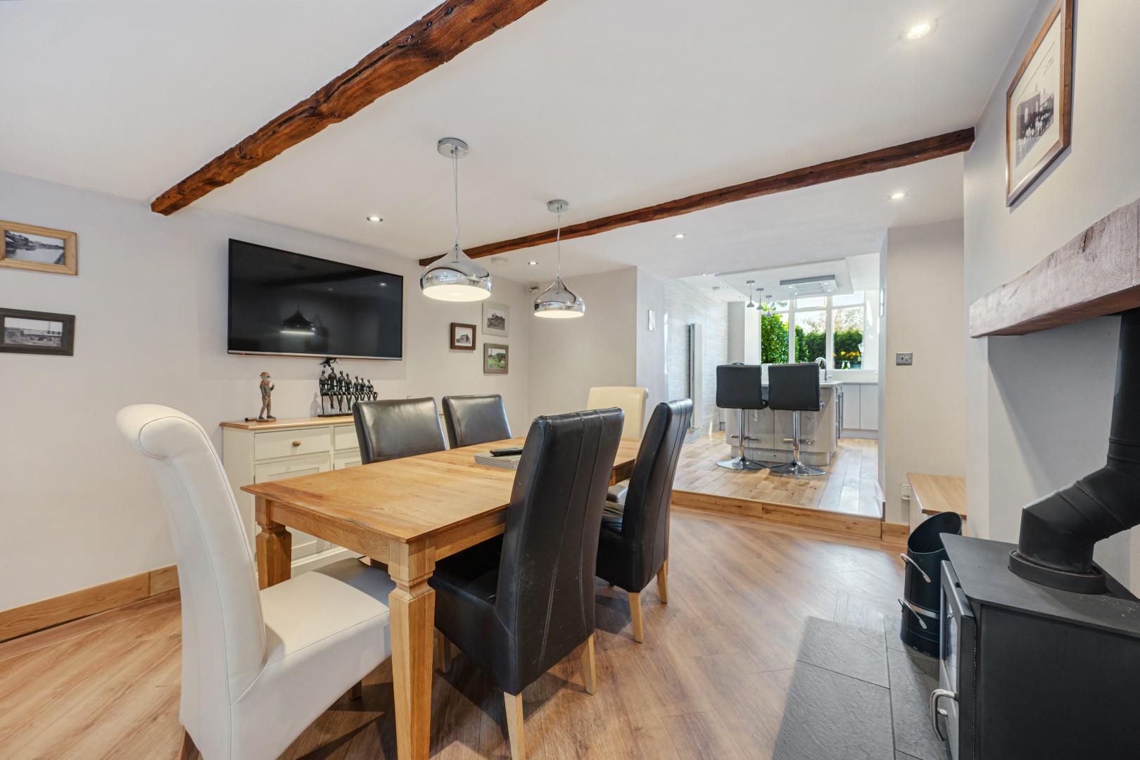 Next to the kitchen in an open aspect layout is the dining room, which adds further to the social appeal. Its generous size gives plenty of room for a large dining table, and the log burner with slate hearth and oak mantle creates a rustic country aesthetic, and is sure to provide a lovely warming glow on cold wintery days.