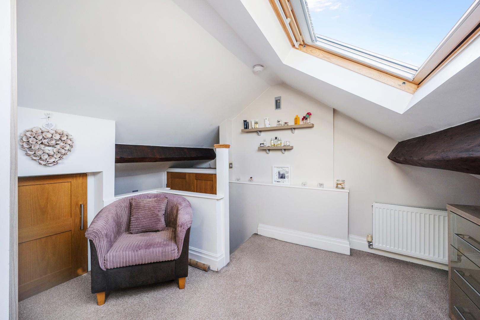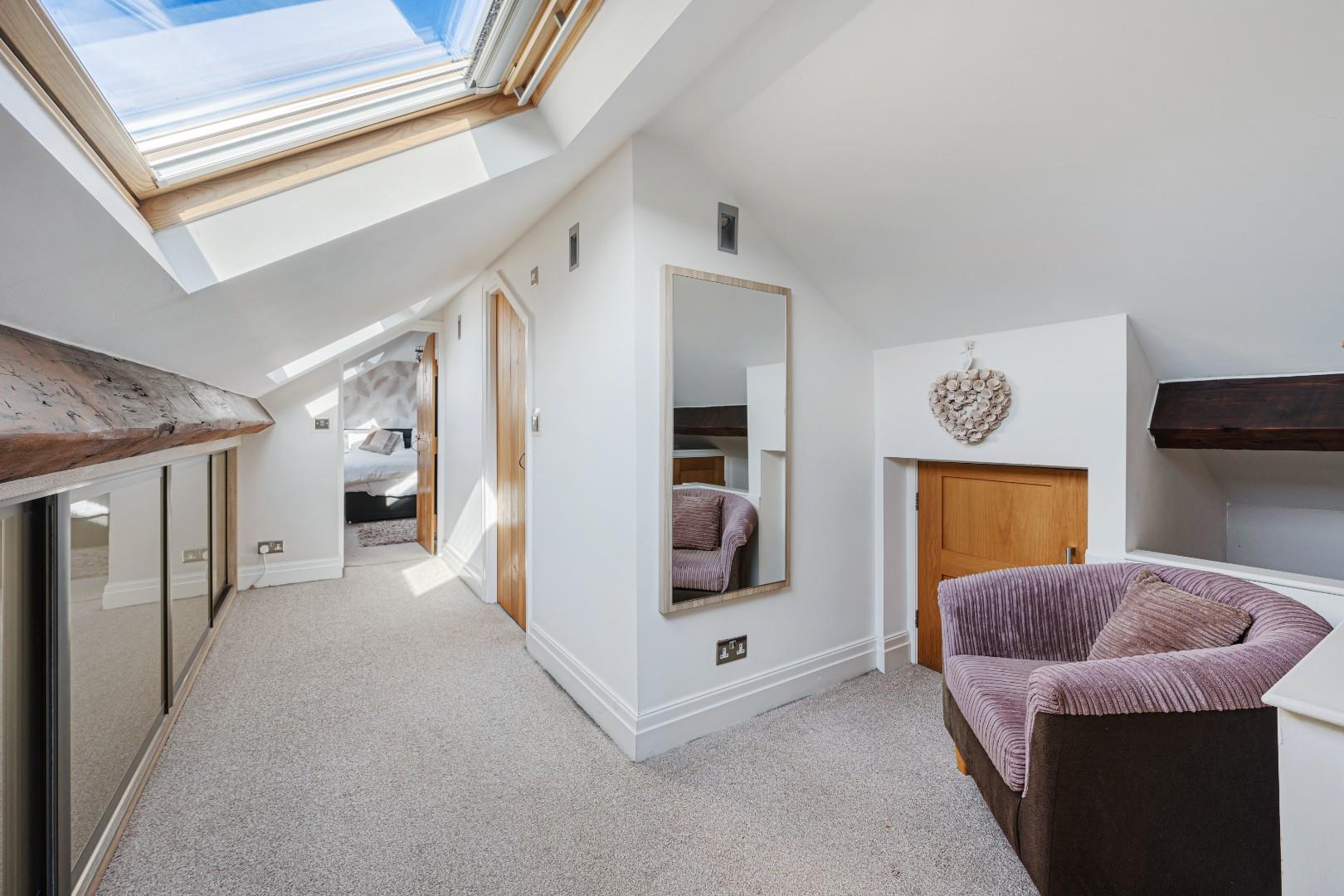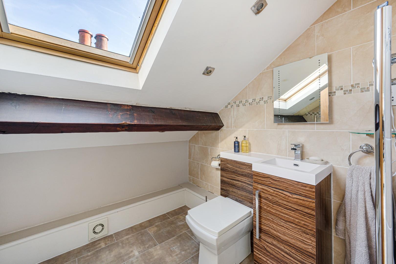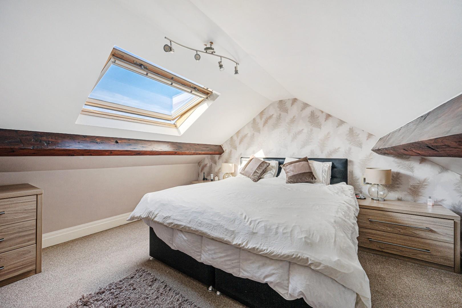 The master suite occupies the entire second floor, with more sloped ceilings an multiple Velux windows which pour in natural light while adding to the unique character. In addition to the double bedroom, the master suite includes a dressing area with modern fitted storage, and a three-piece en-suite, comprising bath with shower, and a vanity basin unit with integral storage and WC.