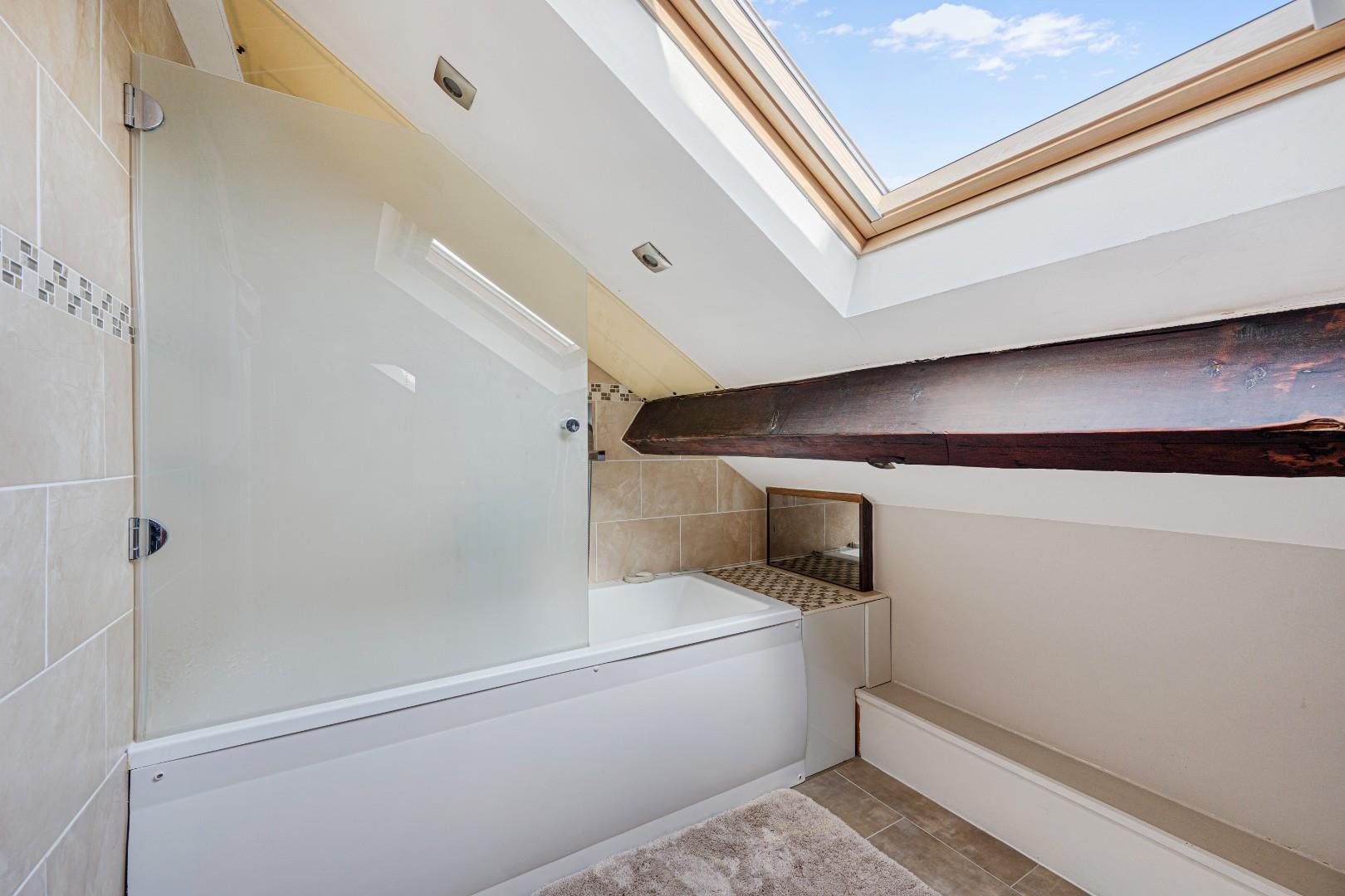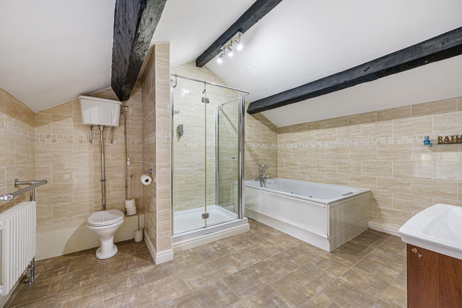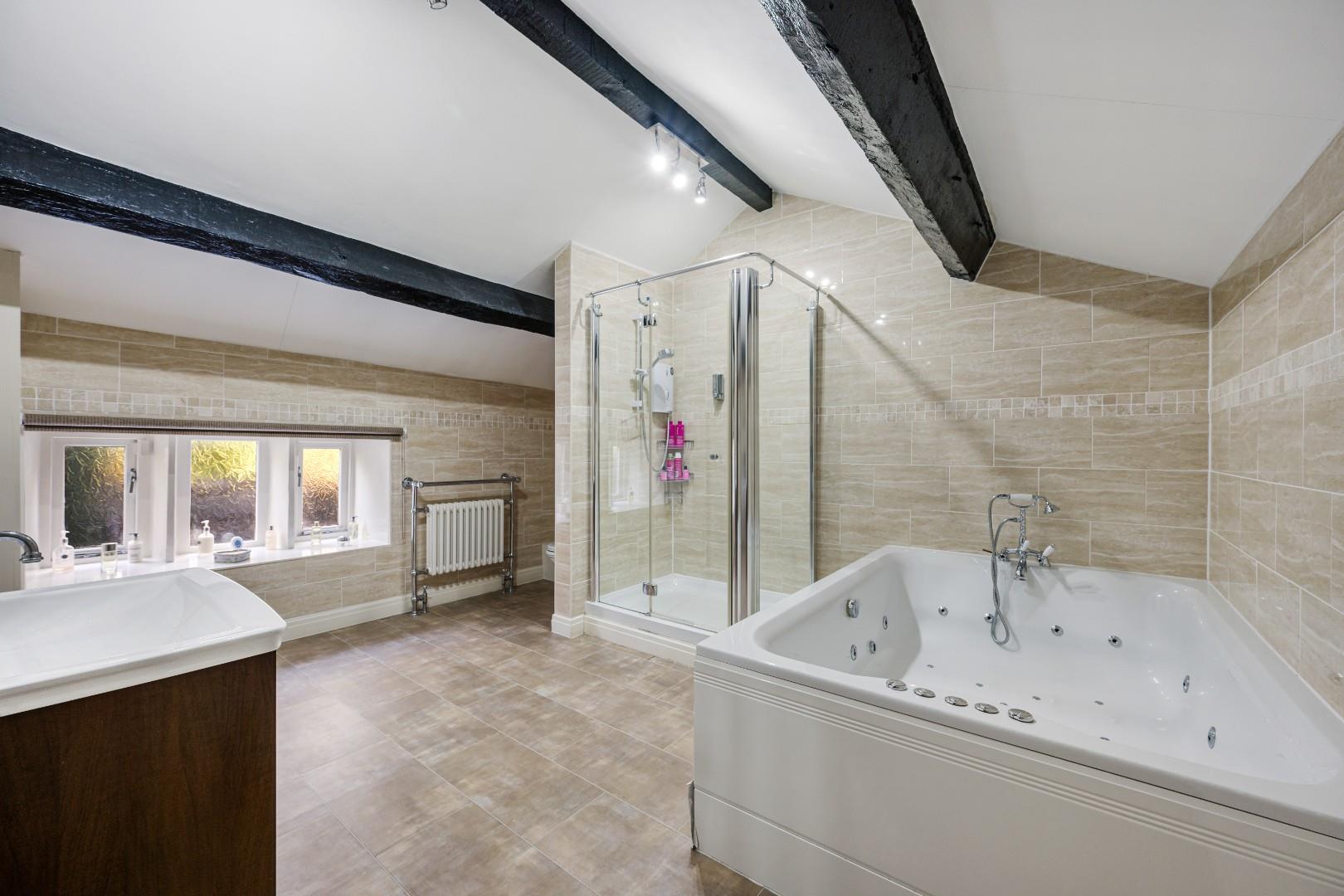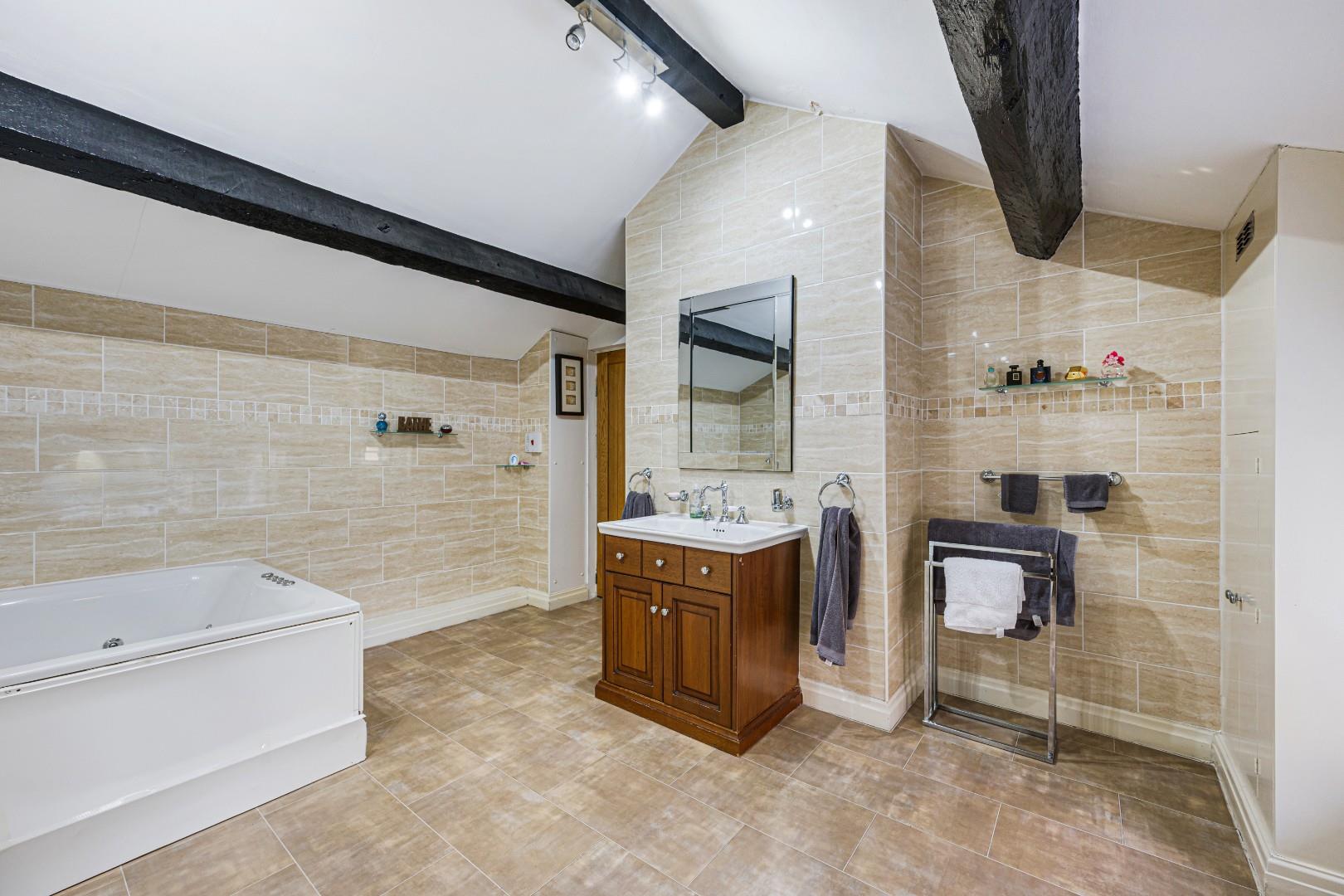 Also on the first floor, the family bathroom is most likely one of the biggest you've ever seen! Its huge size allows heaps of space to accommodate a supersize jacuzzi bath, large walk-in shower, basin with large storage cabinet, WC, and a large feature radiator that matches the period styling of the basin. Its sloped ceilings and beam work here also add to the character and charm.