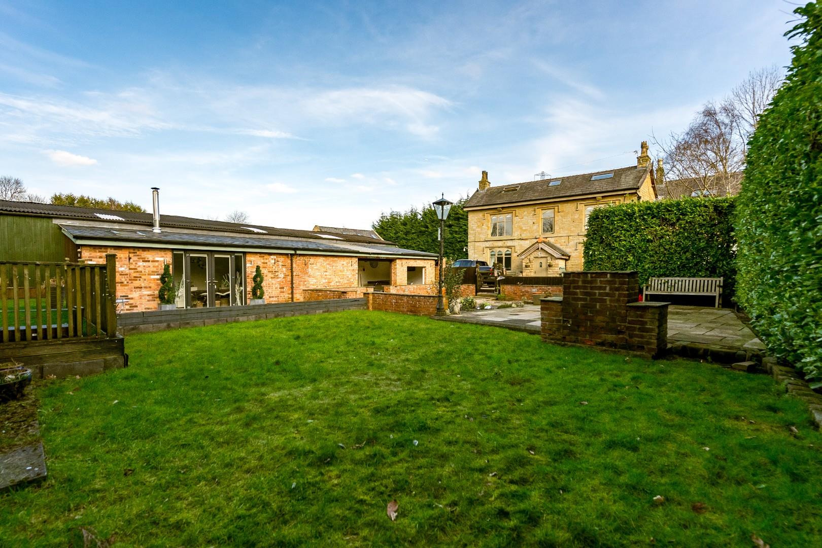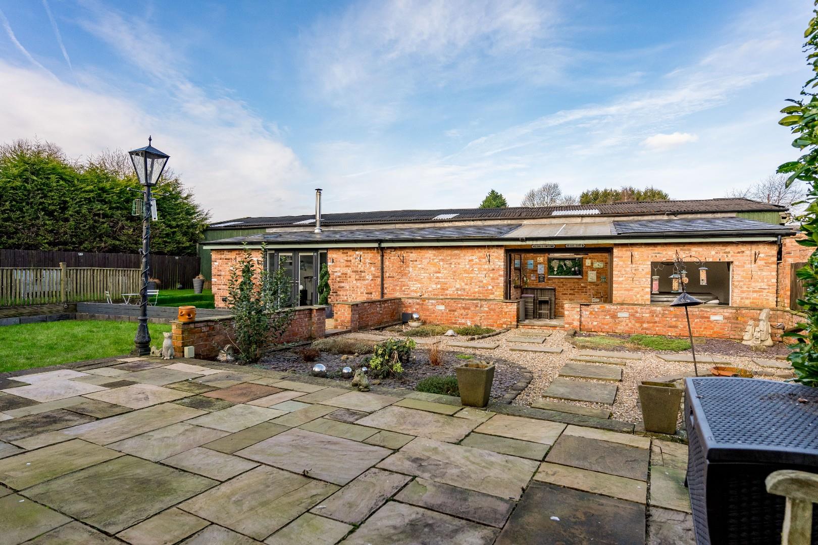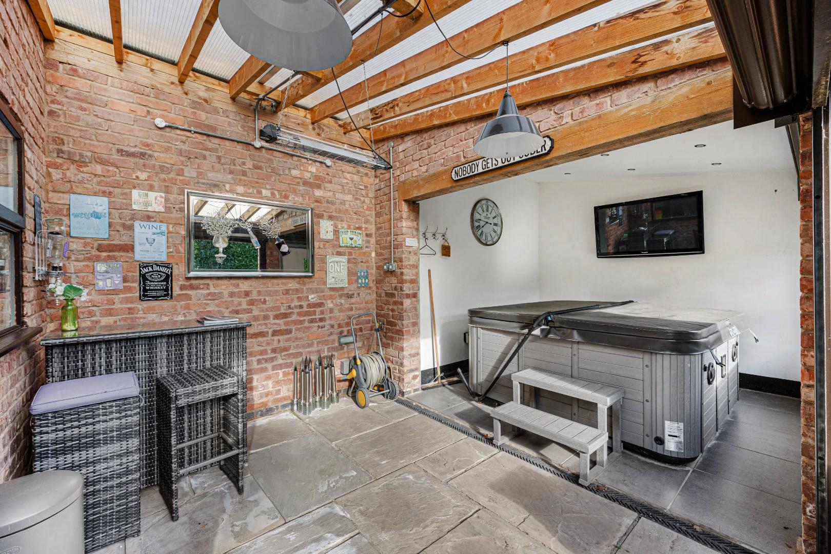 Externally the plot includes a large private drive, two large patio areas, a large landscaped private garden with a secluded bar and hot tub area, and the annex/outbuilding comprises a versatile room or bedroom, bathroom, and kitchen.