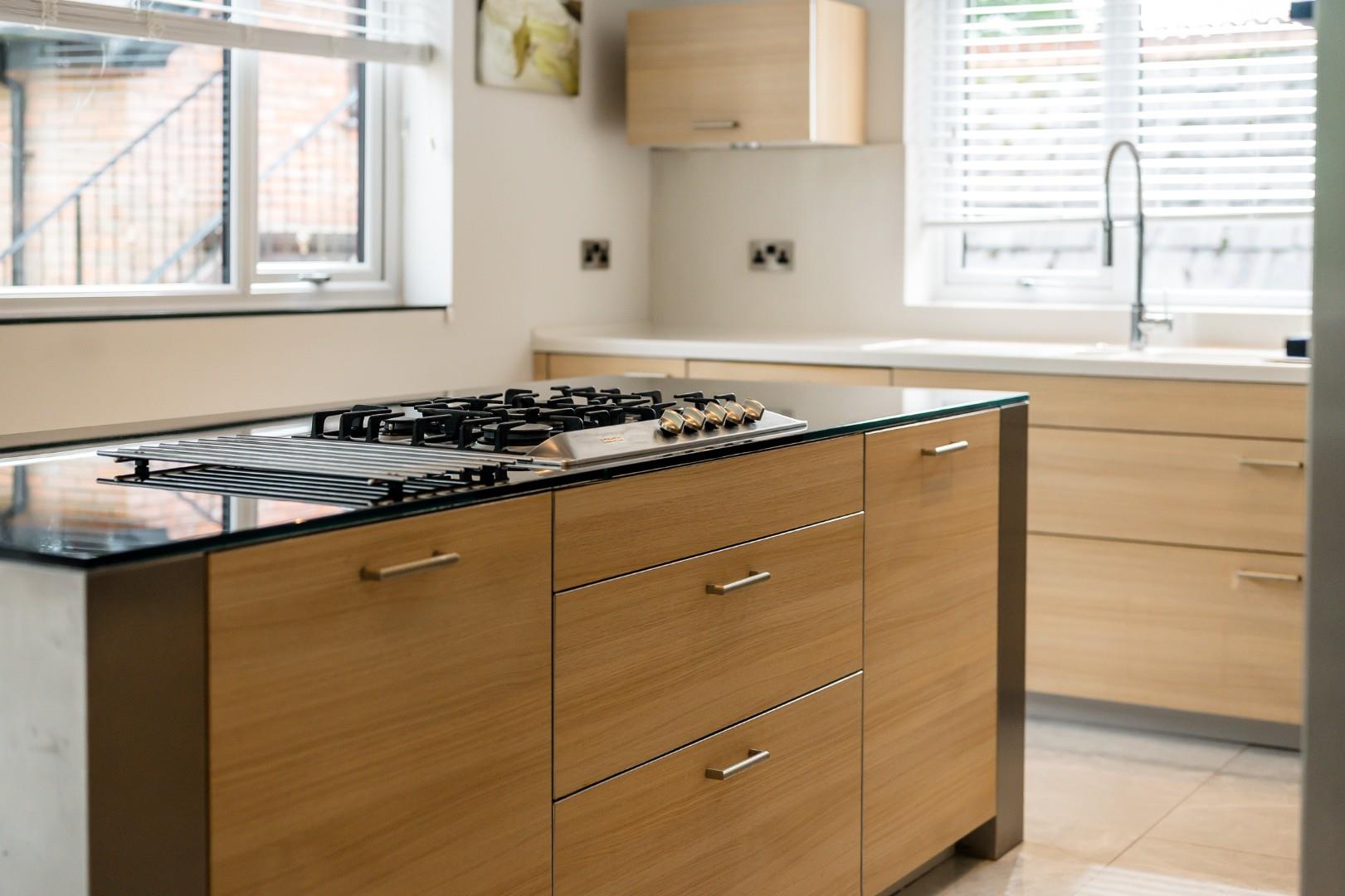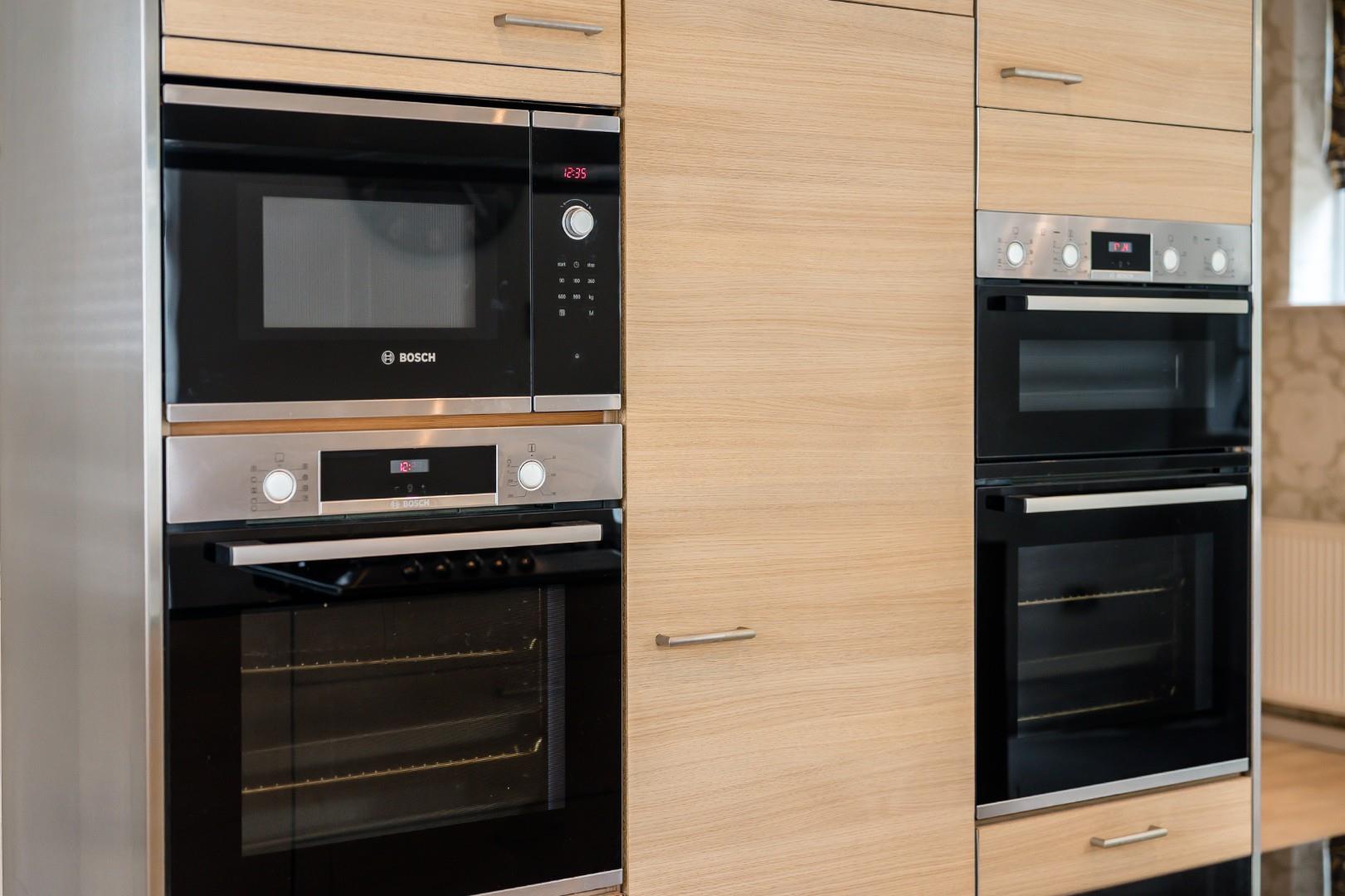 The premium Poggen Pohl kitchen is fitted with a comprehensive range of top-quality appliances, including a Miele five-ring gas hob with a hanging extractor hood, three Bosch ovens and a Bosch microwave, dishwasher, as well as a Siemens full length fridge. The appliances are set amongst the beautiful light oak cabinetry with stainless steel edgings. Surfaces are a stylish mix of glass on the island and a sleek Corian top which is one bespoke piece to seamlessly create the splashbacks and sink with inset drainer, paired with a swan-neck flexi mixer tap.