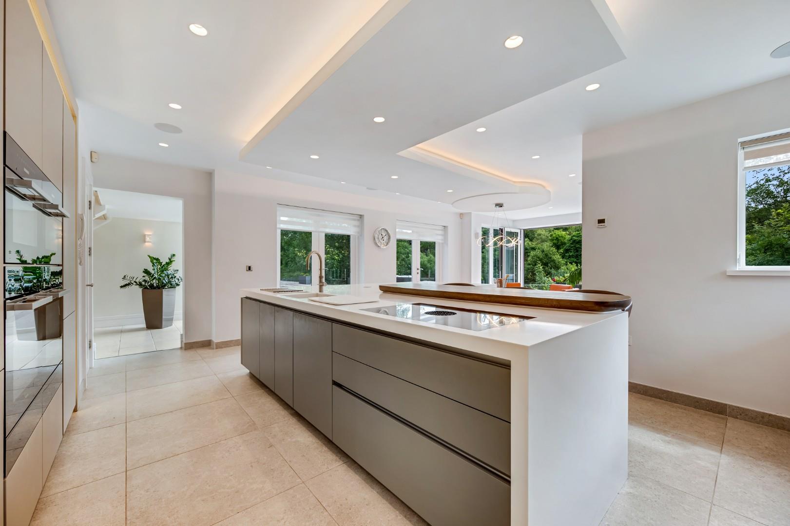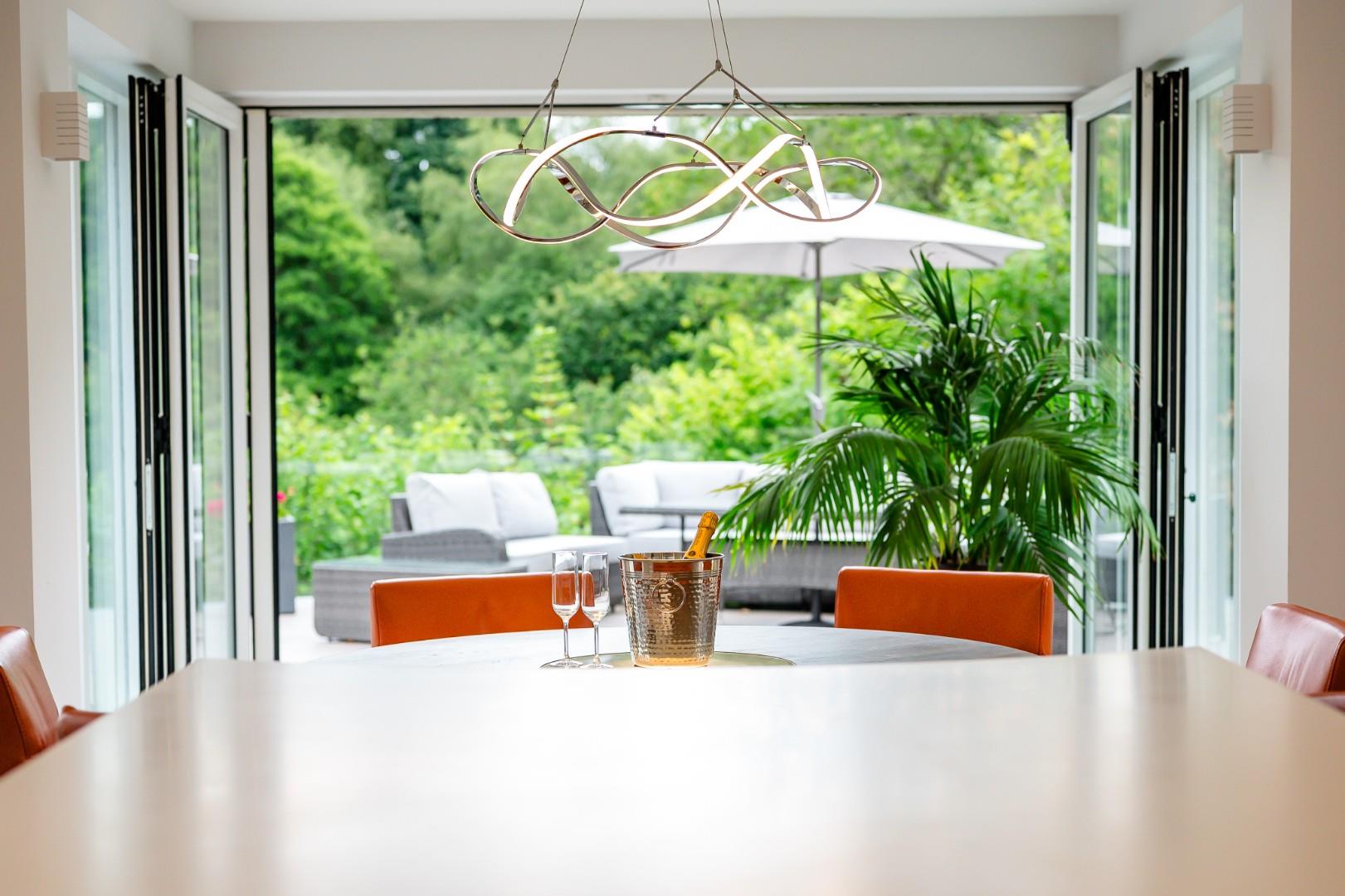 The Designer Kitchen - The heart of the home is the exceptional designer kitchen and daily dining area - a breathtaking space with plentiful glass and panoramic views of the gardens and valley below. Bifold doors and three sets of French doors open onto a vast elevated composite deck, creating seamless indoor-outdoor living.