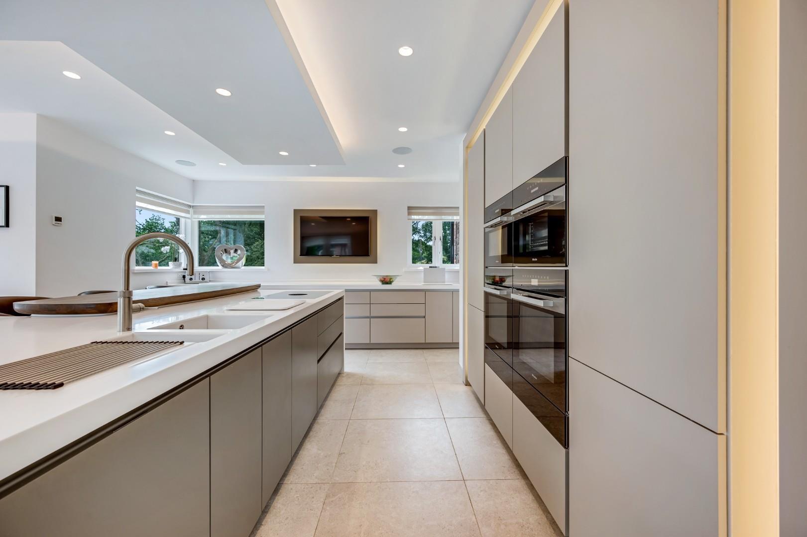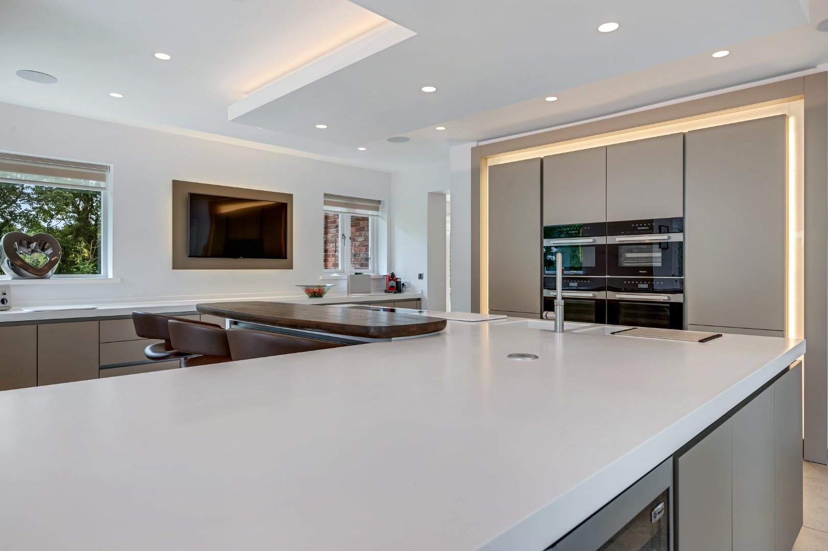 Designed and installed by the renowned Stuart Frazer, this premium Siematic kitchen features minimalist cabinetry, ambient recessed lighting, and deep Corian worktops. Every detail has been considered - from the walk-in pantry to the well-tailored storage and integral larder cabinets.