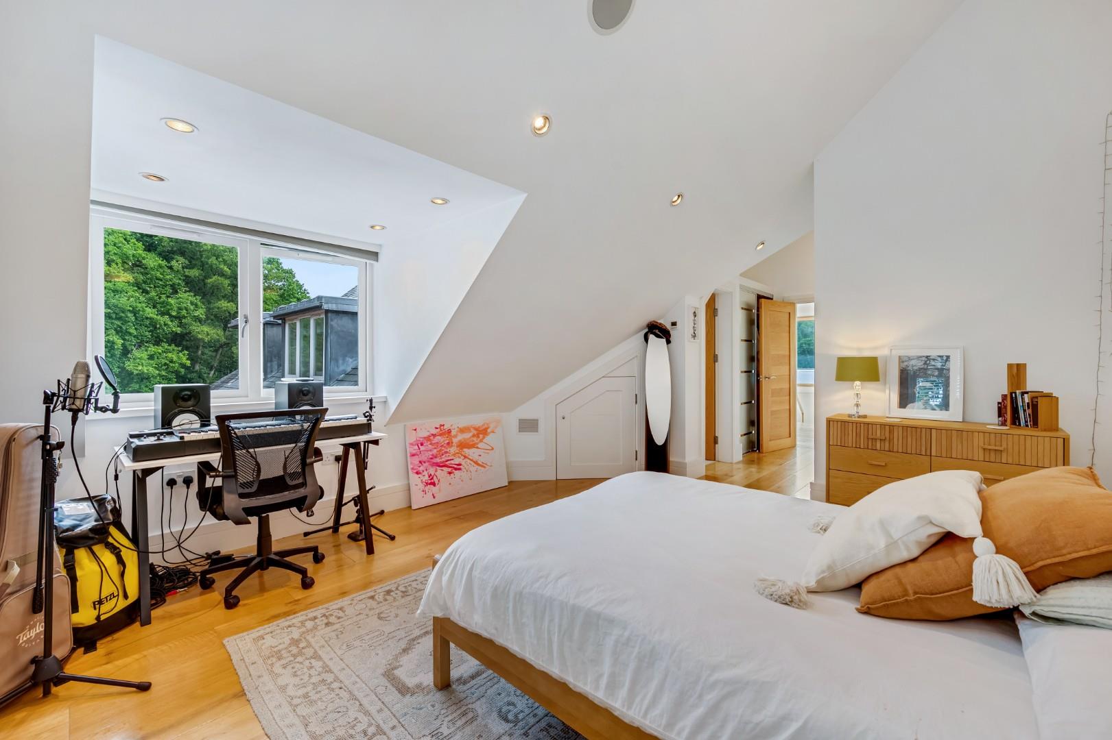 The surrounding grounds include manicured lawns, landscaped borders, rockeries, and mature trees. To one side, Japanese-inspired tiered lawns step down to a large wildlife pond, offering a magical connection to the river and nature. A children's treehouse completes the picture - making this a truly special home for every generation.