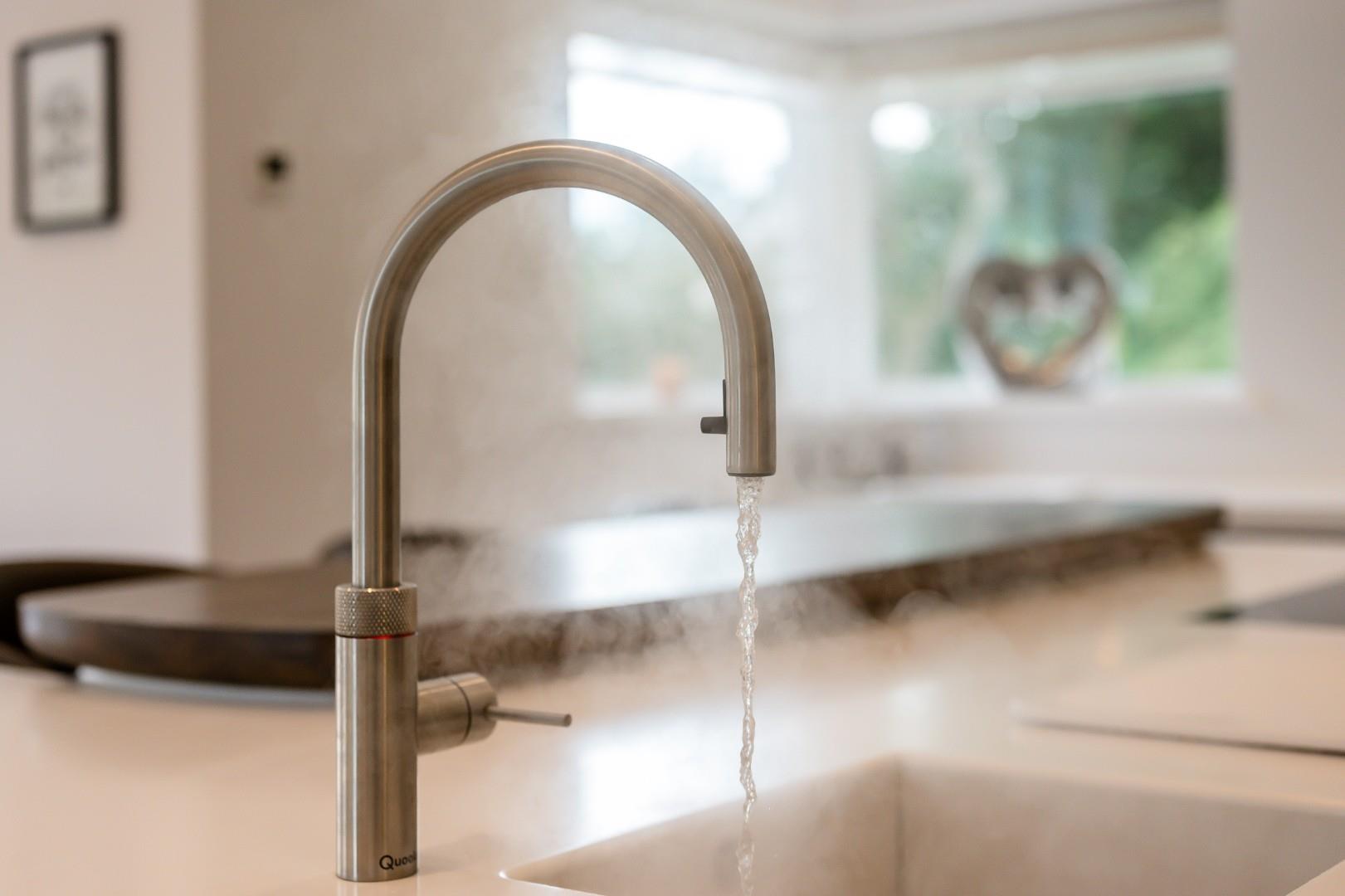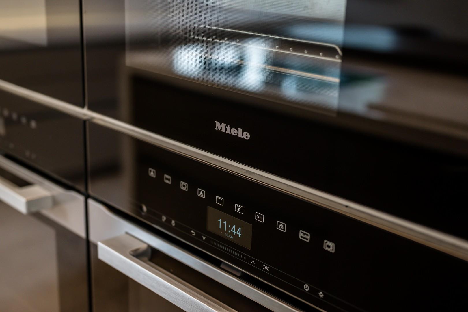 A selection of Miele appliances includes two conventional ovens with warming drawers, a microwave, steam oven, full-length fridge and dishwasher. Additional highlights include a Bora induction hob with built-in downdraft extractor, a Quooker tap with instant boiling, chilled and sparkling water, a Liebherr full-length freezer, and twin Monogram wine fridges.
