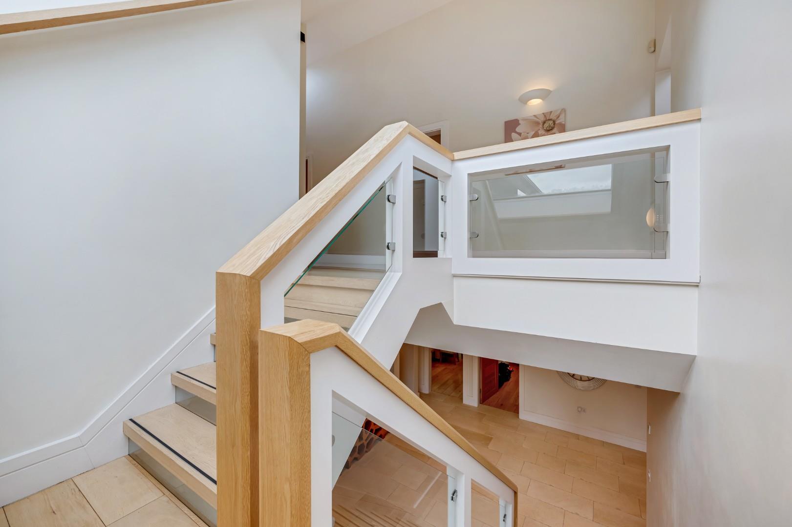 The main parking area is large enough for a whole fleet of cars, and the home welcomes you inside through a supersize bespoke solid oak door with glass surrounds, giving you the first impression of the grand proportions found throughout. A handy porch leads through to the central reception hall where you immediately notice the stylish oak and glass staircase, plus the abundance of natural light pouring in through the huge skylight window and glass wall at the rear.