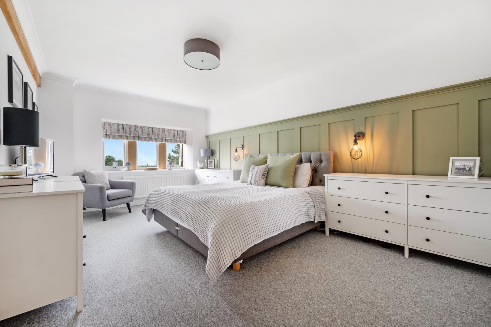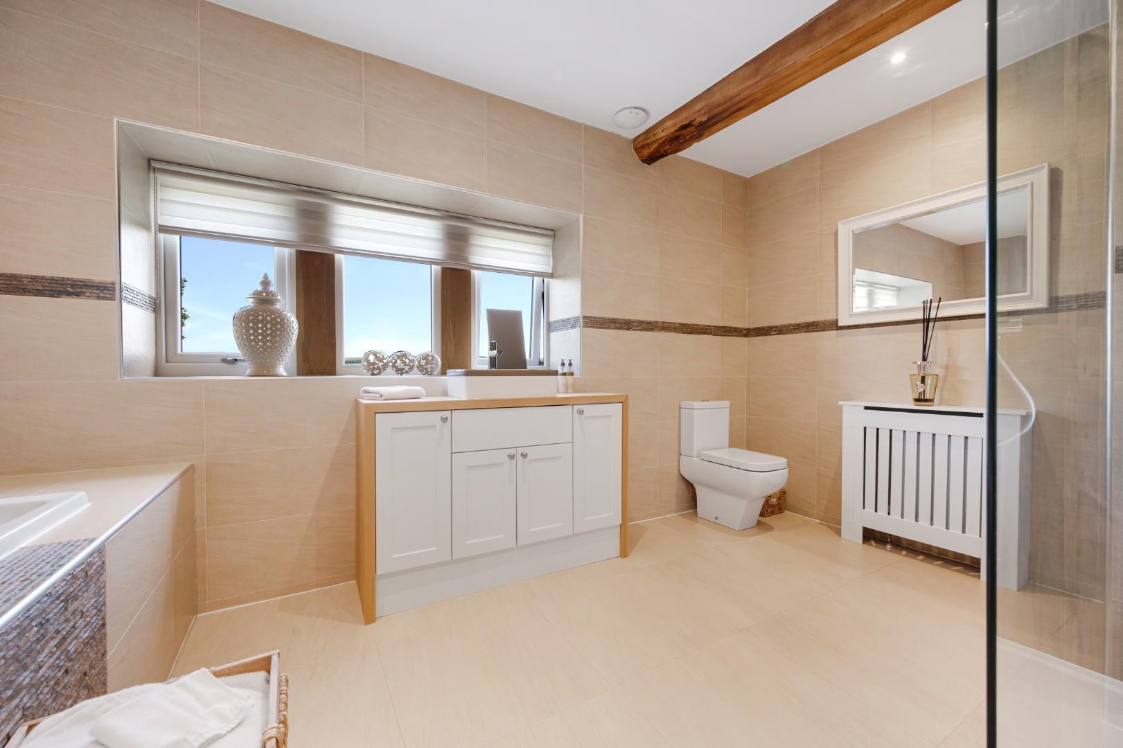 The master bedroom benefits from a panelling in keeping with the traditional country aesthetic, and its large en-suite comprises a his and hers sink unit with integral storage and WC, a large oak-framed wall mirror with mood lighting, and a large walk-in shower with feature tiled surrounds. Stroll across the landing and the substantial dressing room is fitted with a comprehensive range of contemporary wardrobes, drawers and dressers.