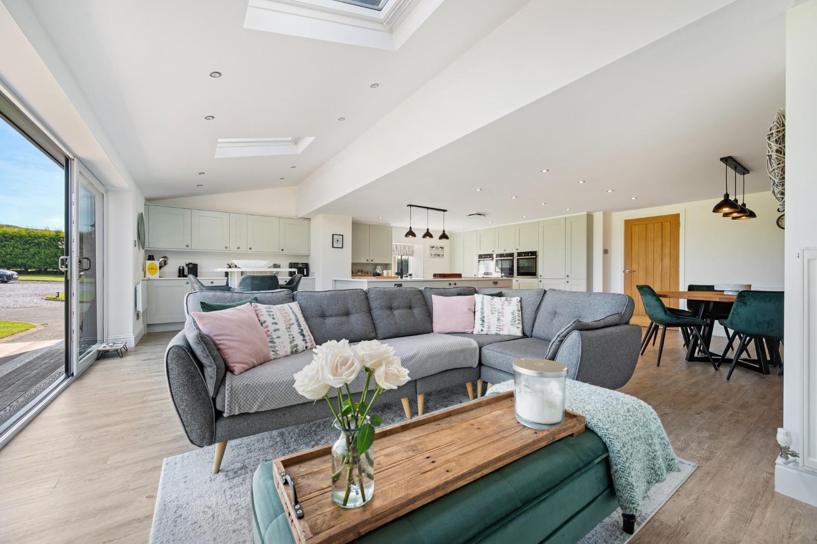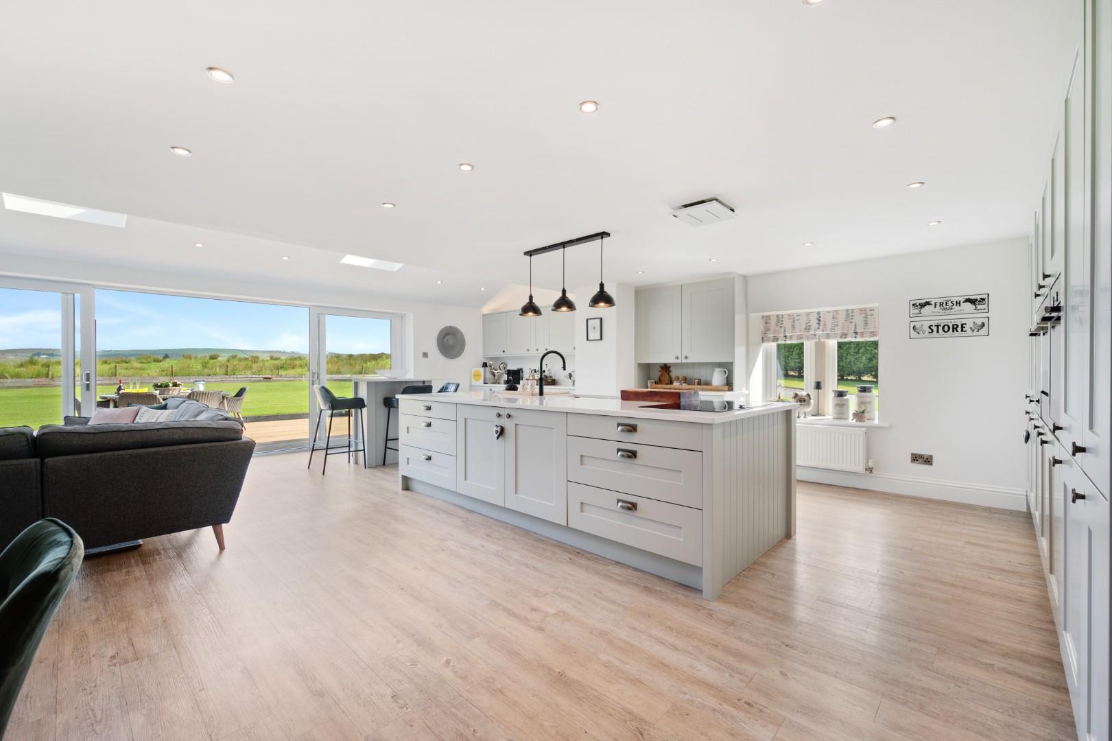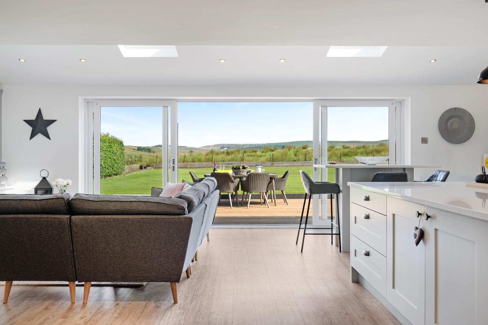 Living Space - One of the standout aspects of this all-round impressive property is the large open plan living space where you can enjoy panoramic rural views framed by the wide, glass sliding doors year-round, from blue-sky summer days to watching the snow fall on the hills in winter, there aren't many properties with a view like this! The extension with Velux's ensures a fresh, bright and airy feel.