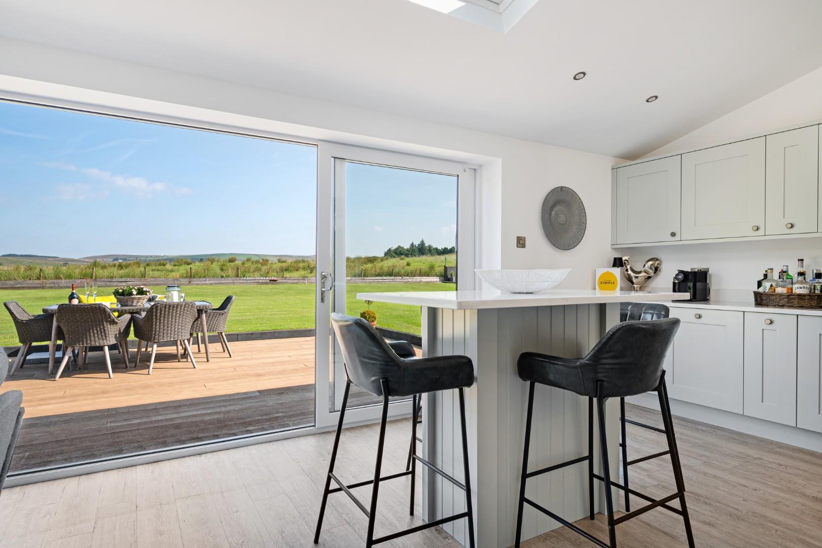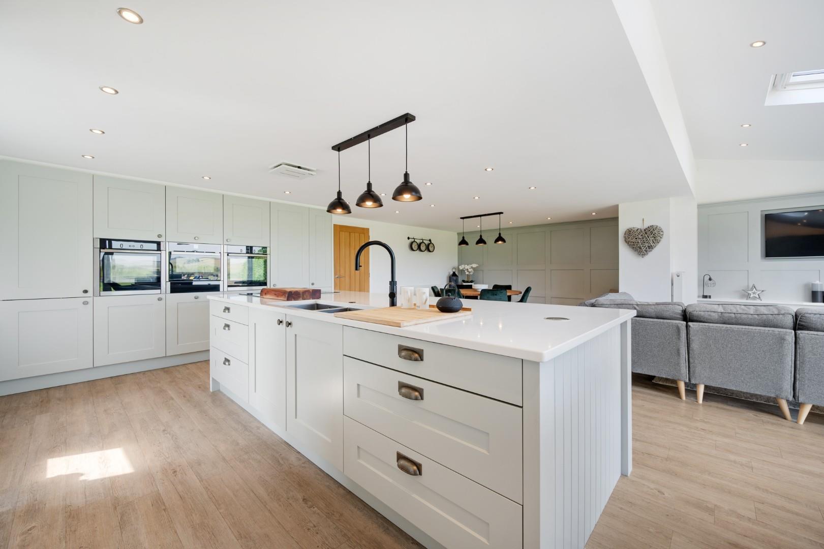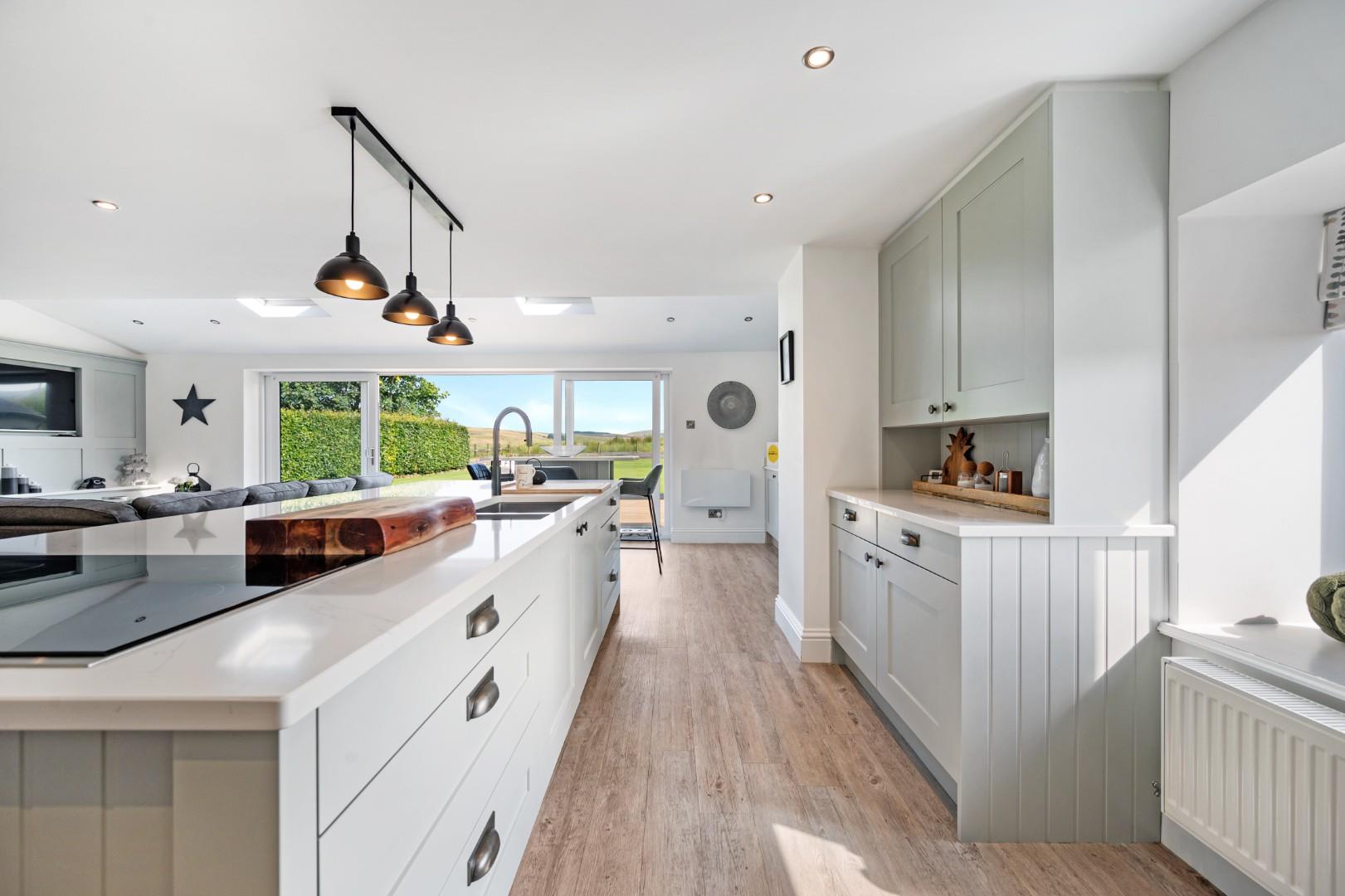 Living Space - One of the standout aspects of this all-round impressive property is the large open plan living space where you can enjoy panoramic rural views framed by the wide, glass sliding doors year-round, from blue-sky summer days to watching the snow fall on the hills in winter, there aren't many properties with a view like this! The extension with Velux's ensures a fresh, bright and airy feel.