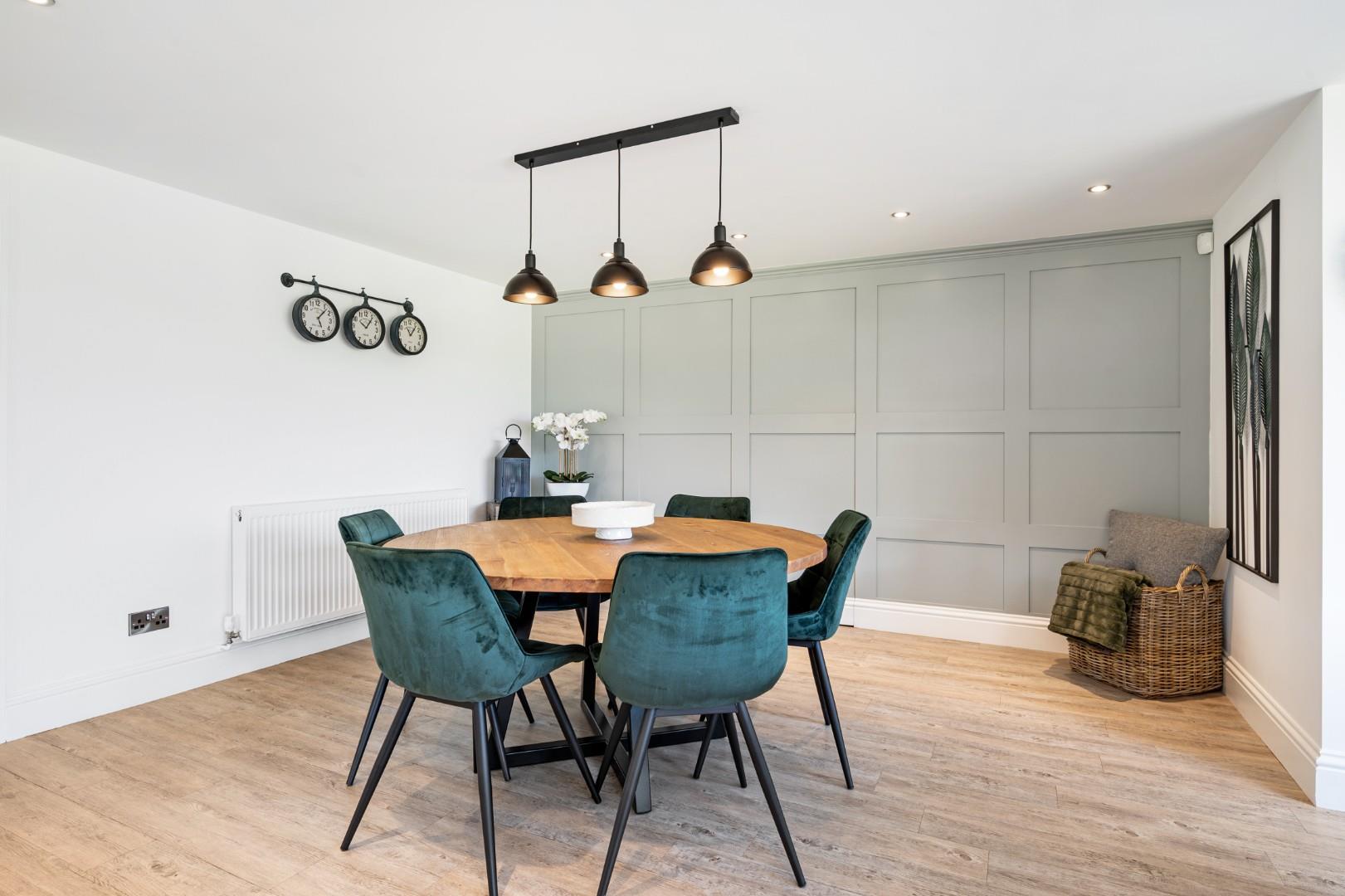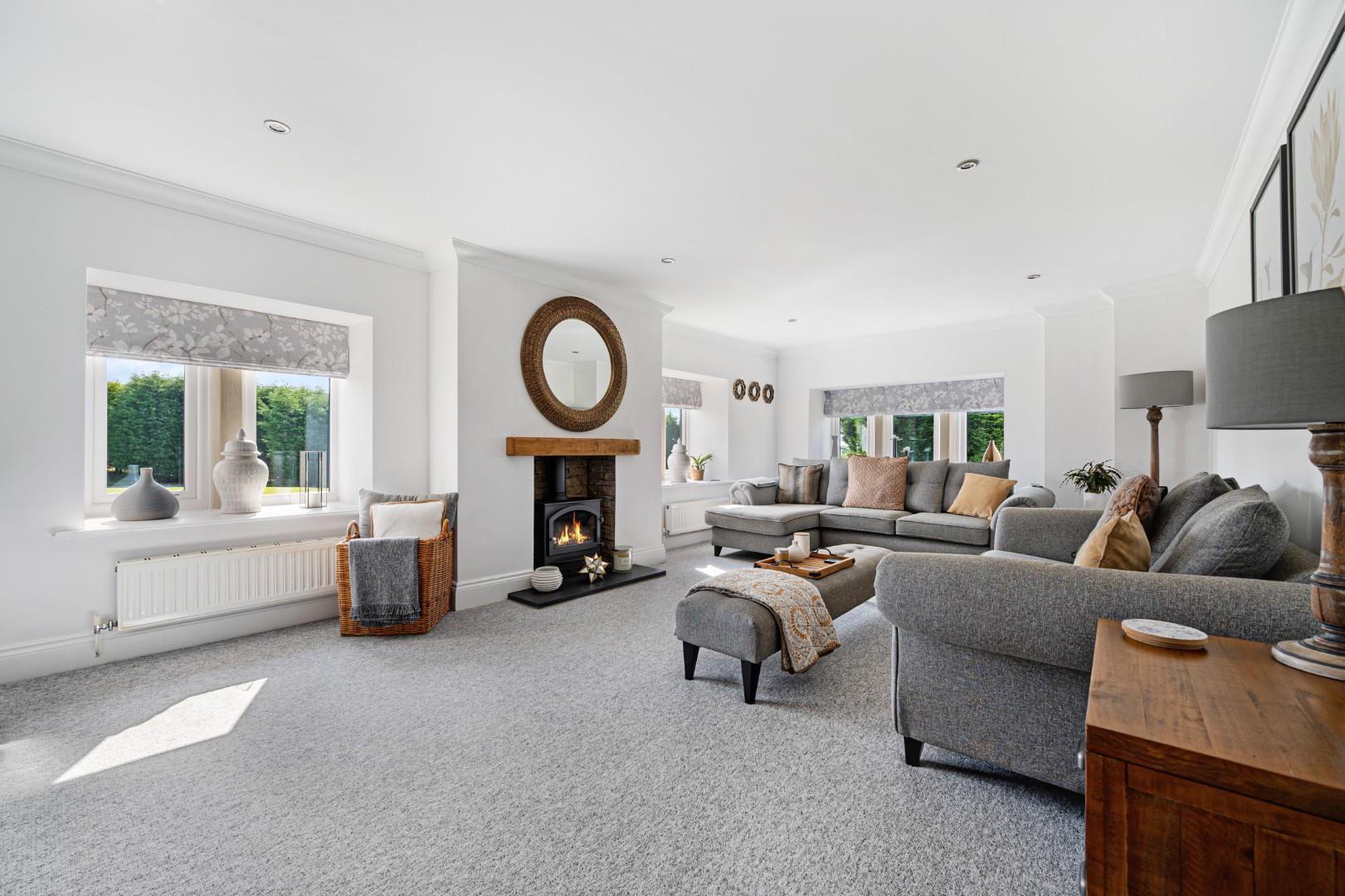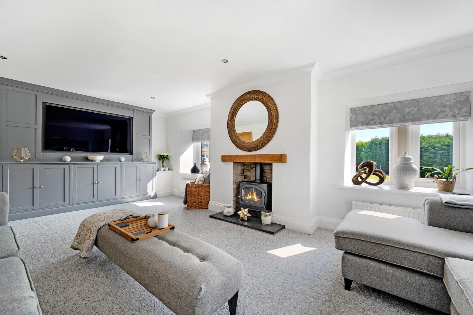 The central hallway accessed via the front door gives access to two reception rooms situated at the front - plenty of living space for the whole family! One of them is a lovely main lounge with a traditional chimney breast in which sits a gas-powered burner that looks like a rustic log burner! The panelled media wall gives a subtle contrast to the fresh white walls while adding extra storage, and the abundance of windows continues the fresh, bright and airy vibe.