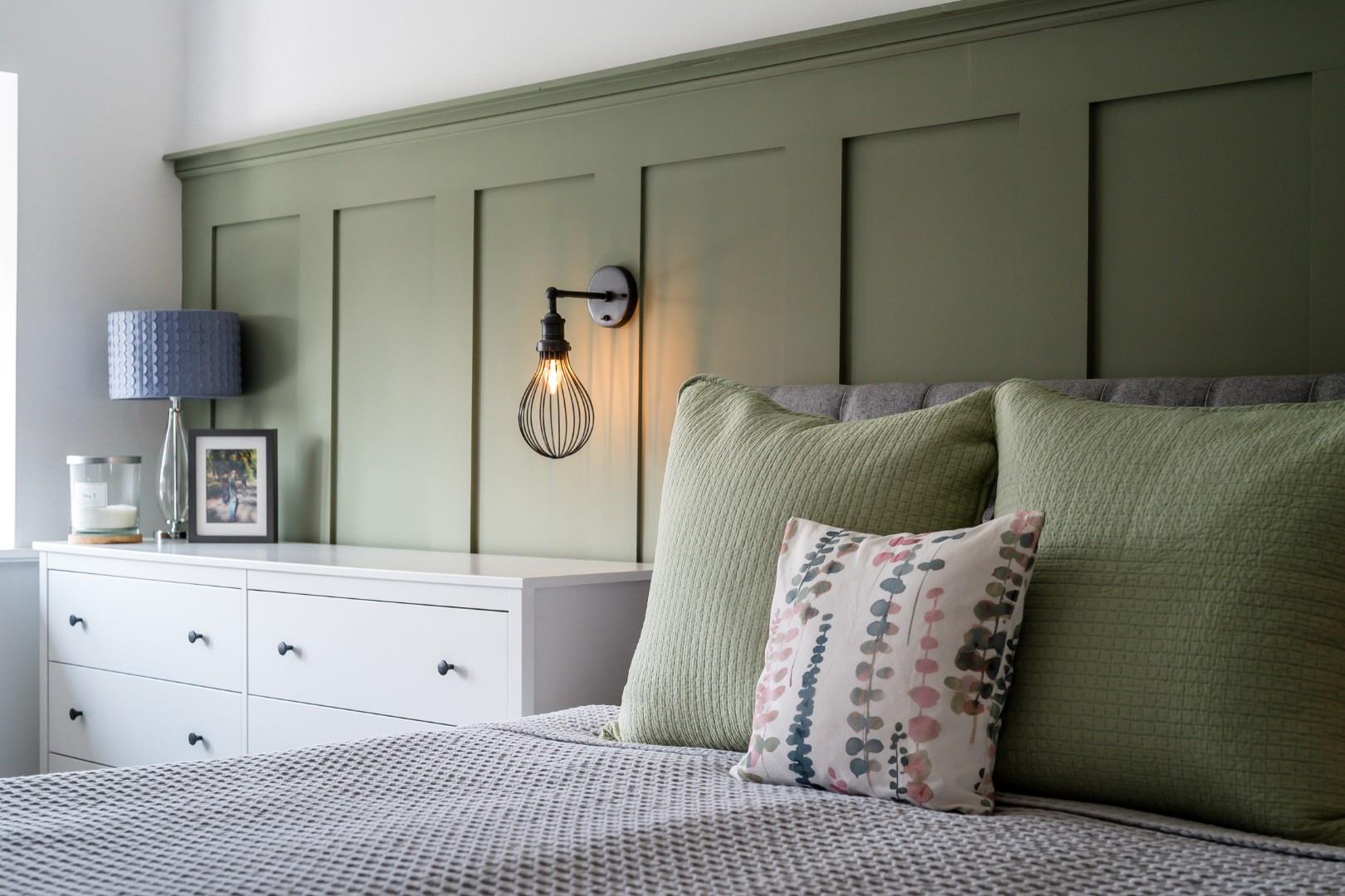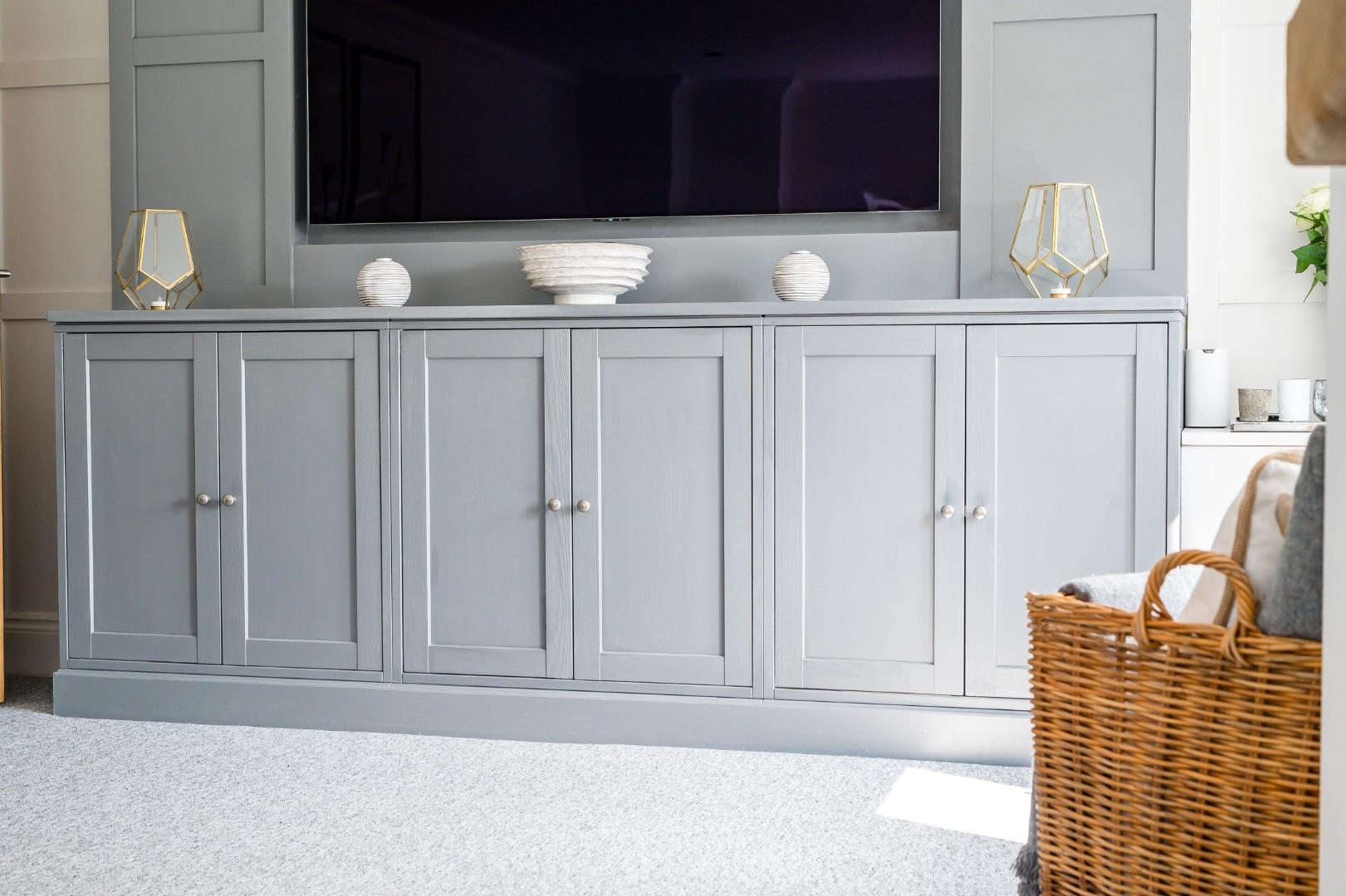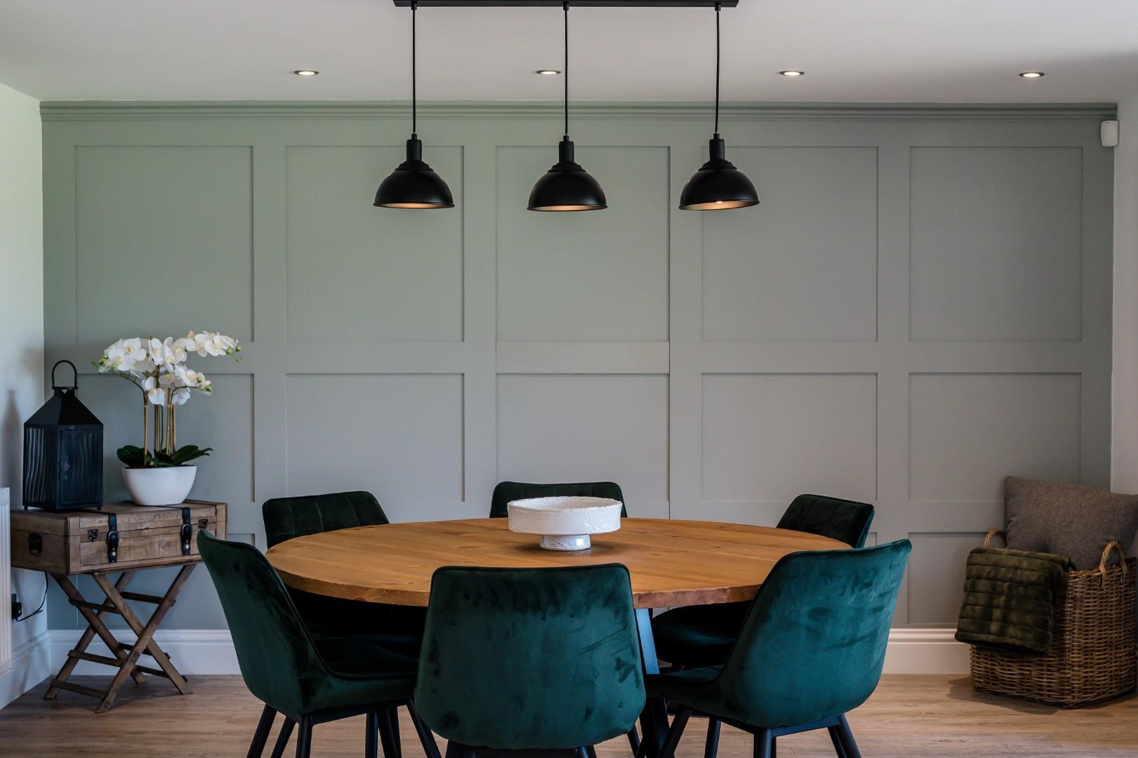 The central hallway accessed via the front door gives access to two reception rooms situated at the front - plenty of living space for the whole family! One of them is a lovely main lounge with a traditional chimney breast in which sits a gas-powered burner that looks like a rustic log burner! The panelled media wall gives a subtle contrast to the fresh white walls while adding extra storage, and the abundance of windows continues the fresh, bright and airy vibe.