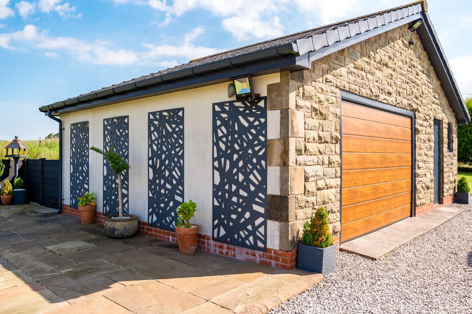Outside Space - Externally the property boasts a generous one-acre plot set behind mature trees and conifers and two sets of electric gates, with a long drive, detached double garage, extensive manicured lawns and a Millboard terrace with remarkable, uninterrupted views of the rolling countryside.