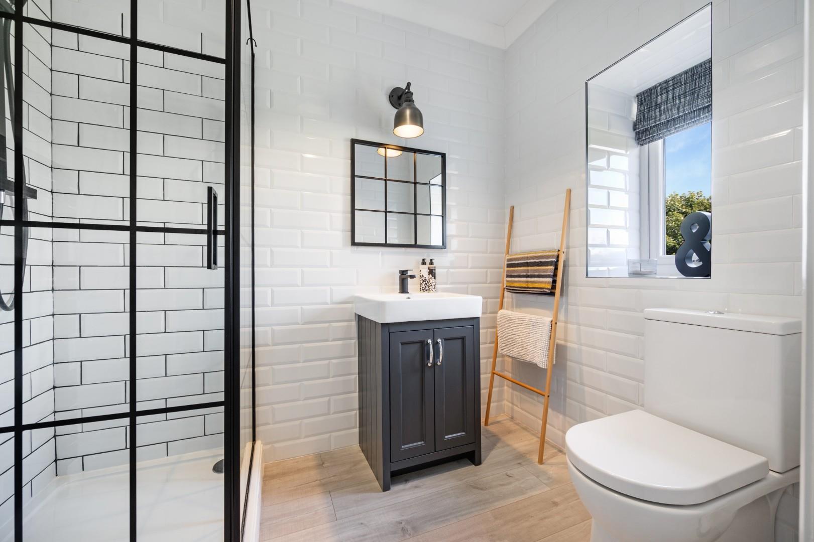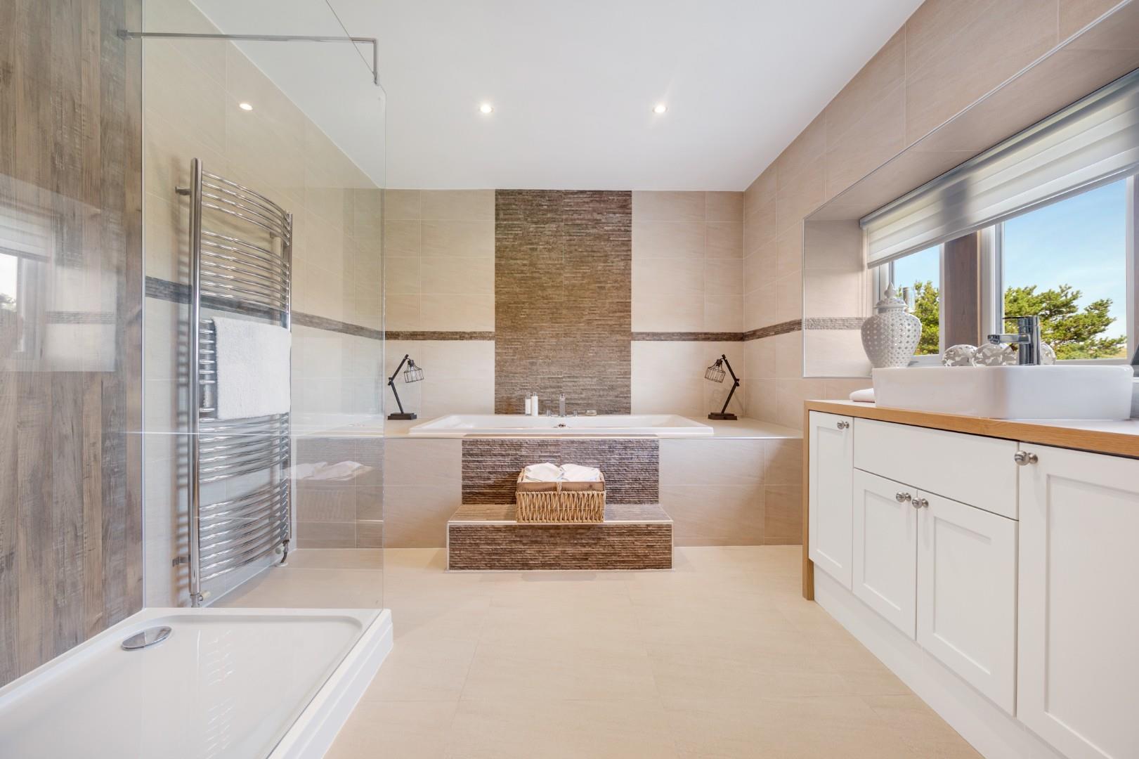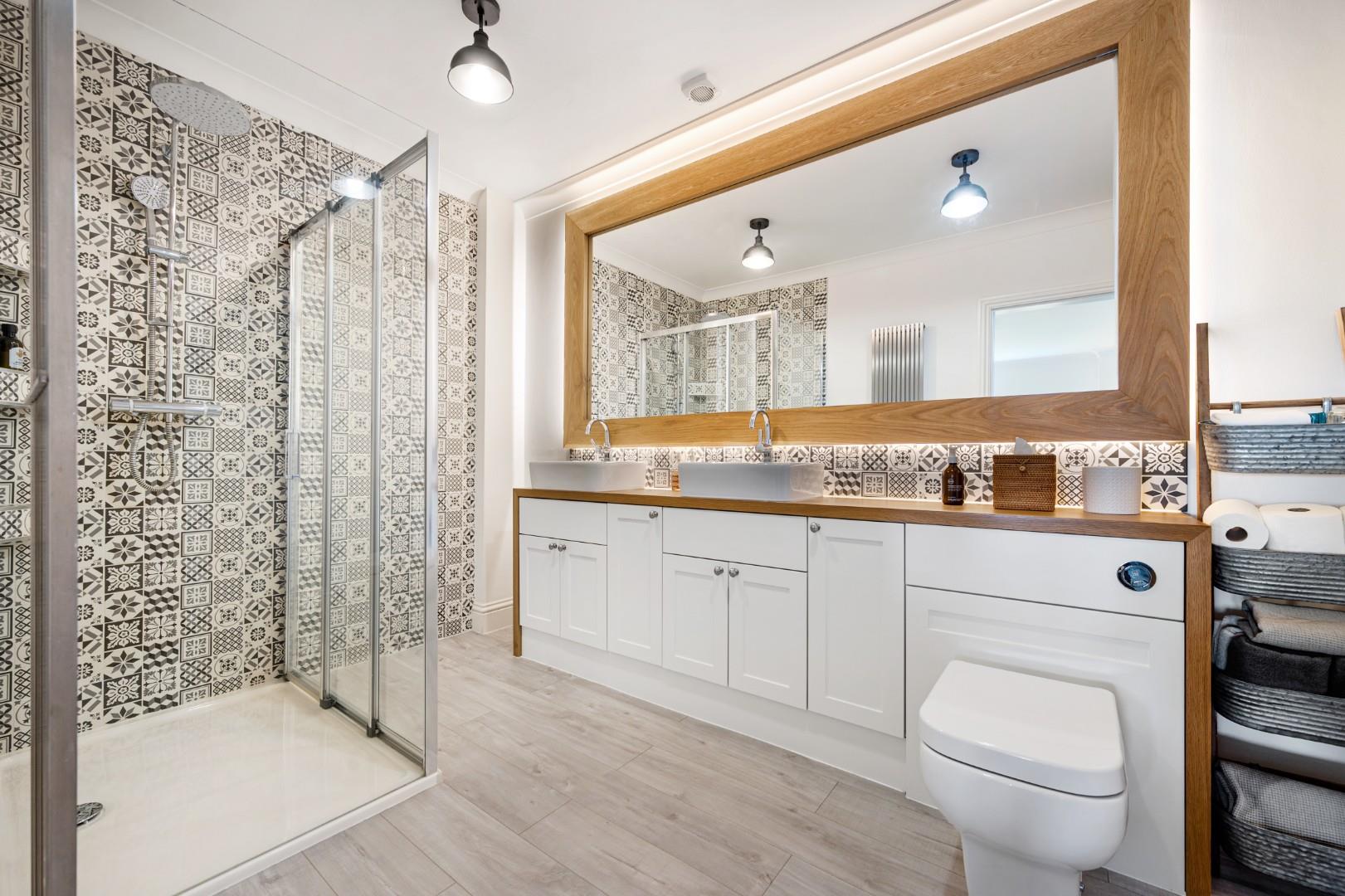 The main bathroom is located on the first floor, with its enormous size adding to the feeling of opulence, and the four-piece suite features a substantial, tiled-in jacuzzi bath, walk-in shower, storage unit with wash basin, and WC. The second bedroom benefits from a trendy three-piece en-suite as well, and the third bedroom, also situated on the first floor, is a generous double.