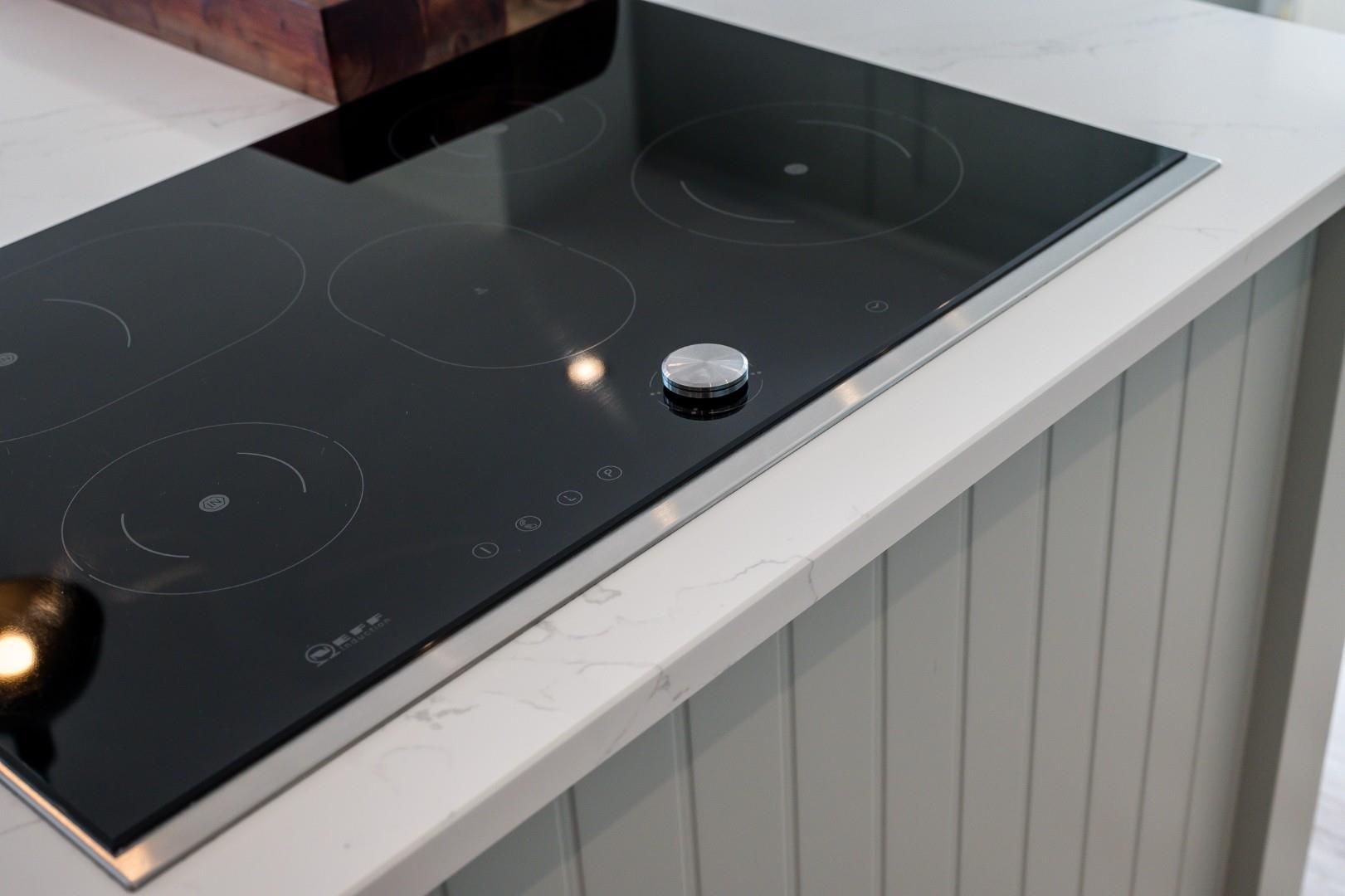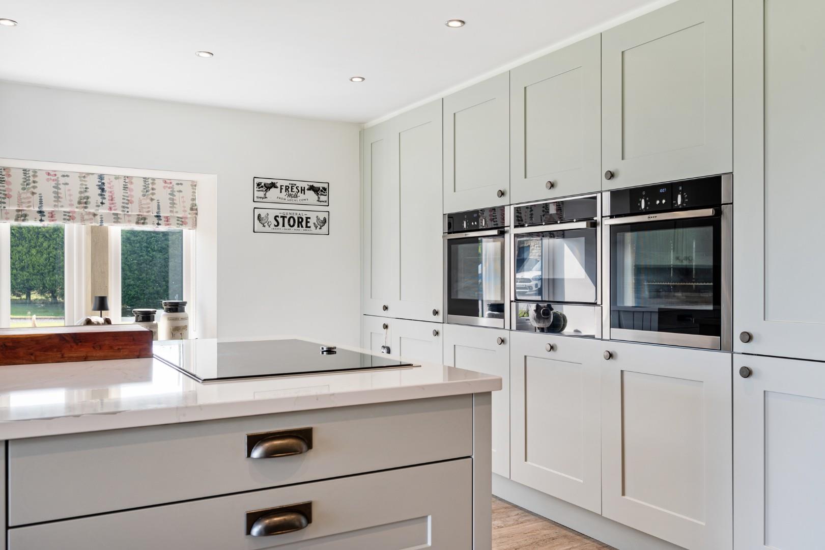 The kitchen occupies a large area with a superb amount of circulation and storage space to cater to the demands of modern family life, ideal for both everyday practicality and when hosting family and friends. The island and gin table with Carrera Quartz worktop make it a great social space, and the contemporary design is akin to that featured in a stylish interior design mag, with a traditional country feel complementing modern minimalism. In the light grey shaker style cabinetry are a variety of quality integrated appliances, with Neff cooking appliances including two ovens, a microwave and warming drawer, and five-plate induction hob with ceiling extractor, in addition to a Quooker tap with inset sink, dishwasher, and a full-length fridge and freezer.