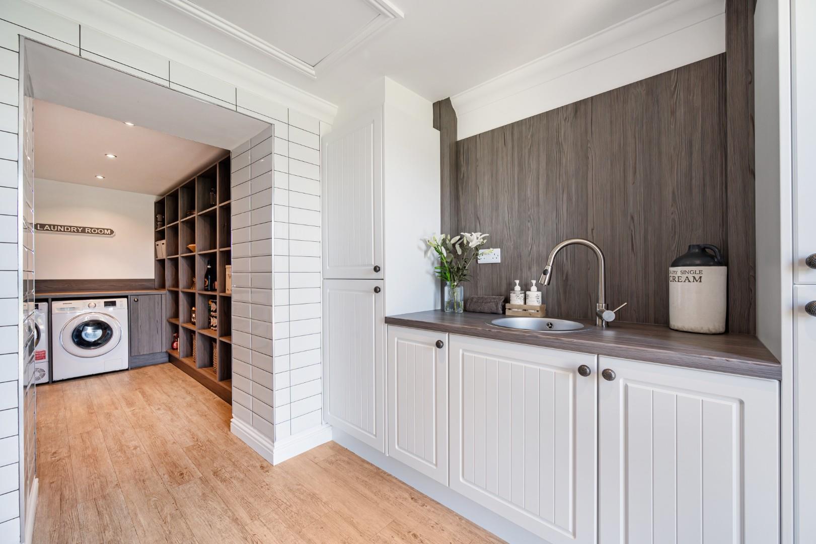 A secret door hidden within the panelled feature wall in the dining area leads to more practicality in the form of a spacious utility/laundry and boot room. Like the rest of the home this space is also found in immaculate condition, with plumbing for the washer/dryer, an extra sink, and a comprehensive range of fitted shelving and additional cupboard space.