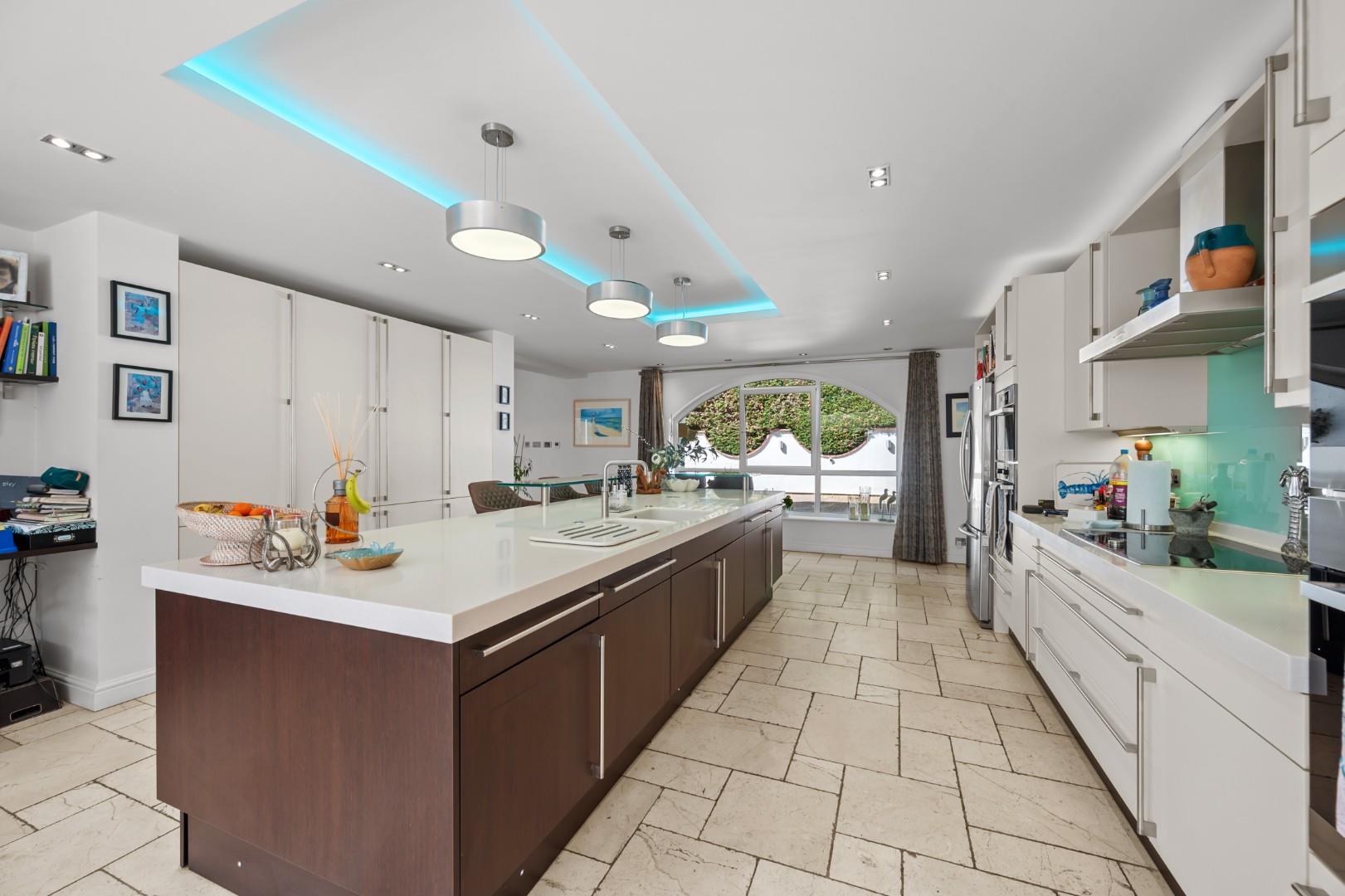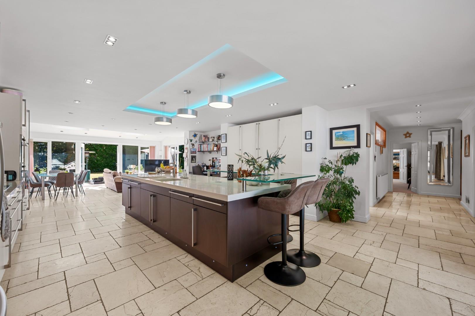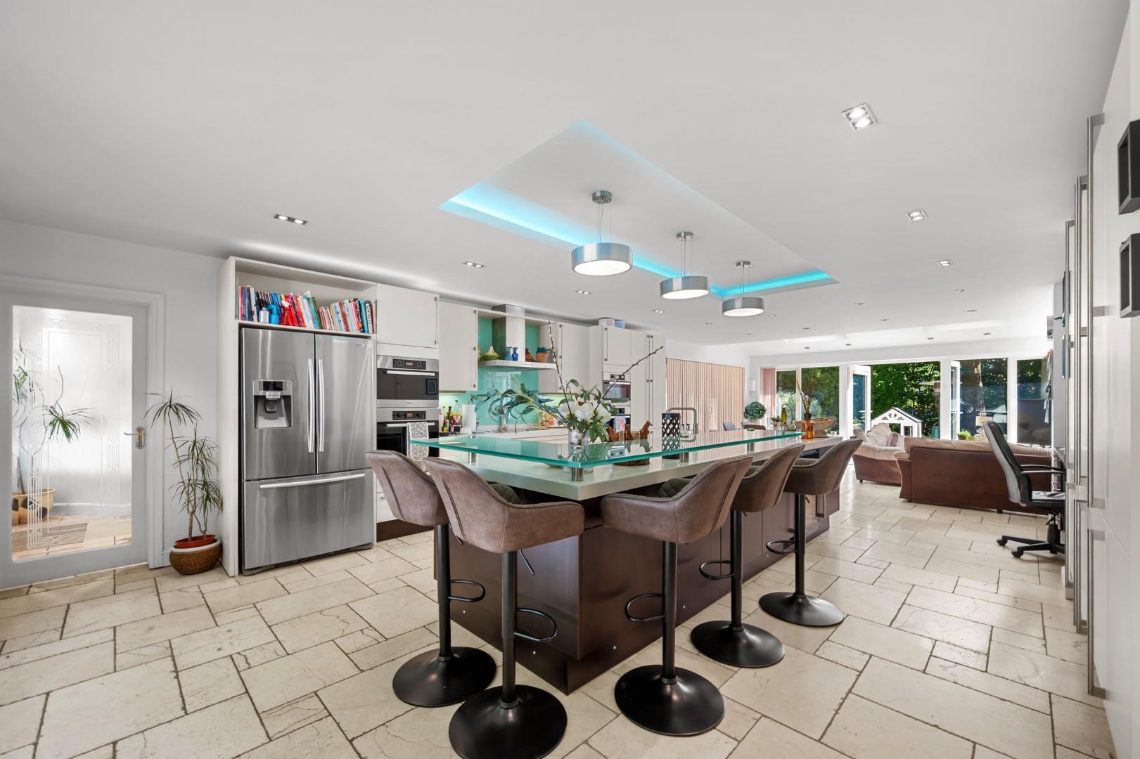 The heart of the home is arguably the fantastic open plan living area linked to the kitchen, which is multifunctional and exceptionally spacious, adding superb practicality to satisfy the demands of modern family life. Within the two-tone Siematic kitchen, the huge island with a tastefully elevated glass breakfast bar, and a vast amount of Corian worktop space make this a particularly attractive space for casual socialising. Whether it's over your favourite bottle with friends on a Friday night, or making pancakes with the kids on Sunday morning, it's an excellent addition to an already wonderful home.