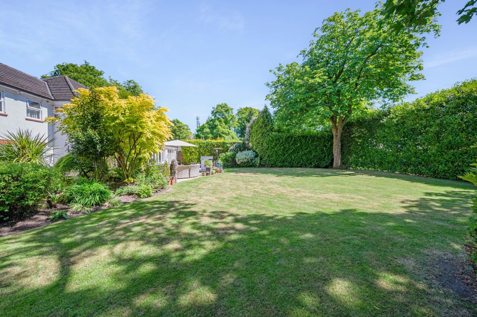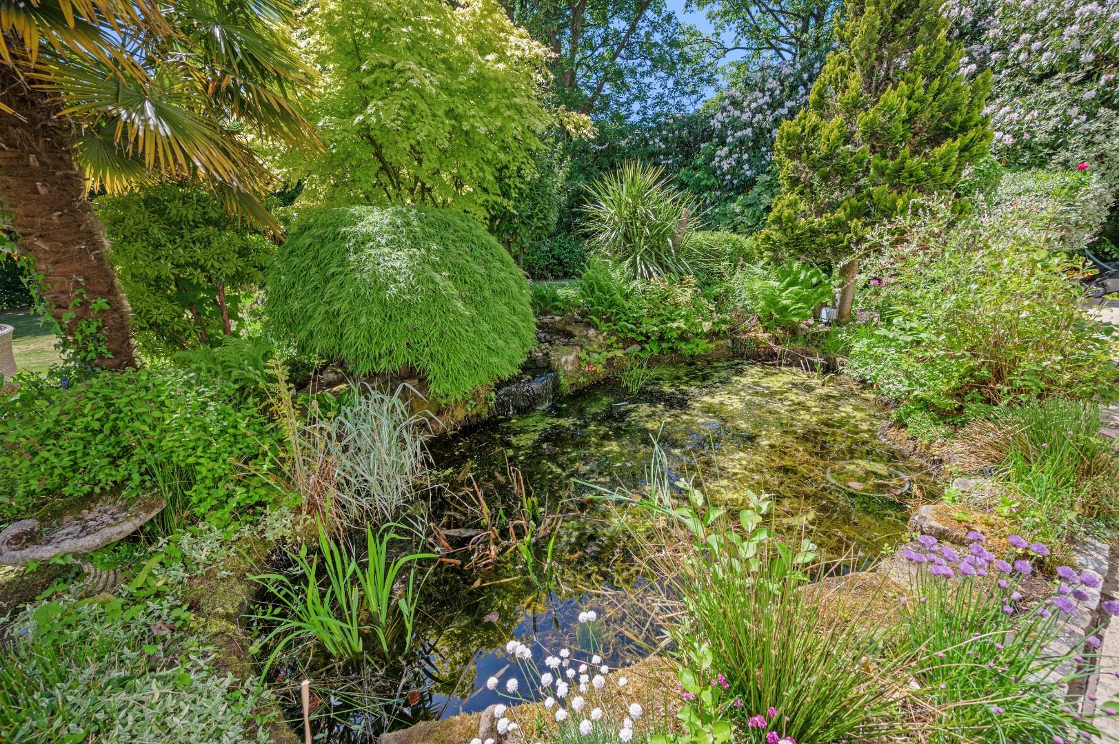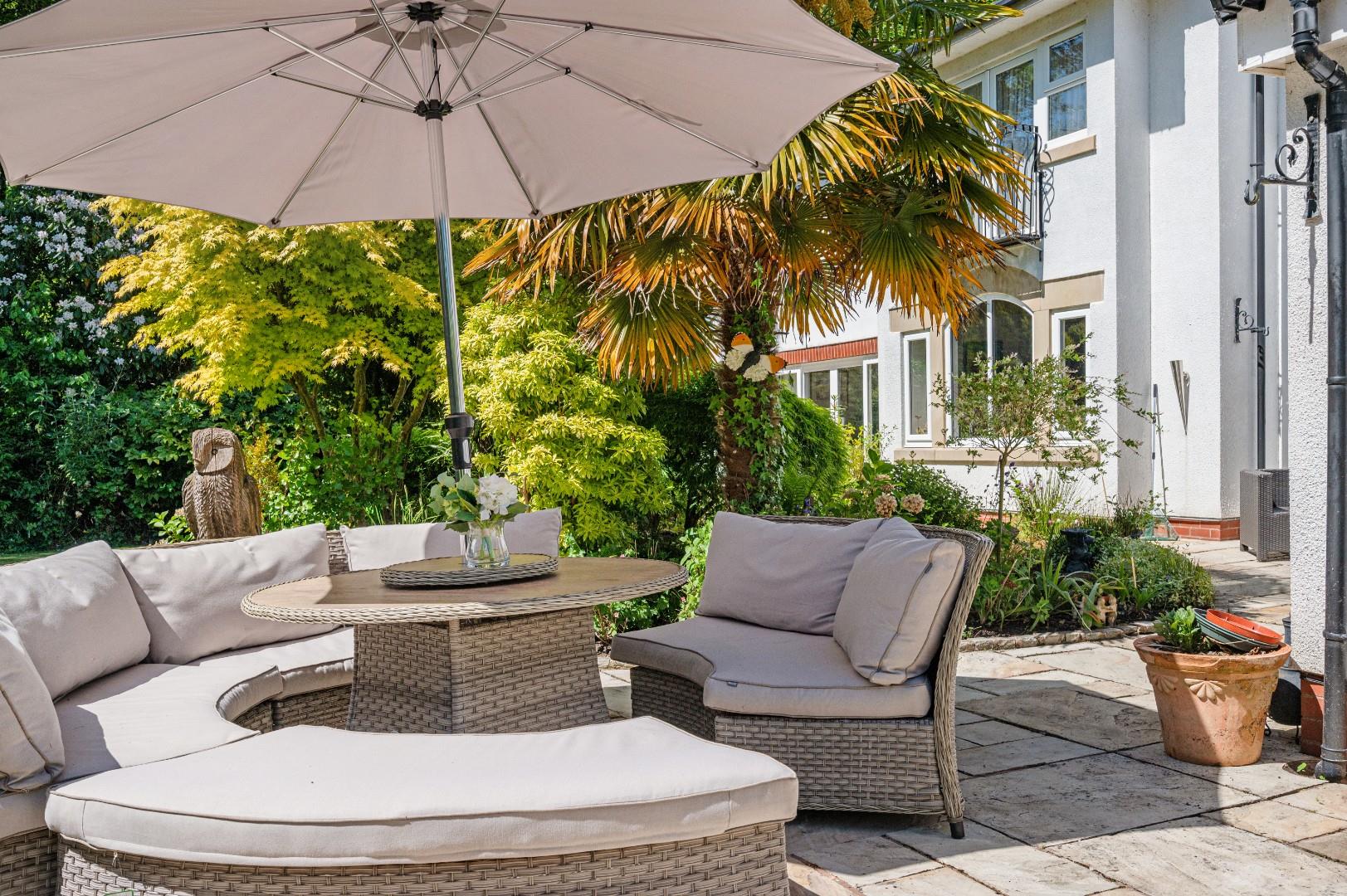 To the rear, the mature, sunny, south-facing garden is a tranquil green haven where all one can hear is the soundtrack of the local birdsong and the subtle trickle of the waterfall feature in the wildlife pond. From the garden lounge, the French doors open onto a large sun-soaked patio that's large enough and perfect for both outside dining, lounging in the sun, and socialising with family and friends. A selection of mature plants and small trees surround the pond and rockery, the huge lawn gives heaps of space for the little ones to play safely, and the super high, mature hedgerows ensure complete privacy all year round.