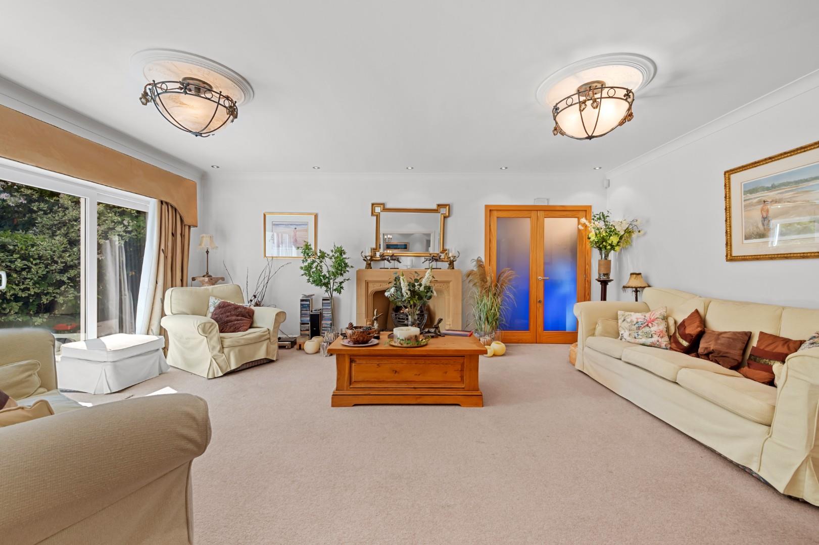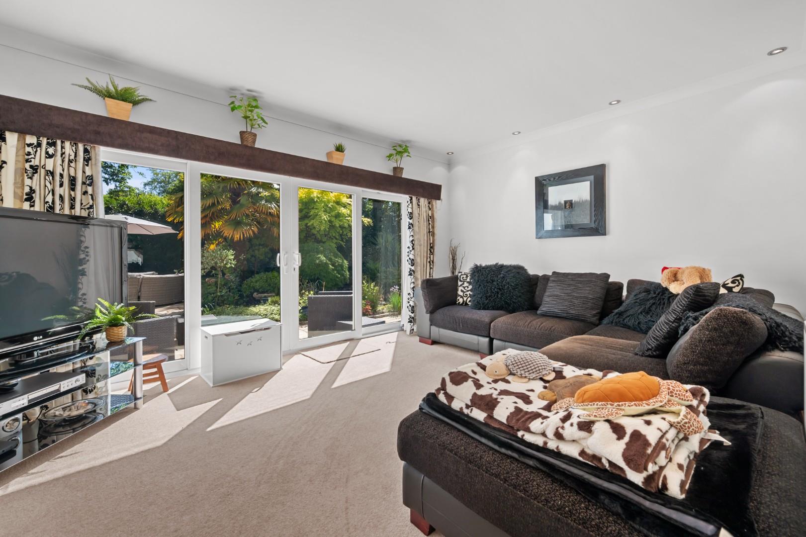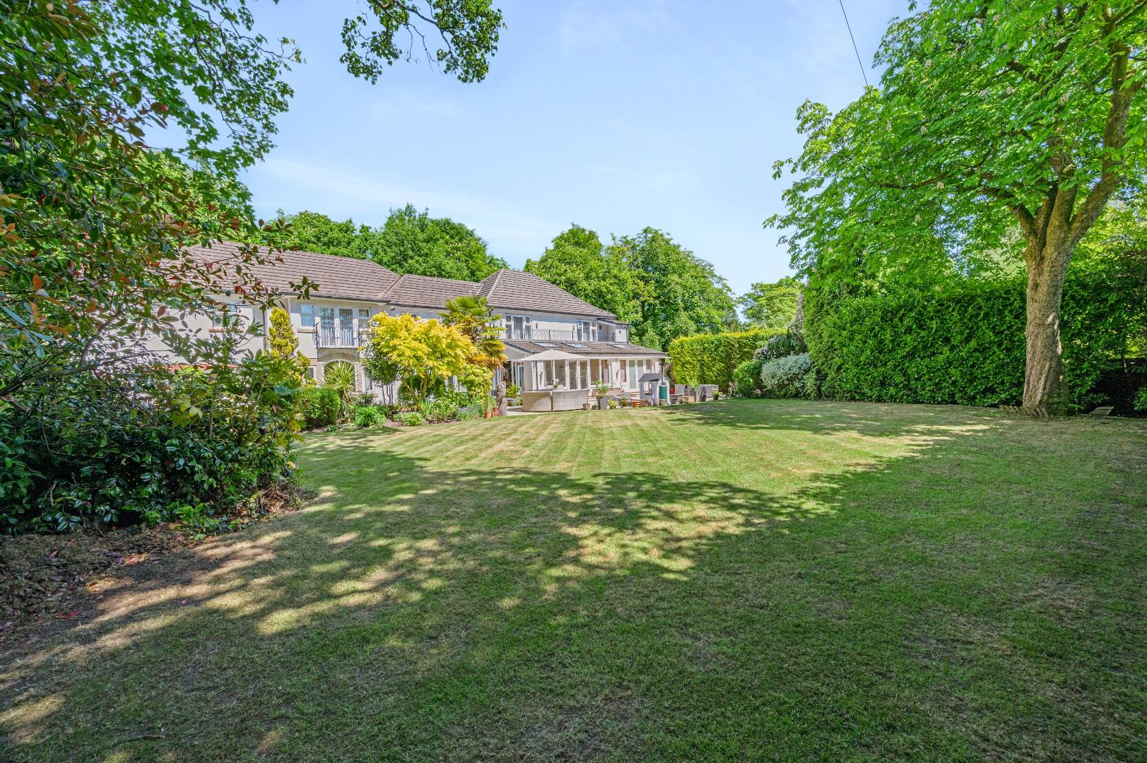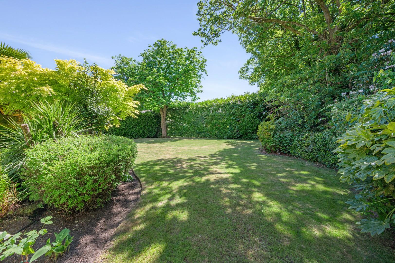 To the rear, the mature, sunny, south-facing garden is a tranquil green haven where all one can hear is the soundtrack of the local birdsong and the subtle trickle of the waterfall feature in the wildlife pond. From the garden lounge, the French doors open onto a large sun-soaked patio that's large enough and perfect for both outside dining, lounging in the sun, and socialising with family and friends. A selection of mature plants and small trees surround the pond and rockery, the huge lawn gives heaps of space for the little ones to play safely, and the super high, mature hedgerows ensure complete privacy all year round.