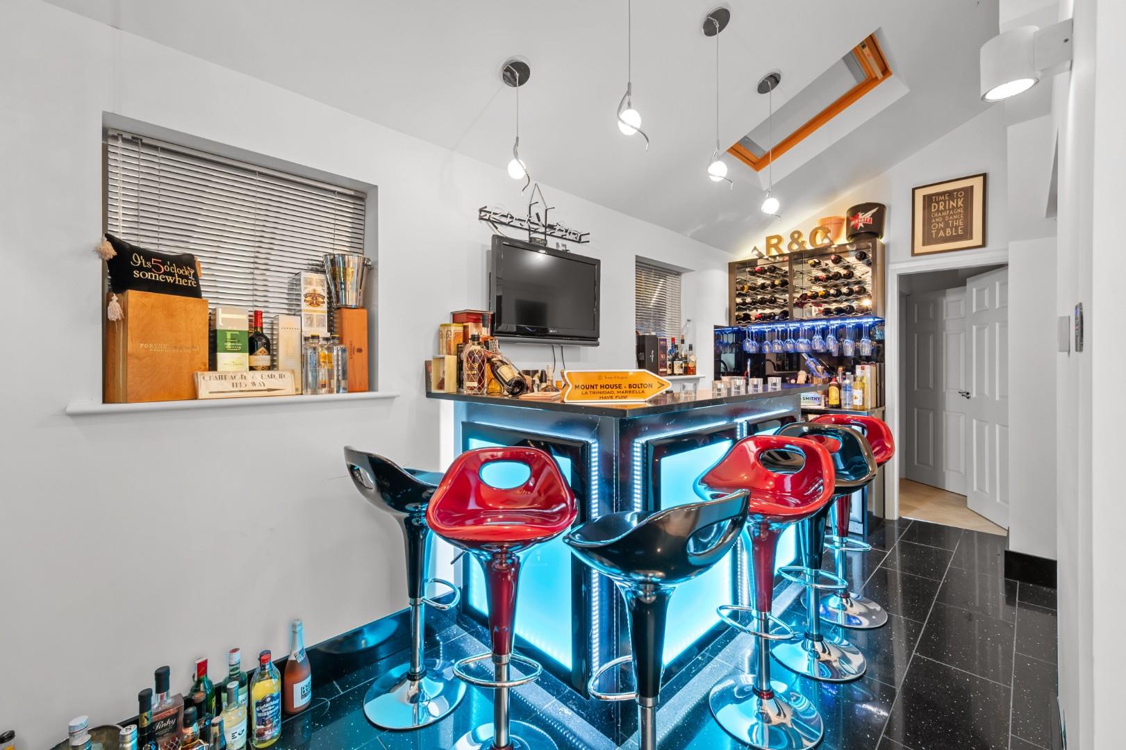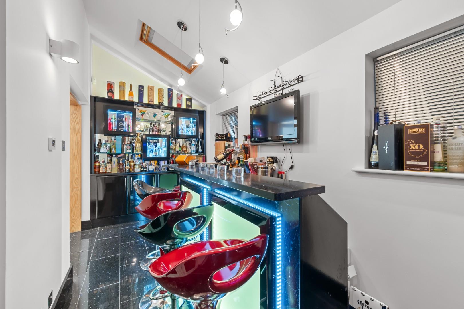 On the opposite side of the ground floor is the fun cocktail bar off the lounge, which is equipped with a mood lighting system, bar, fridges, and a large drinks cabinet/wall. The vaulted Velux ceiling here gives it unique character and adds to the ambience.