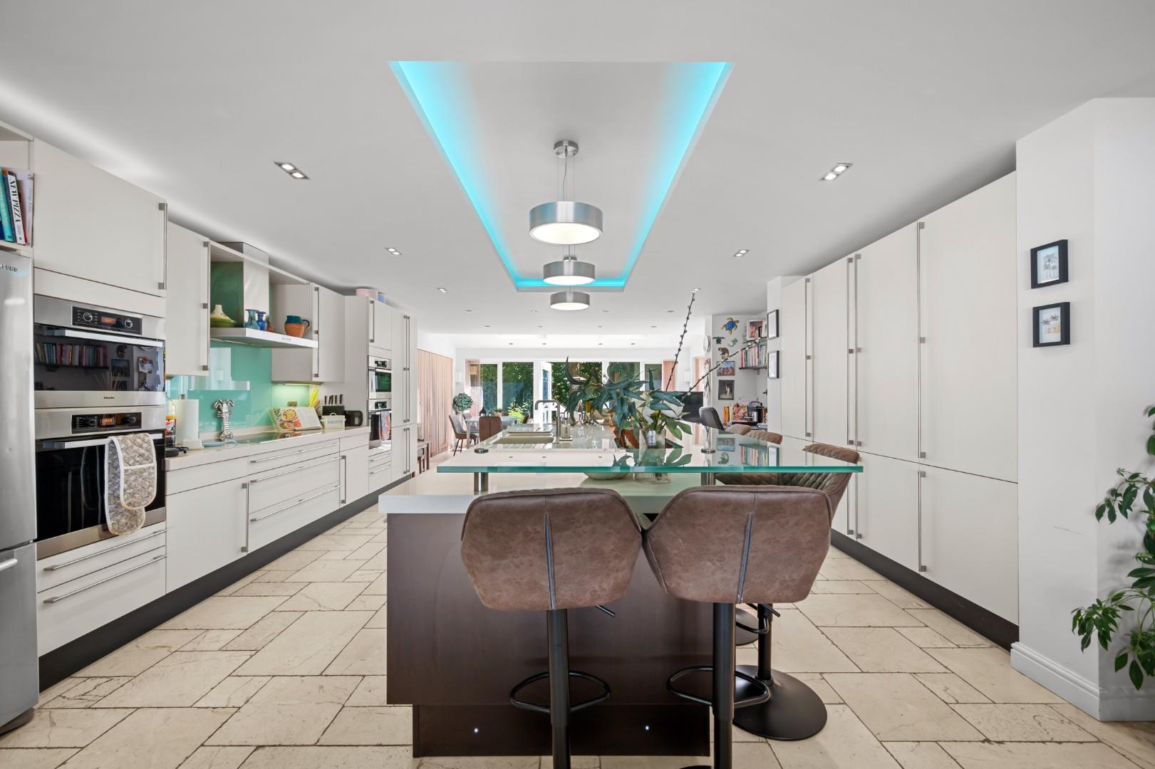 Also within the open plan living area is the garden/sun lounge and the breakfast/informal dining area. Both these spaces are flooded with natural light and have a stylish modern design, owing to the part-vaulted ceiling, Velux windows, and extensive use of glass that again provides the desirable indoor-outdoor lifestyle on sunny days, where the garden and the house blend seamlessly.