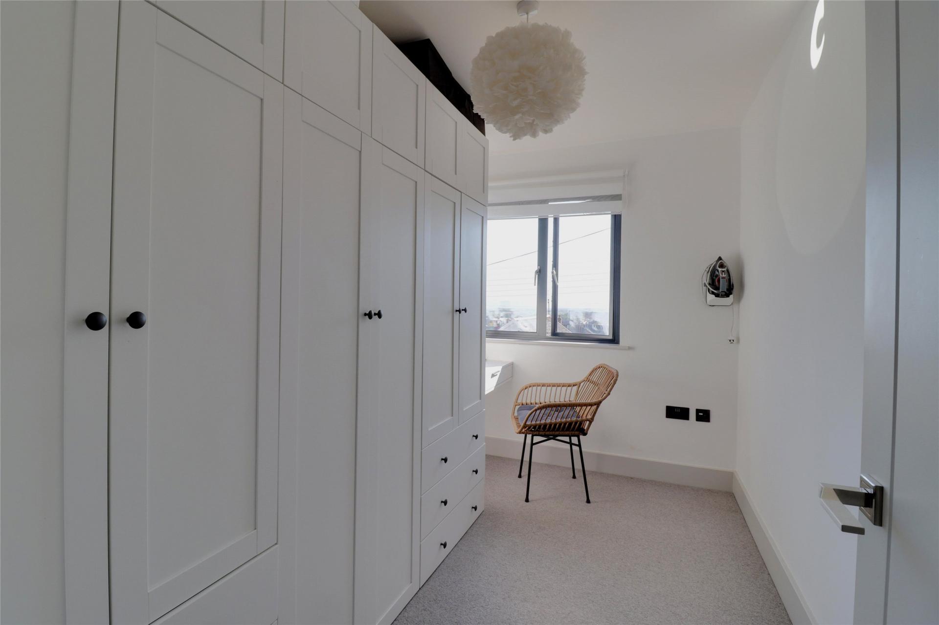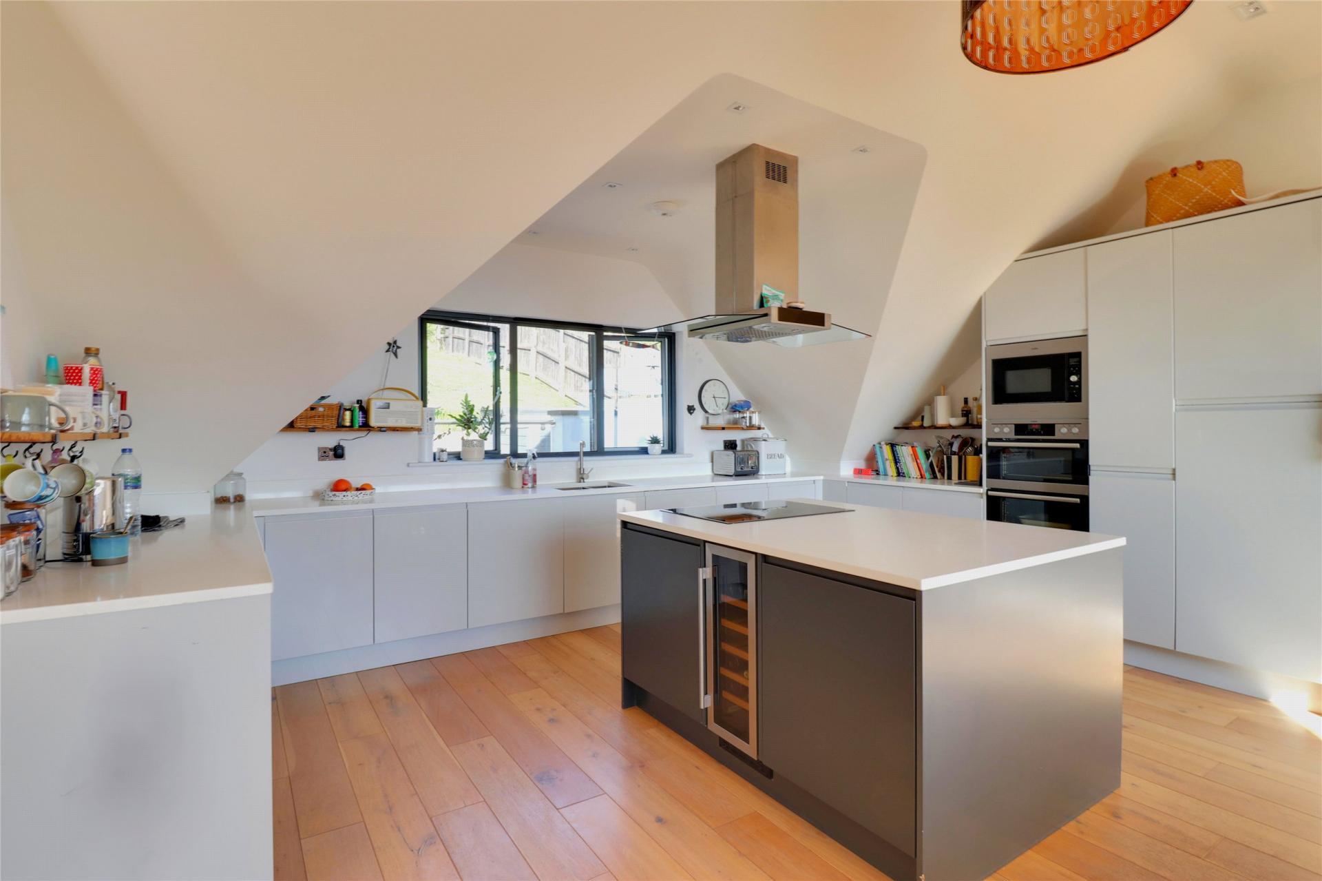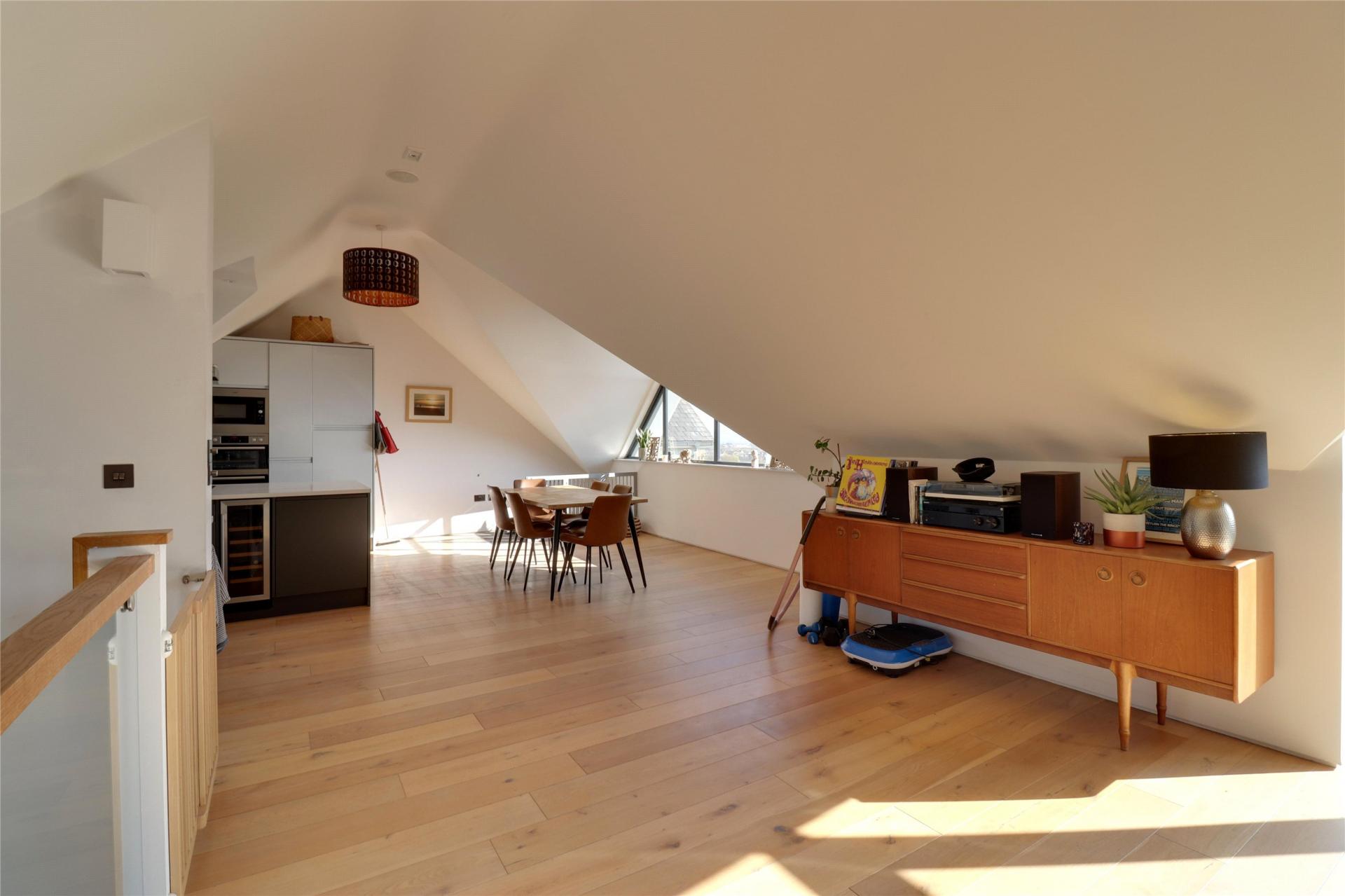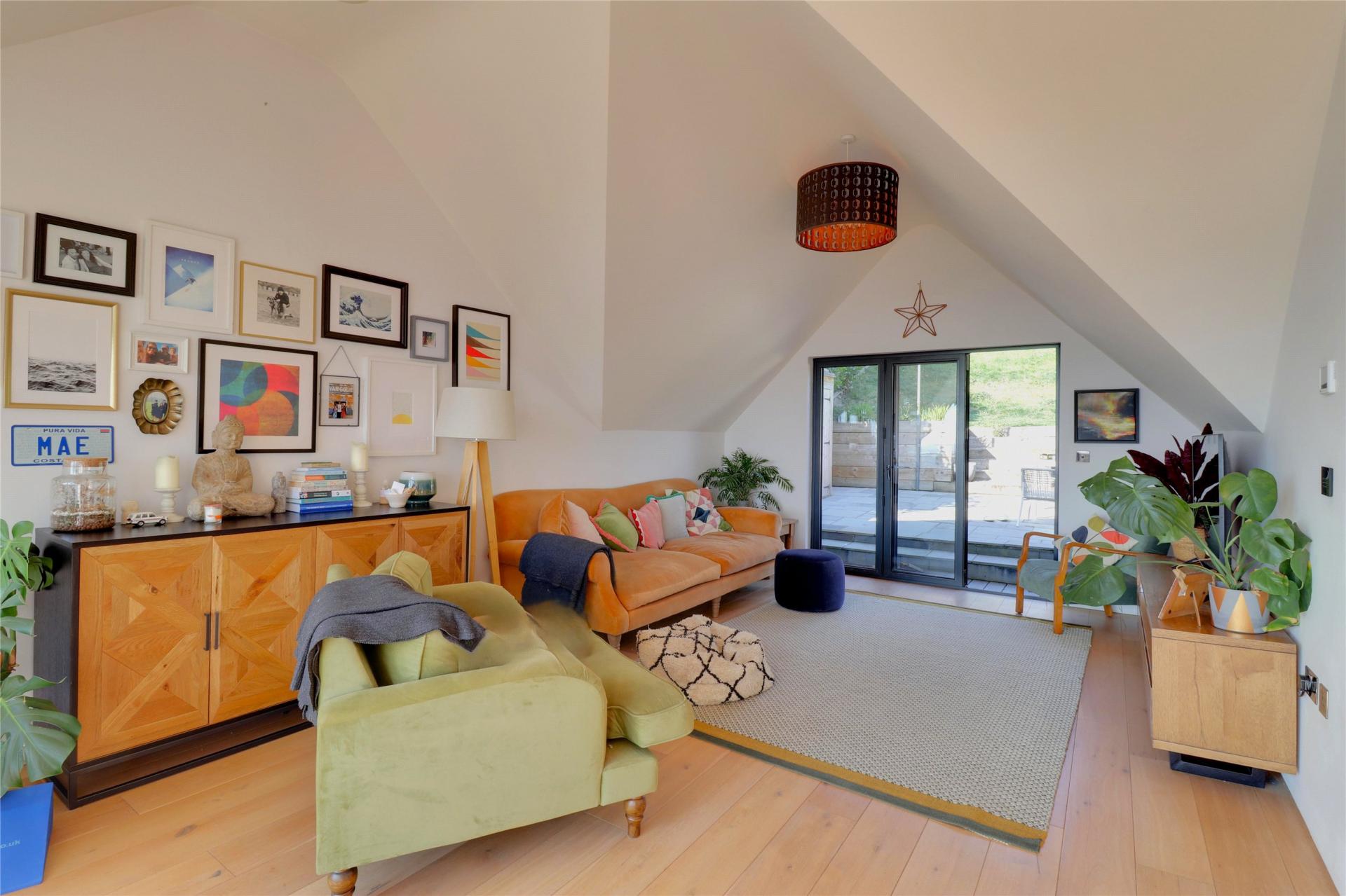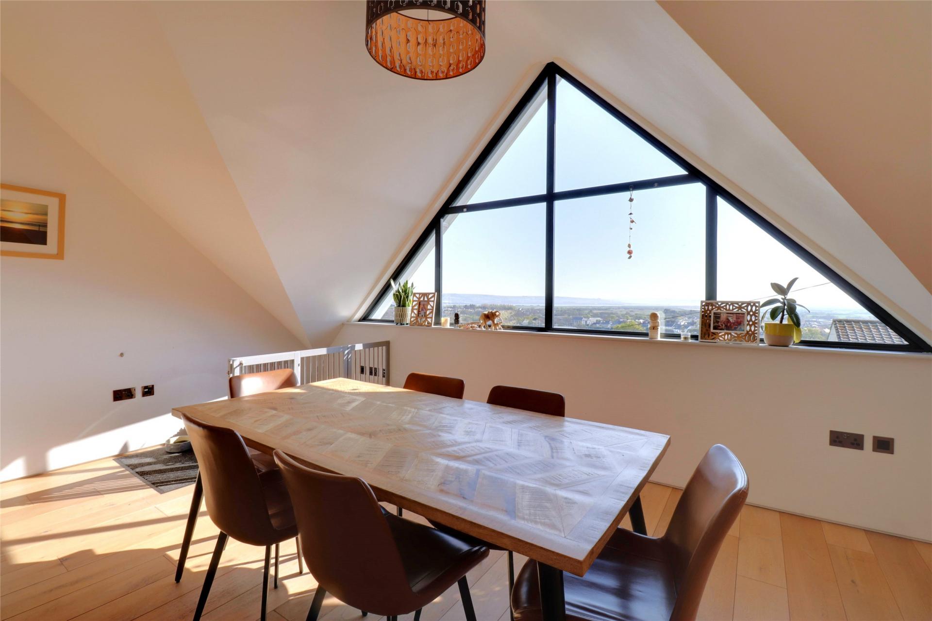 The upper floor is the true heart of the home and features a spectacular open-plan living area, thoughtfully designed to maximise natural light and capture the outstanding views. Large triangular picture windows and expansive bi-folding doors frame the stunning outlook and open directly onto the rear garden, creating a seamless transition between indoor and outdoor living. This elevated position allows for uninterrupted vistas, making it an exceptional space for entertaining, dining, or simply relaxing while taking in the scenery.