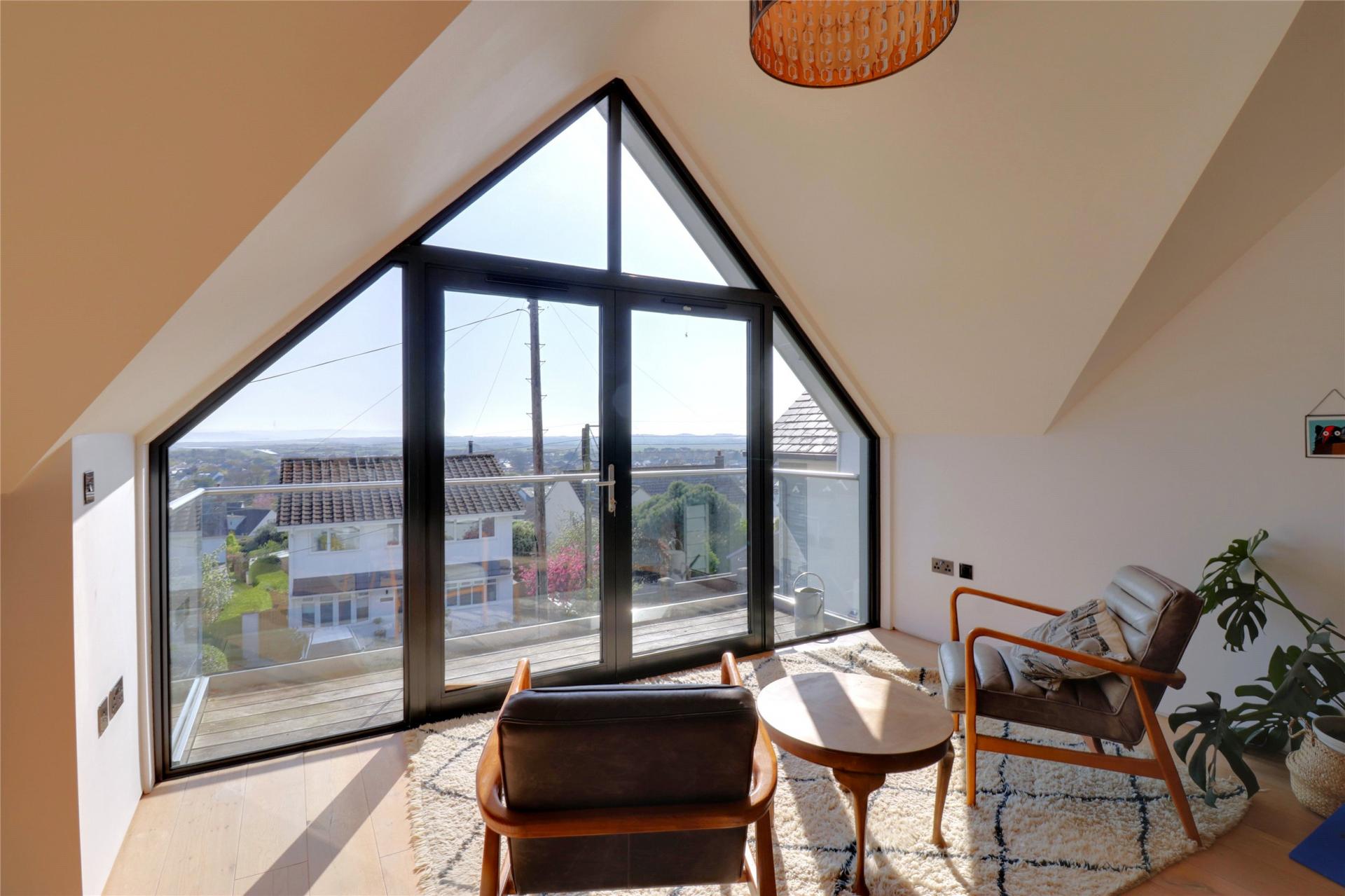 For Sale in Braunton is this fabulous detached home set high in the Braunton Hills offering panoramic views from Heanton around to the estuary, Braunton Burrows and the sea. Versatile accommodation with 4/5 bedrooms, integral double garage. Fantastic open plan living space on the top floor with feature triangular windows and bi-fold doors opening out to the rear garden where the views can also be enjoyed. EPC: B
