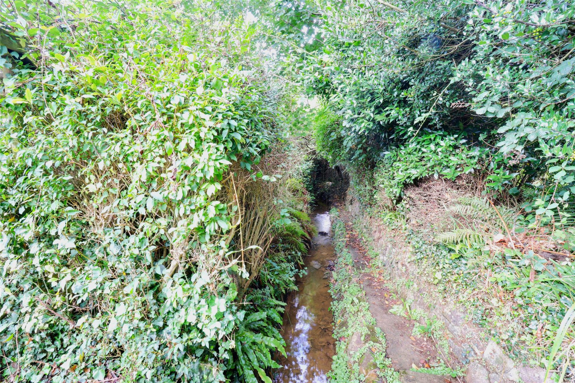 The rear garden is beautifully designed, with a paved patio, hot tub, built-in BBQ, and decked seating area. A gate leads to an enclosed space with a bridge over the brook, custom timber storage, and a covered seating area, all surrounded by a lawn and well-placed shrubs.