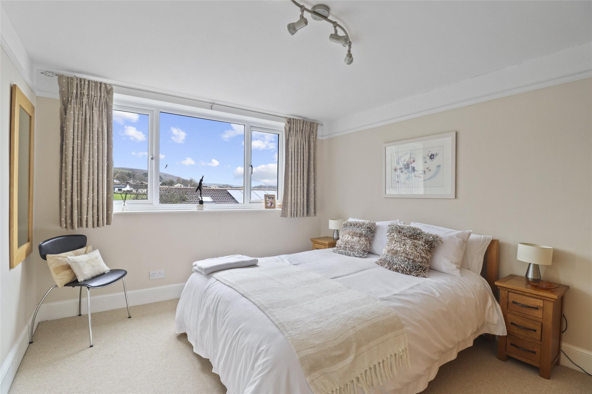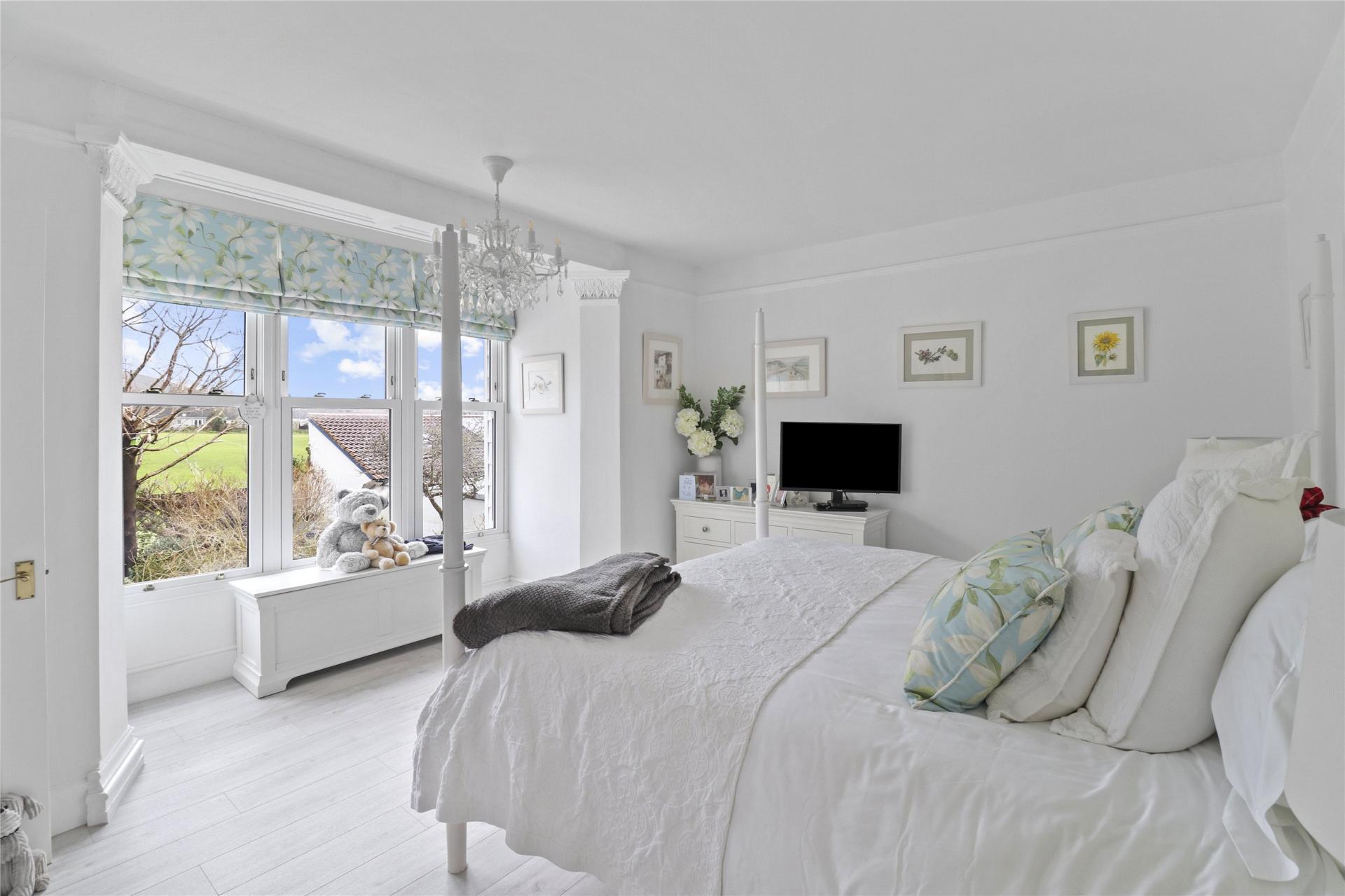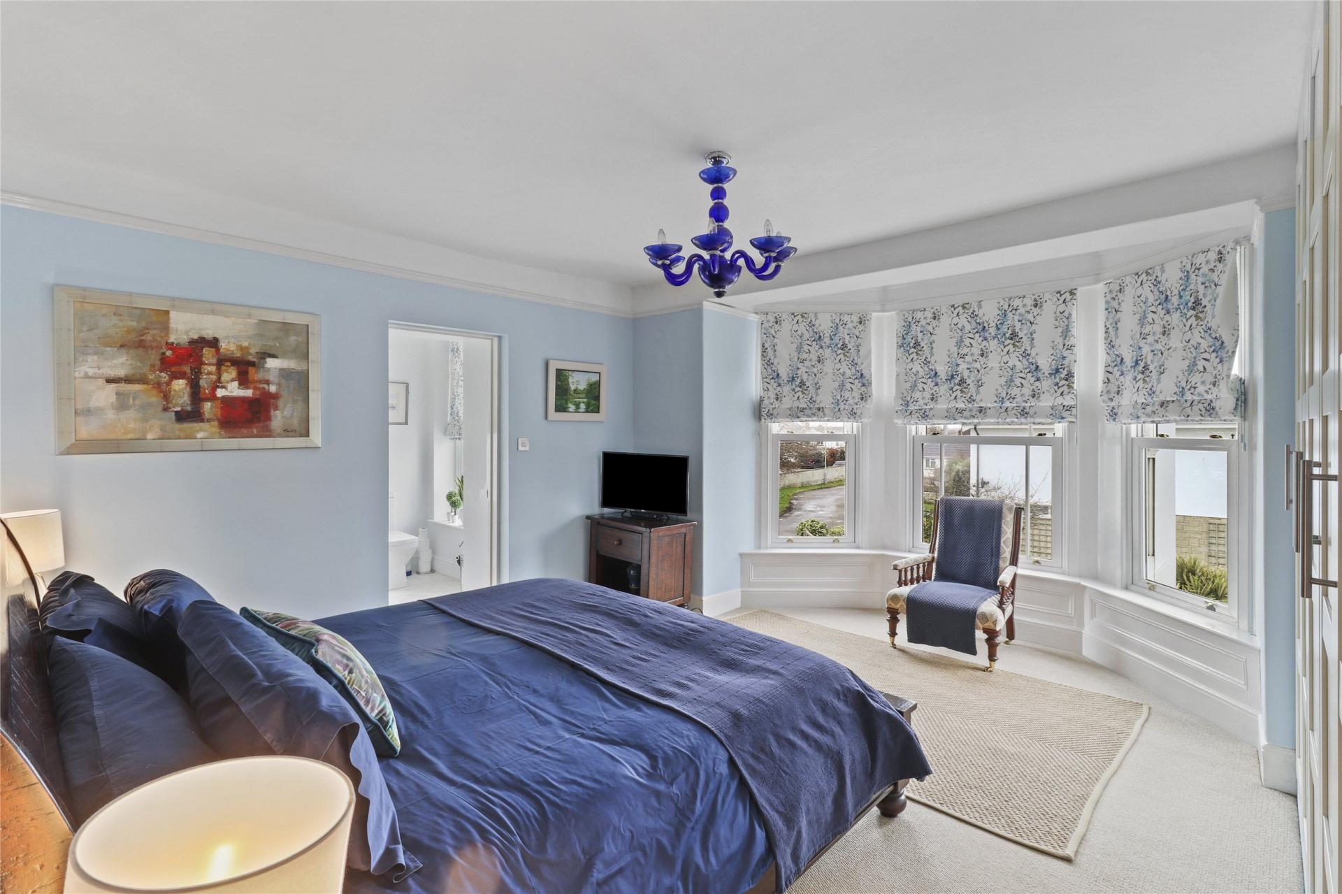 The main bedroom is an impressive suite with a large bay window showcasing far-reaching views of the Devon hills. It features a luxurious en-suite bathroom with a central stone bathtub, extensive built-in wardrobes, and a dressing area. A spacious guest bedroom mirrors the grandeur of the master suite and includes a beautifully appointed en-suite shower room with ambient lighting. Three additional well-sized bedrooms on this floor offer flexibility for family or guests, alongside a stylish family bathroom and ample storage solutions.