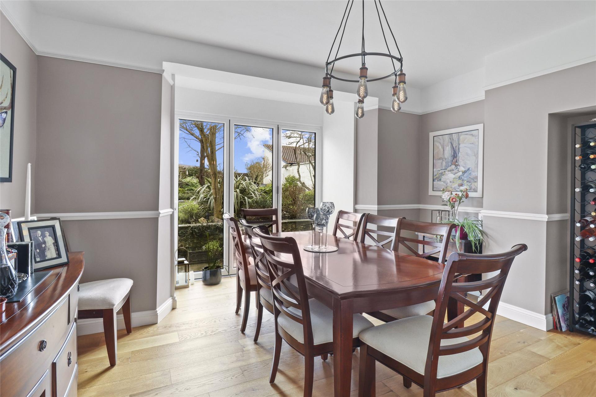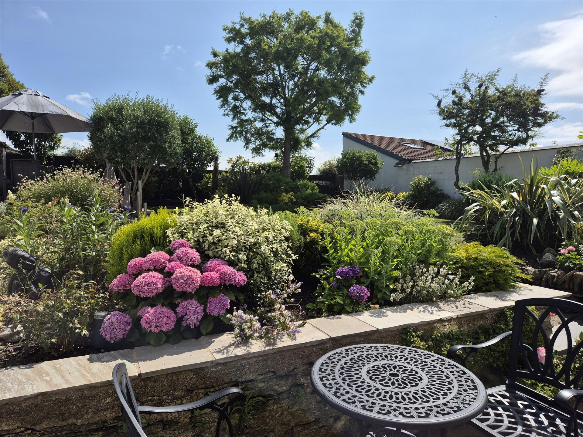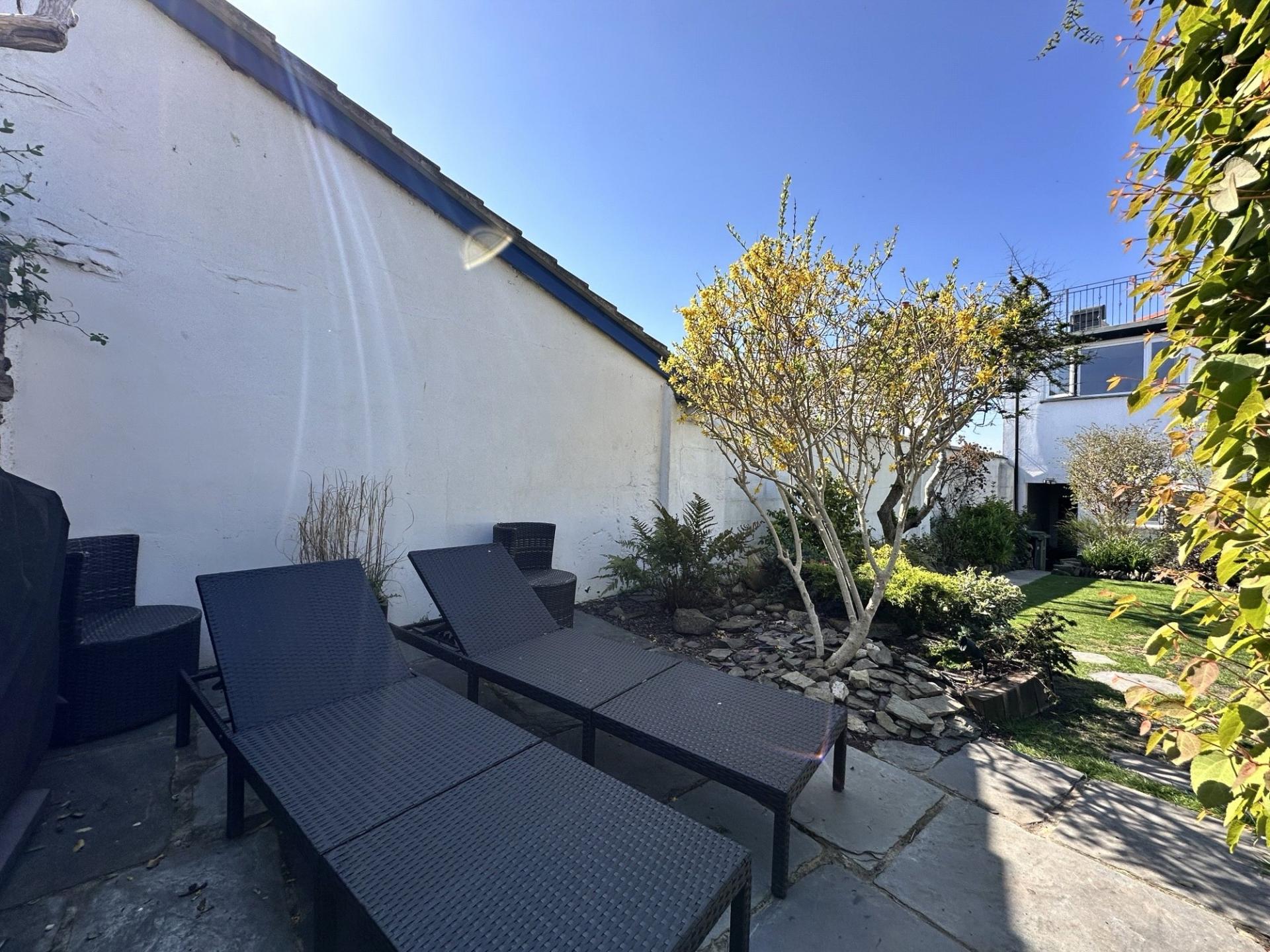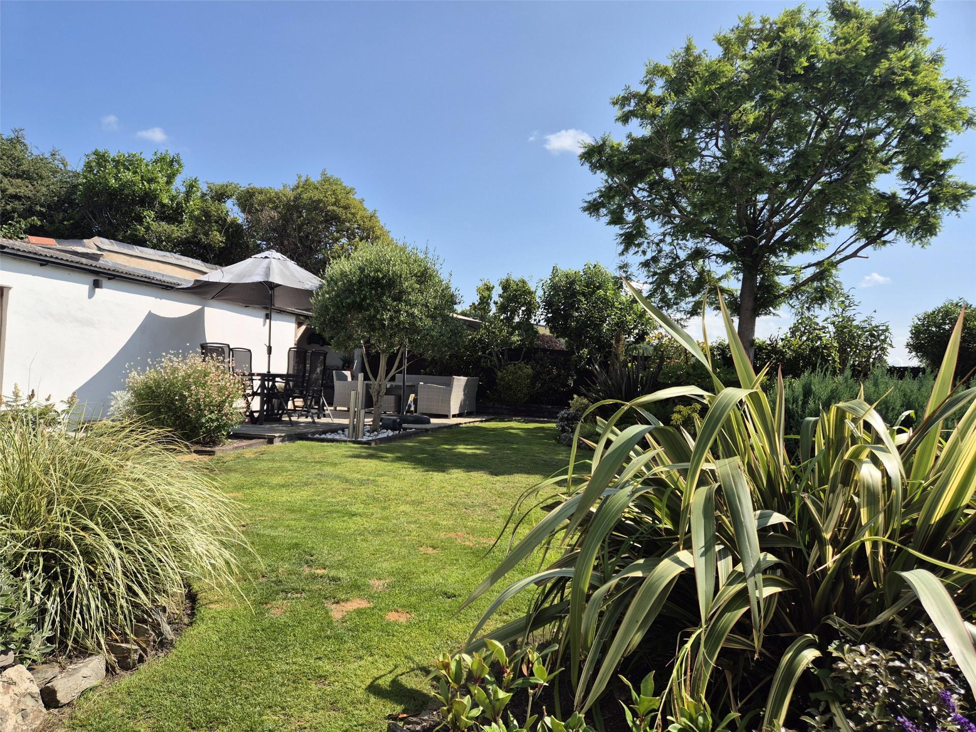 The mature, walled rear garden is an exceptional feature of this home, offering a safe and serene setting for families and pets. Designed for both relaxation and entertaining, it includes two patio areas perfect for alfresco dining, integrated sleeper lighting, and a stylish garden bar. The garden is well-stocked with fruit trees and benefits from excellent privacy while backing onto playing fields.