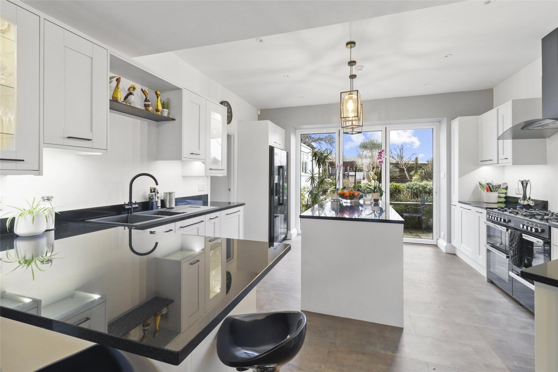 Ground Floor An inviting entrance porch leads into a bright and spacious reception hallway, featuring elegant new wood flooring and a grand staircase to the upper floors. Off the hallway, there is a cloakroom, a downstairs WC, and three well-proportioned reception rooms. The sitting room boasts a large bay window with stylish timber shutters, a charming fireplace with a wood burner, and stripped wood flooring. The dining room is an ideal entertaining space, complete with new timber flooring, a recessed wine rack, and bi-fold doors opening onto the garden. The dual-aspect kitchen/living room is the heart of the home, offering a contemporary gas fireplace and further bi-fold doors to the garden. The kitchen is newly fitted with sleek white shaker-style cabinetry, black granite worktops, a premium Belling range cooker, and integrated appliances, including a dishwasher and an American-style fridge-freezer. A separate utility room provides additional storage and workspace, with access to the garage, a laundry room, and a secondary staircase leading to the first floor.