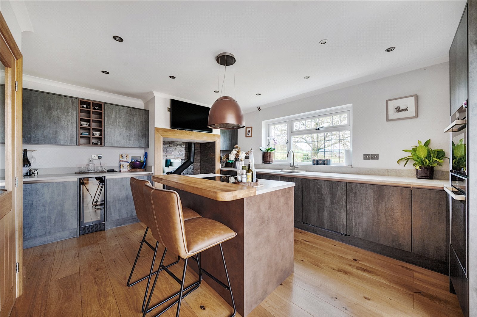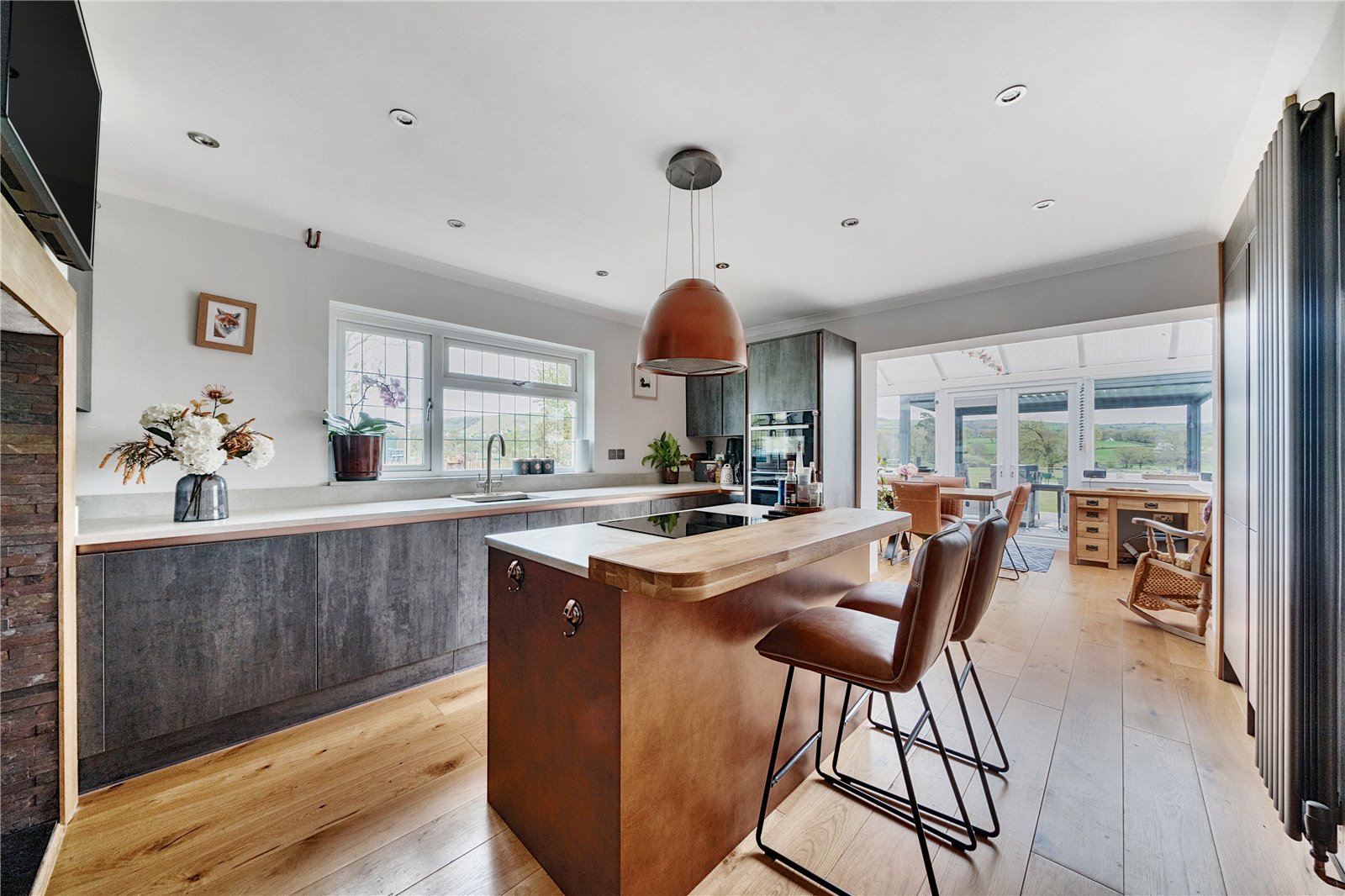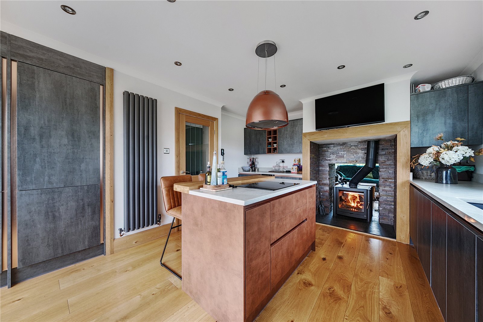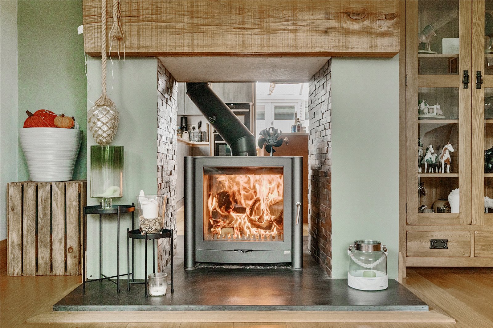Step inside this beautifully presented home through a uPVC front door into a welcoming hallway, complete with attractive wood flooring and a useful built-in storage cupboard. To the left, a charming living room provides a cosy retreat, featuring the warmth of oak flooring and a striking modern back-to-back woodburner—perfect for those cosy winter evenings.At the heart of the home lies the stylish, recently updated kitchen. Thoughtfully designed, it boasts contemporary units, an inset sink, integrated appliances, and a central island with breakfast seating. The shared woodburner adds both warmth and character. A wide opening leads into the bright and airy garden room, creating an exceptional entertaining space with ample room for a dining table and doors that open out onto the garden—seamlessly blending indoor and outdoor living.