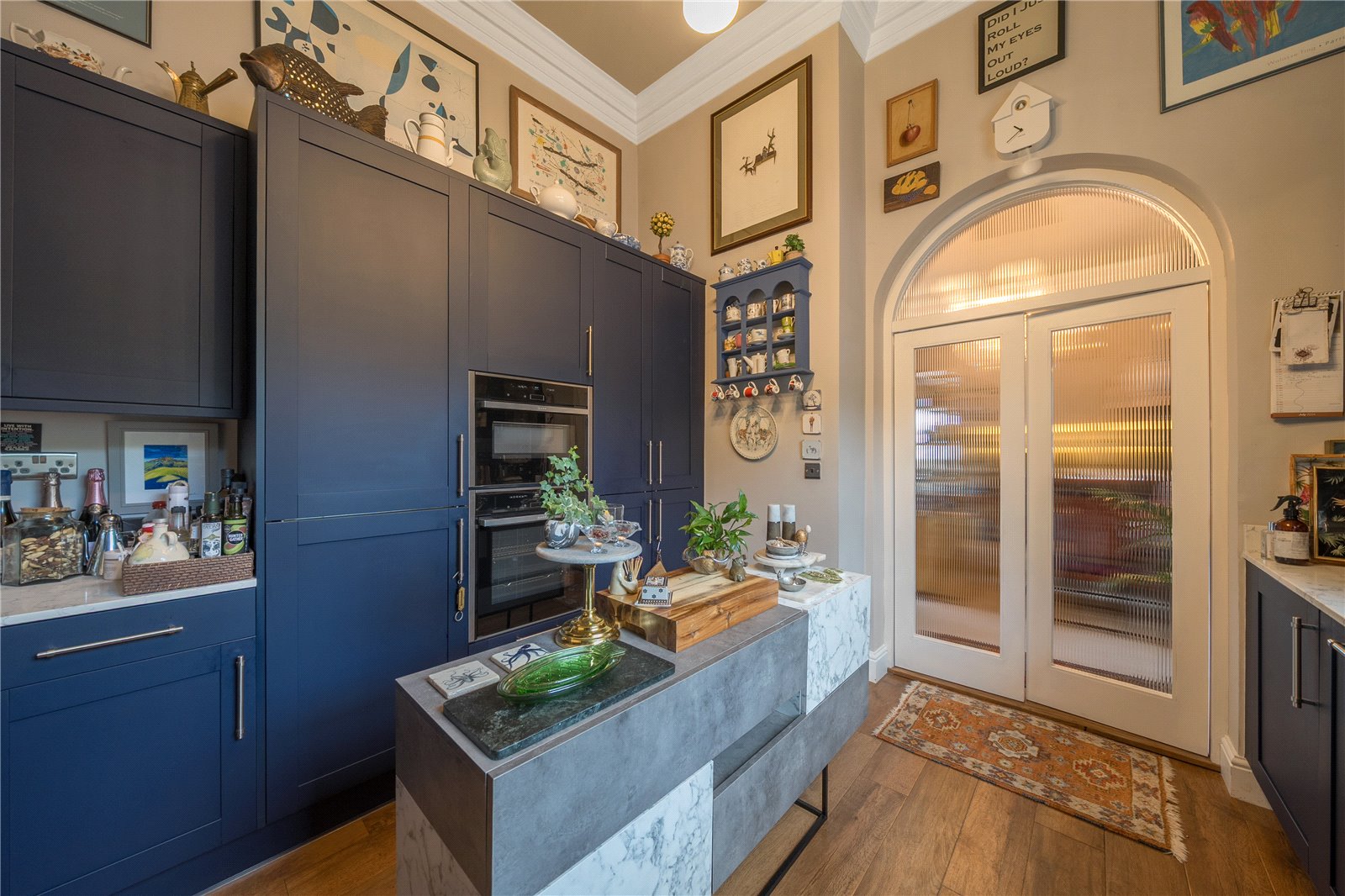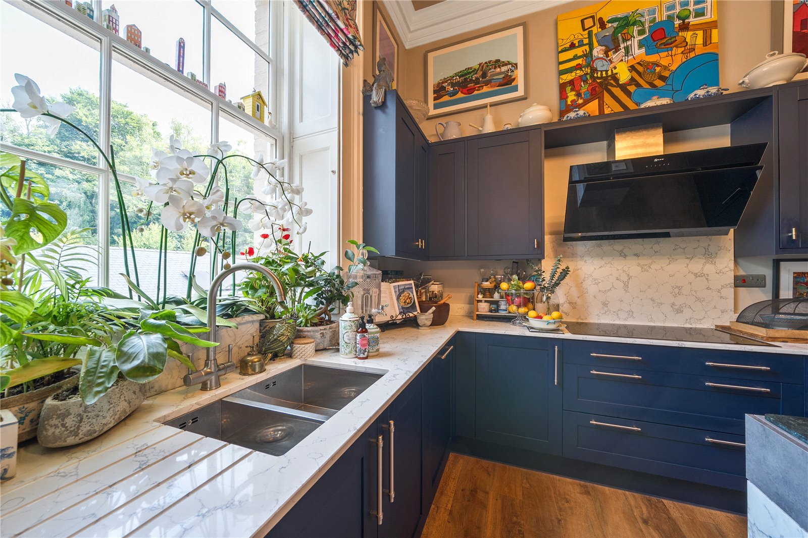 Ascending the staircase, you’ll find an inner landing with access to a well-appointed cloakroom fitted with WC and wash basin—ideal for guests. To the other side of the landing lies the stunning main reception room. This impressive space effortlessly combines sitting and dining areas, enhanced by elegant ceiling coving, and a feature fireplace with inset wood-burning stove that adds warmth and character. A trio of windows floods the room with natural light from multiple aspects, while French doors lead out to a private balcony—perfect for enjoying the sweeping panoramic views of the Brecon Beacons. From the reception room, double doors open into the modern kitchen. Thoughtfully designed, it features a range of contemporary fitted units, an inset sink, and a full suite of integrated appliances including oven, hob, microwave, fridge, freezer, and dishwasher.