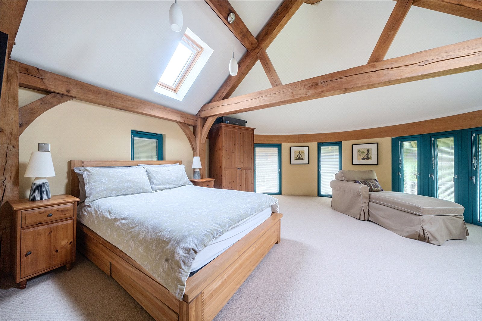 The enclosed, open-tread spiral staircase, featuring accent lighting, leads from the kitchen to an expansive landing area with inset floor lights and a partially vaulted ceiling. The landing provides access to three generous bedrooms, all with vaulted beamed ceilings that maintain the home’s charm. The standout master bedroom is particularly spacious, showcasing exposed oak A-frames, feature curved walls, and a modern en-suite with a walk-in shower, sink unit, and WC. The family bathroom completes the accommodation, featuring a contemporary suite with a freestanding bath set on a raised tiled platform—perfect for relaxation—along with a shower cubicle, twin circular wash hand basins, W.C., and vaulted beamed ceiling.