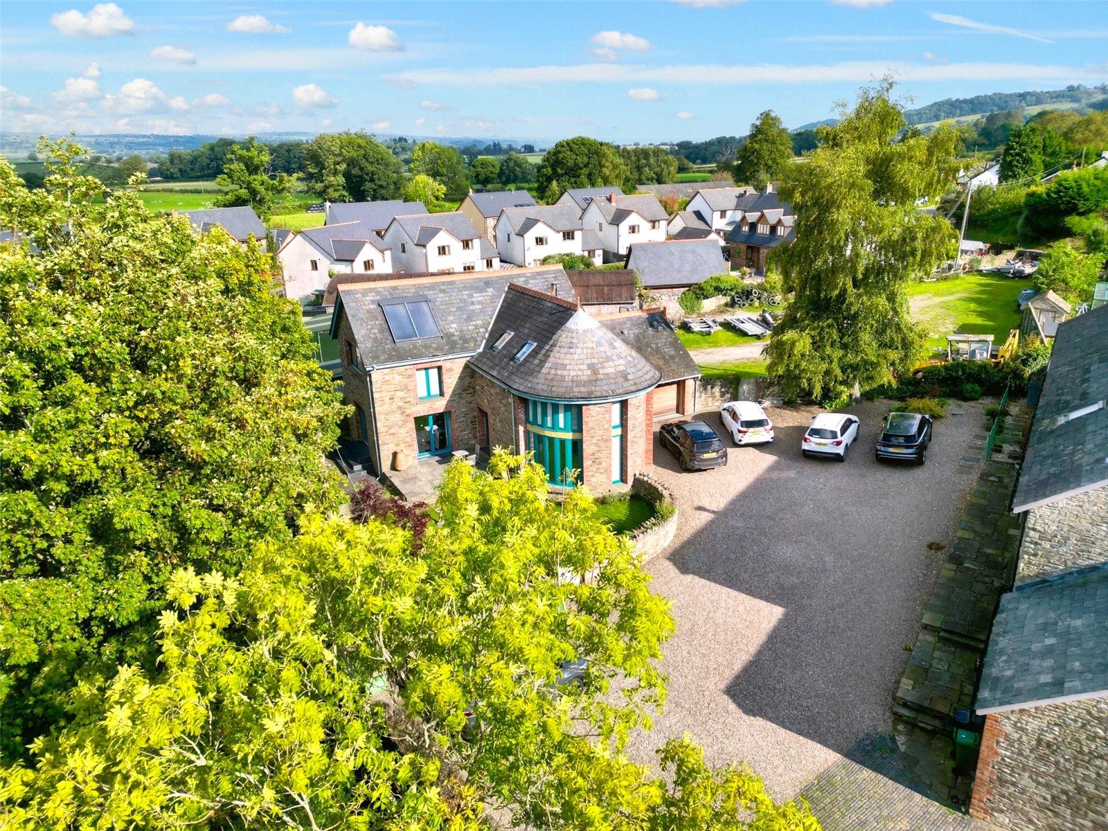 Glas y Dorlan is an extraordinary modern 3 bedroom family home offering just under 200 sq m of beautifully designed living space (including the garage), set within a picturesque courtyard in the heart of a charming village, perfectly positioned between Brecon and Hay-on-Wye.Architect-designed with a strong focus on energy efficiency, this distinctive home combines cutting-edge sustainability with stylish comfort. It boasts triple glazing, solar thermal panels for hot water, a whole-house ventilation system with a heat pump, and a wood pellet boiler powering the underfloor heating on the ground floor. The eco-friendly features of Glas y Dorlan are seamlessly integrated into its stunning design.