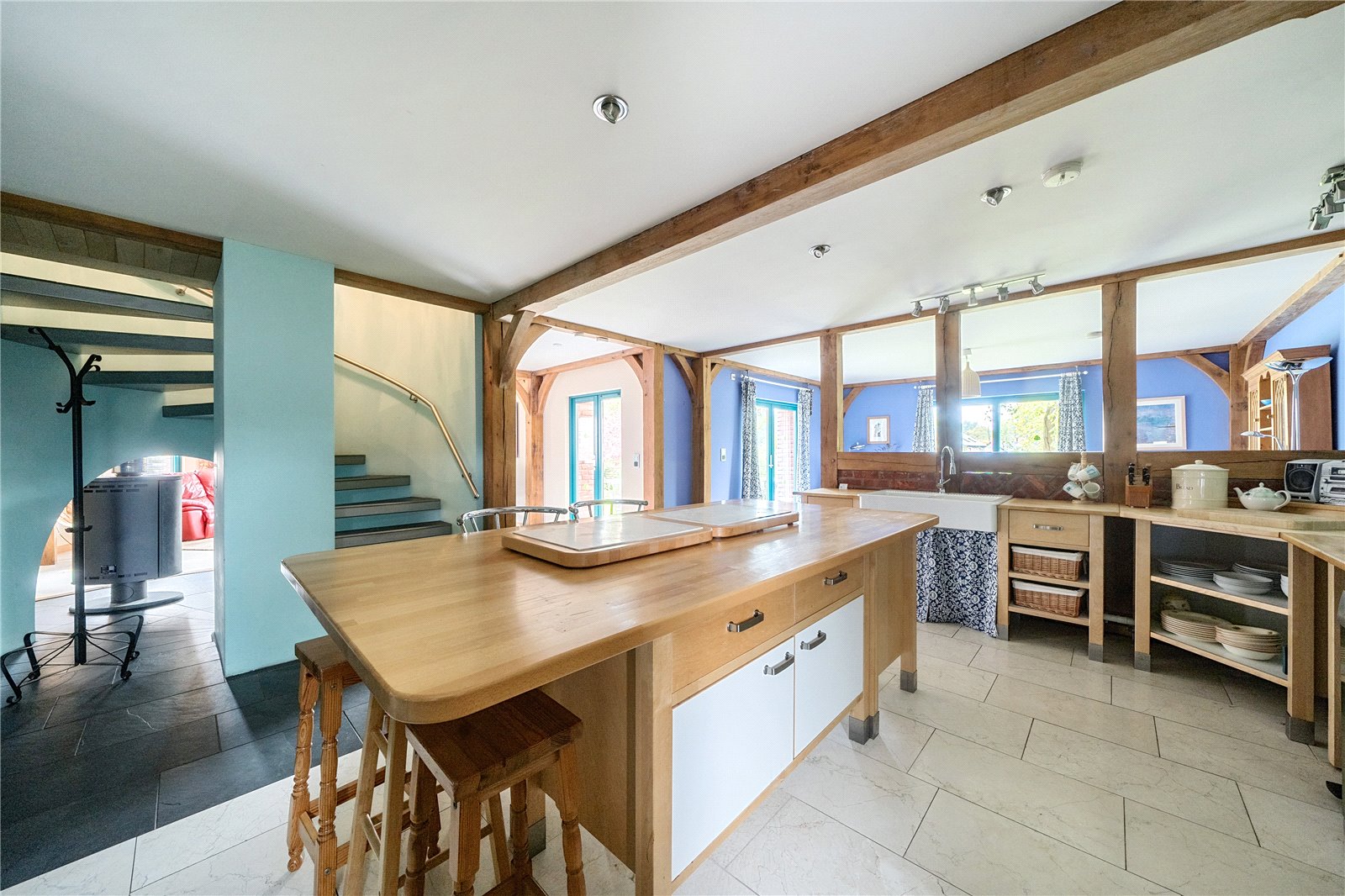 The property is accessed through a recessed entrance porch, leading into a predominantly open-plan ground floor. This space showcases exposed oak beams and timbers throughout, blending rustic charm with modern design elements. Feature spotlights enhance the ambiance, creating a warm and inviting atmosphere. The kitchen area is fitted with a range of freestanding units, an inset double sink, built-in oven and hob, and ample space for white goods. A central island with a breakfast bar provides a casual dining option, perfect for quick meals or social gatherings. A stylish timber and brick screen acts as a striking feature, subtly dividing the space while maintaining the open-plan feel. The dual-aspect room has double doors that open to the garden patio, ideal for alfresco dining.