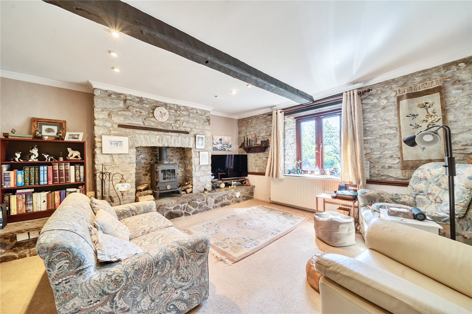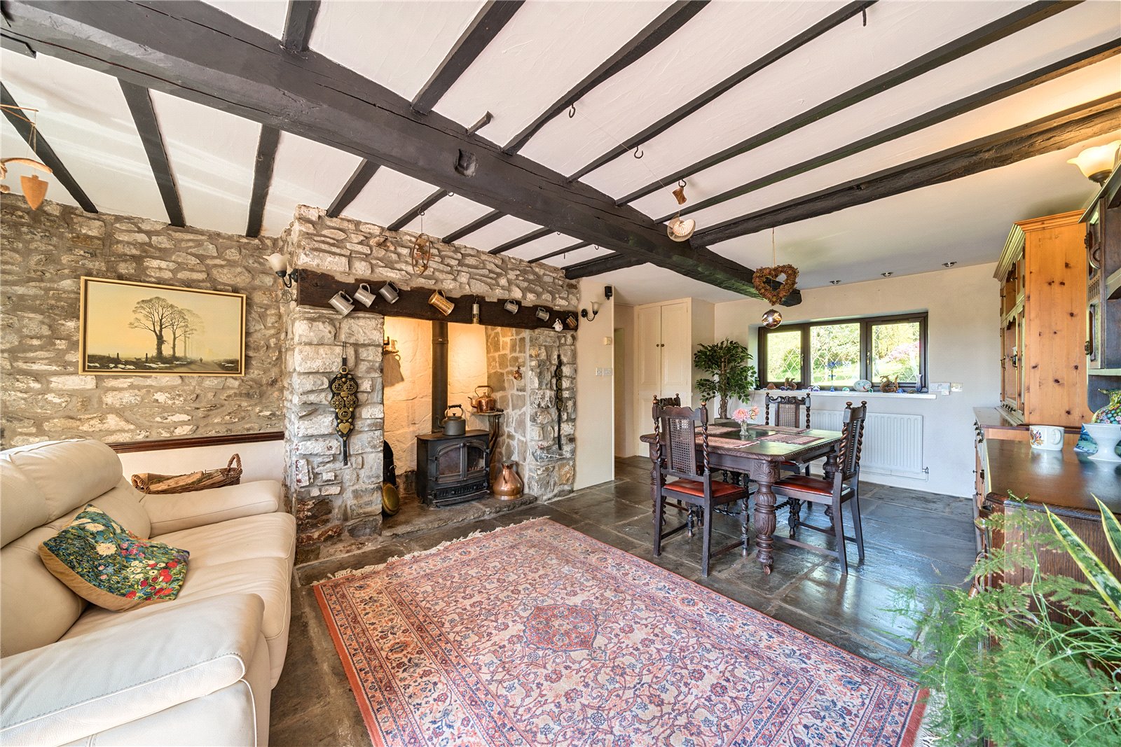 The main entrance opens into a charming reception room, currently used as a dining room, featuring a beamed ceiling, original flagstone flooring, and a striking natural stone fireplace with an inset wood-burning stove. This stove benefits from a back boiler, offering the option to supplement the hot water system.To the left, a galley-style kitchen is well-equipped with a generous range of units, built-in oven and hob, and a 1½ bowl sink. At the heart of the home lies the main sitting room—a wonderfully atmospheric space with exposed timber beams, a magnificent inglenook fireplace housing a wood burner, and characterful window seats. A door from here leads into a further reception room with natural stone detailing and another wood-burning stove set within a stone chimney breast.Completing the ground floor is a stylish and modern shower room, finished with attractive tiling and fitted with a WC, wash hand basin, and a spacious walk-in shower