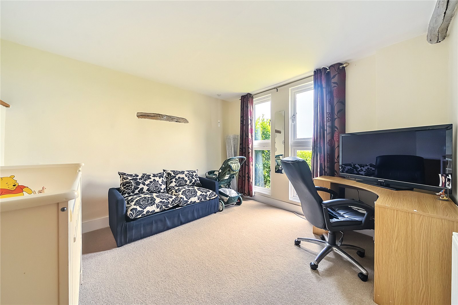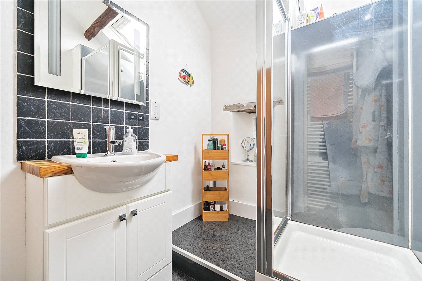 Upstairs, the open-tread staircase ascends to a spectacular first-floor sitting room with a high vaulted ceiling showcasing original exposed roof timbers. A large gable-end window frames glorious rural views, while a wood-burning stove adds a touch of warmth and character.From here, a rear door leads into the impressive master bedroom, again featuring vaulted ceilings with exposed beams, a large rear window, built-in wardrobe space, and a stylish en-suite shower room complete with a cubicle shower, low flush WC, and vanity basin.