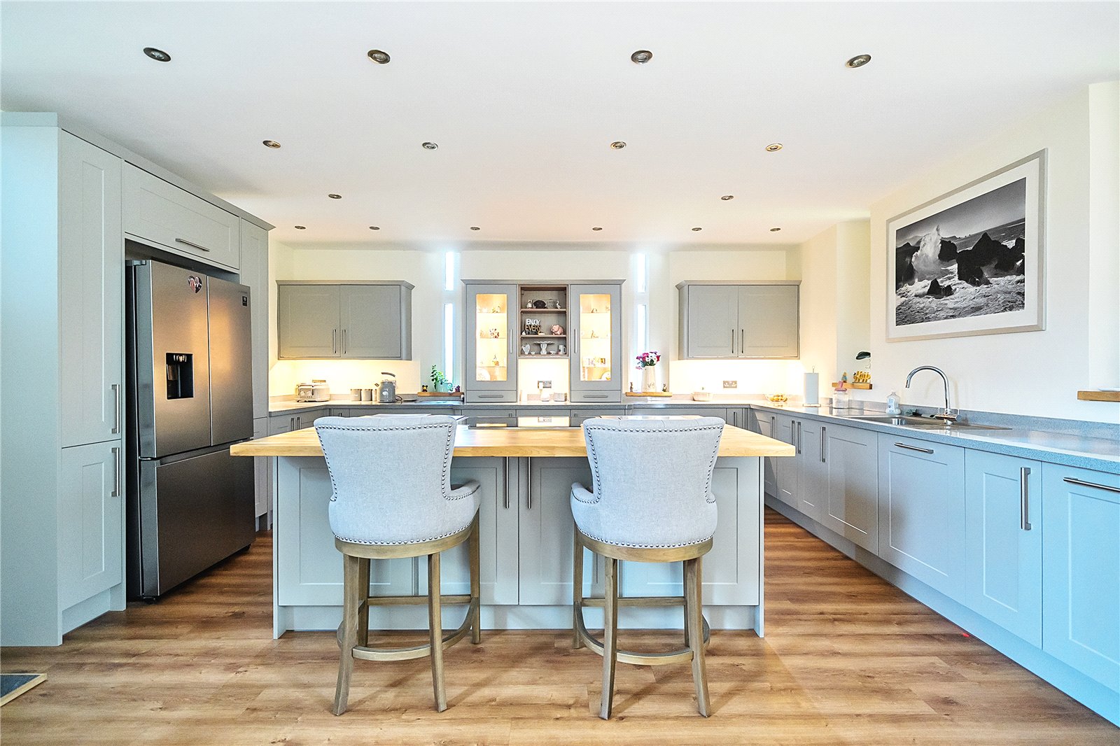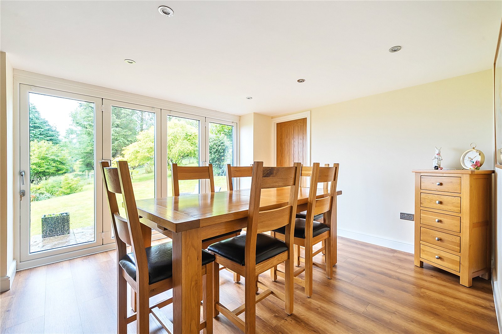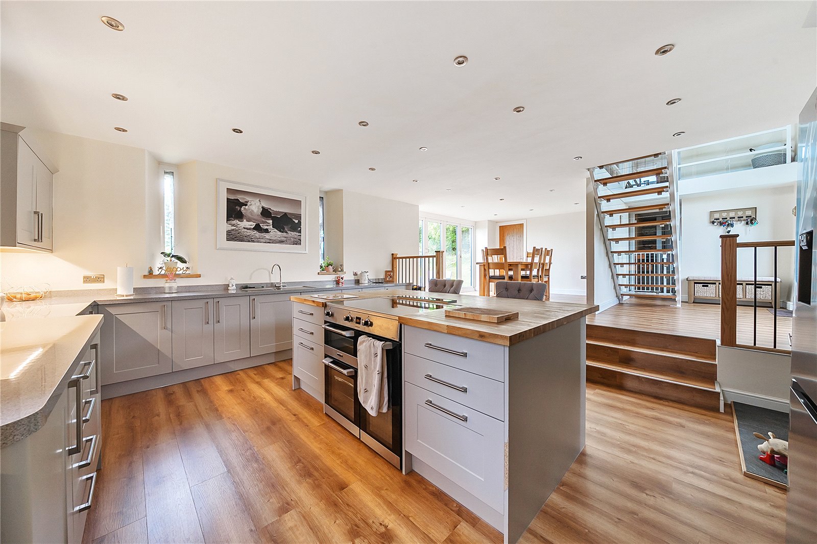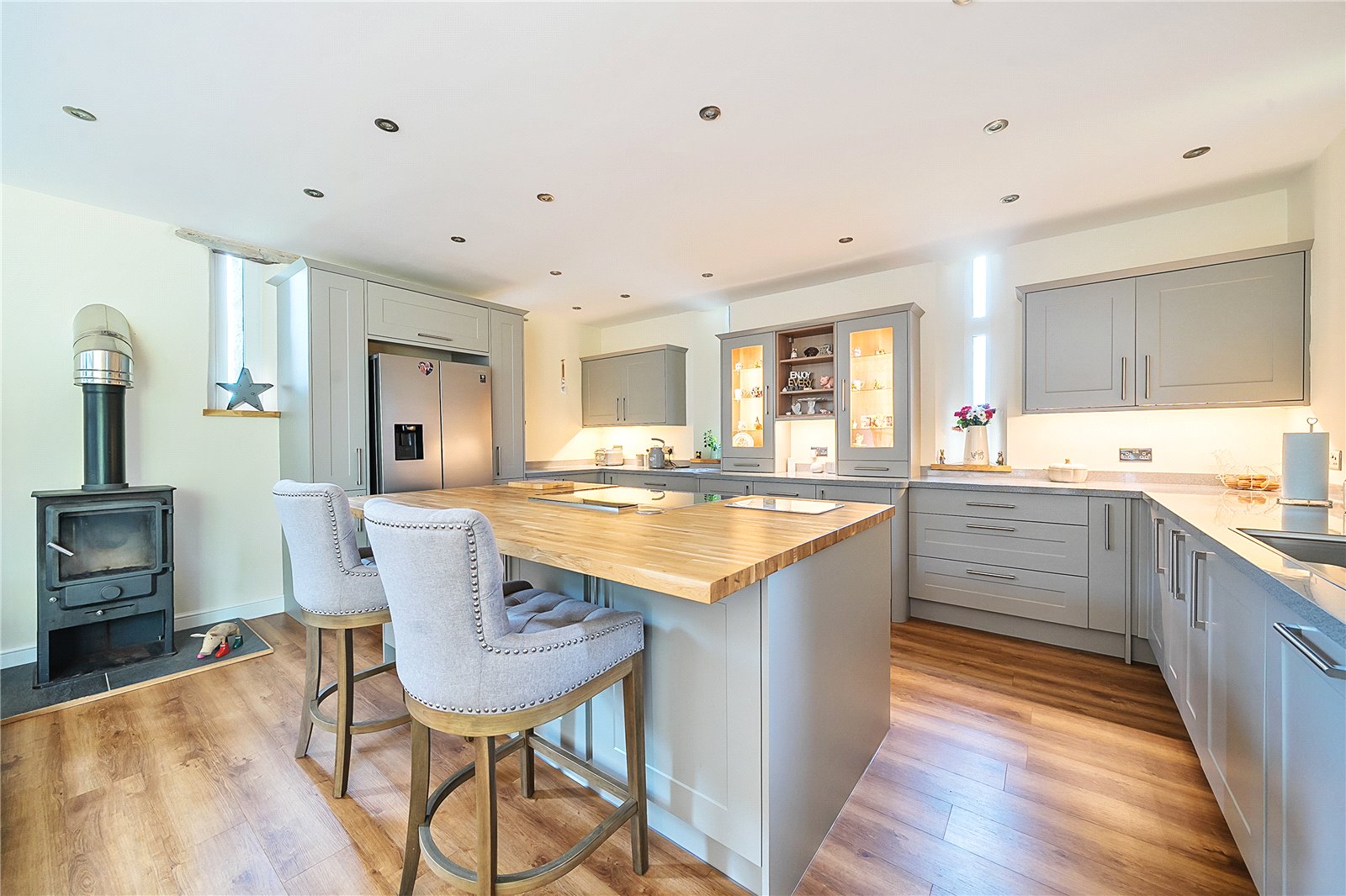 A charming paved pathway guides you to the front entrance door, which opens into a full-height entrance hall. Here, open-tread stairs lead to the first floor, while attractive wood-effect flooring flows seamlessly via a few steps into a spacious open-plan kitchen. Beautifully appointed, the kitchen features a comprehensive range of fitted units with an inset sink, integrated dishwasher, and recess for a fridge freezer. A central island provides additional storage and houses a range cooker, with a breakfast bar perfect for casual dining. A cosy wood-burning stove completes this inviting space. Steps lead to a raised dining area, subtly separated from the kitchen and enjoying bi-fold doors that open onto the patio—ideal for entertaining and taking in the exceptional views over farmland towards the distant mountains. Adjacent is a practical utility room with tiled flooring, fitted base units, inset sink, and a deep storage cupboard housing the oil-fired boiler.