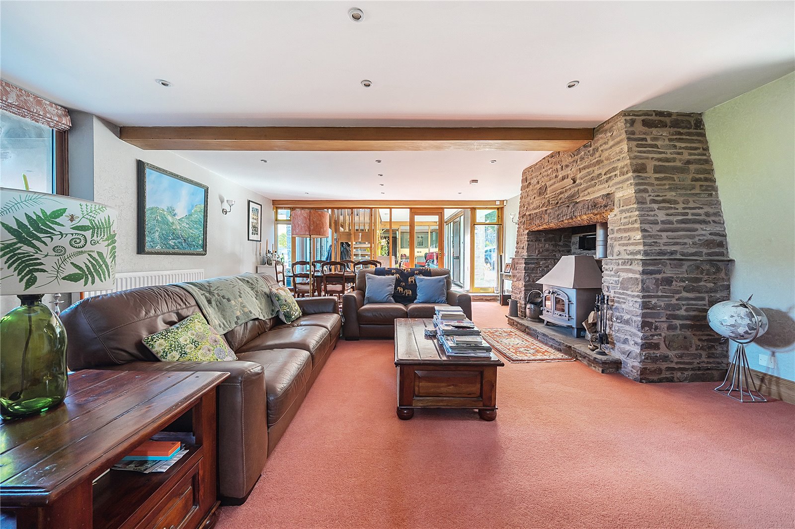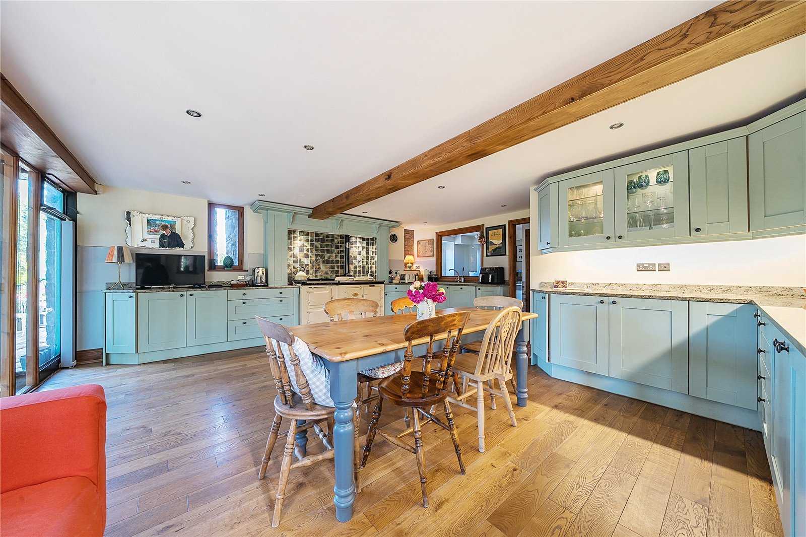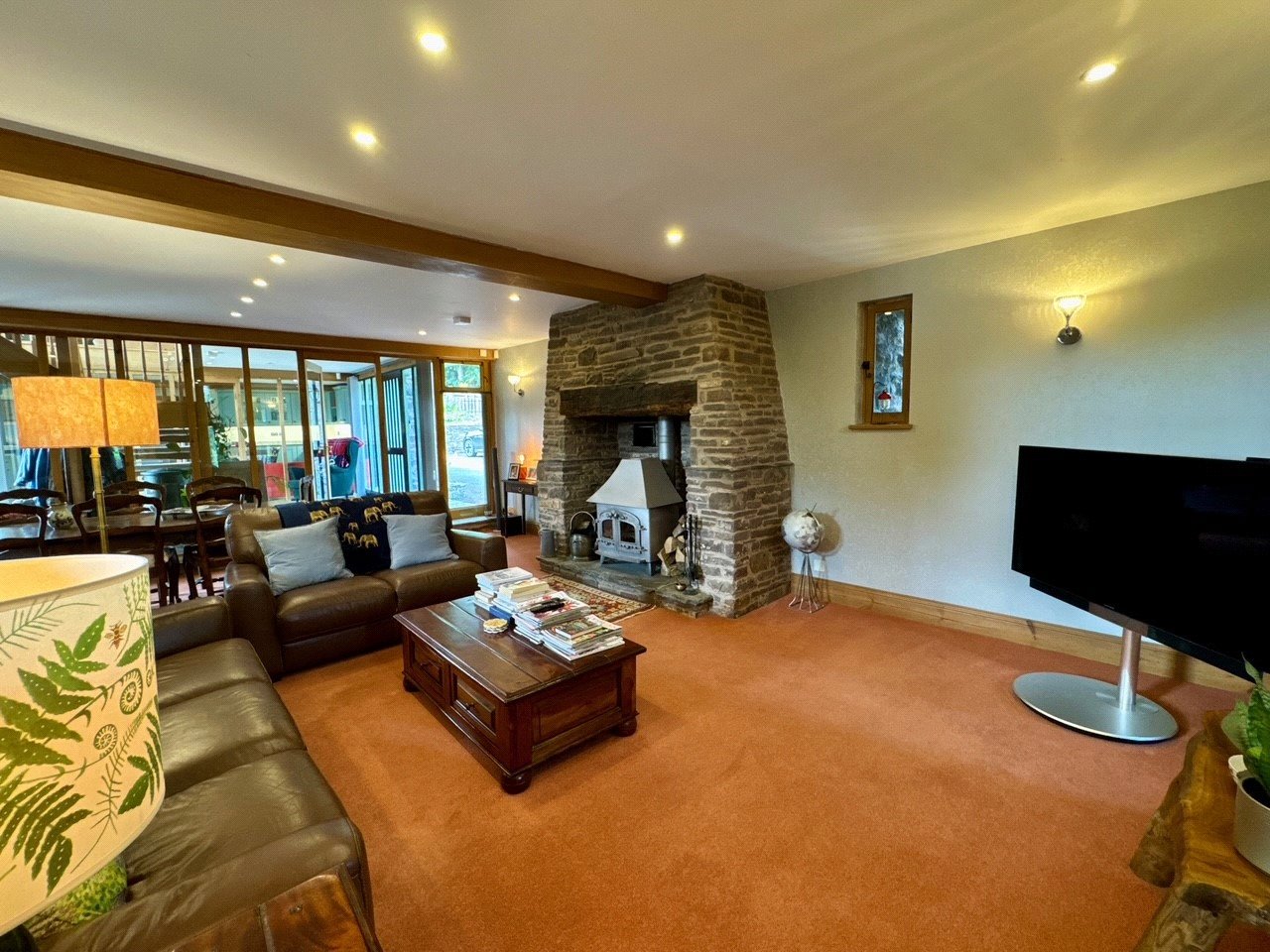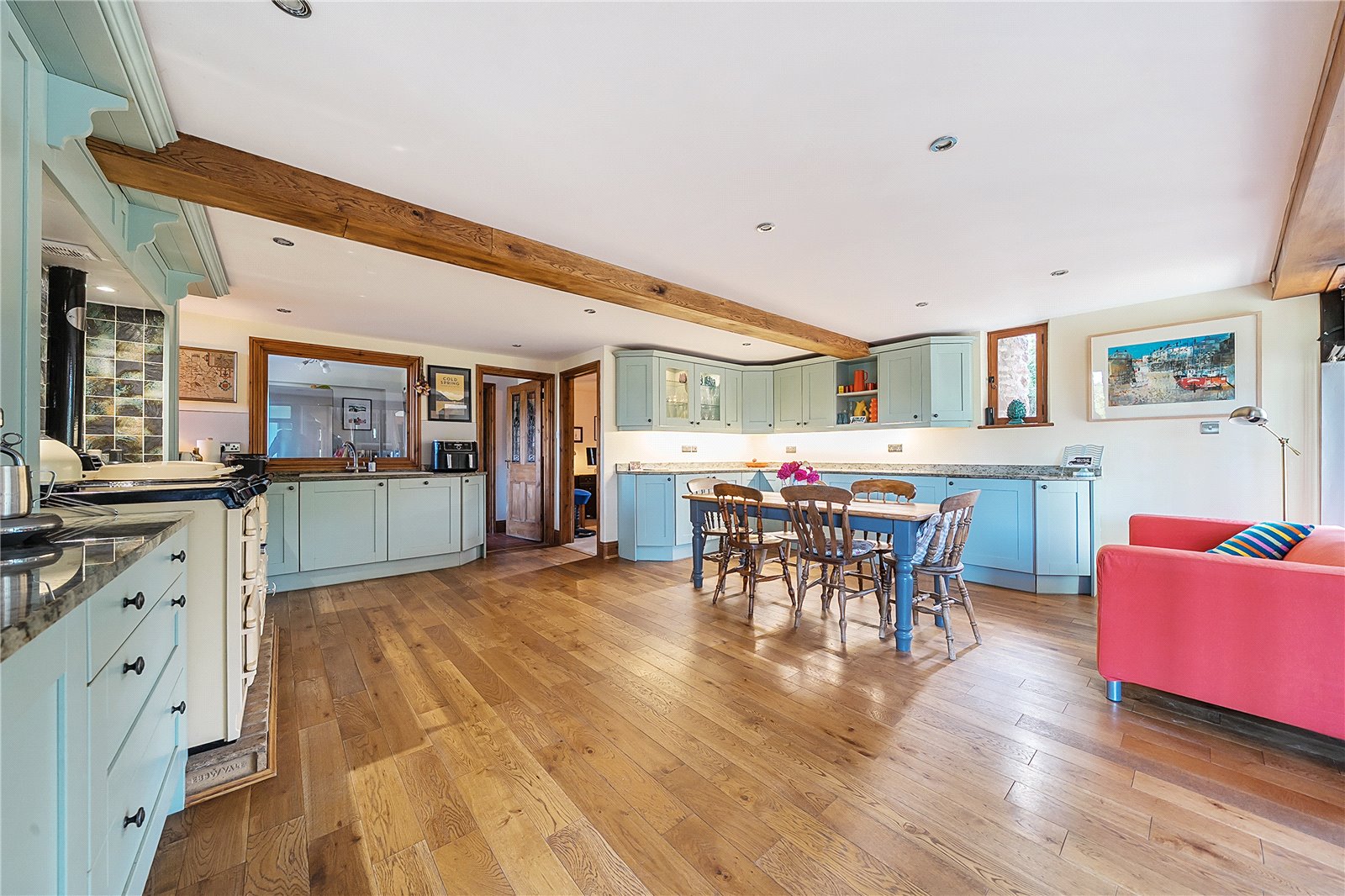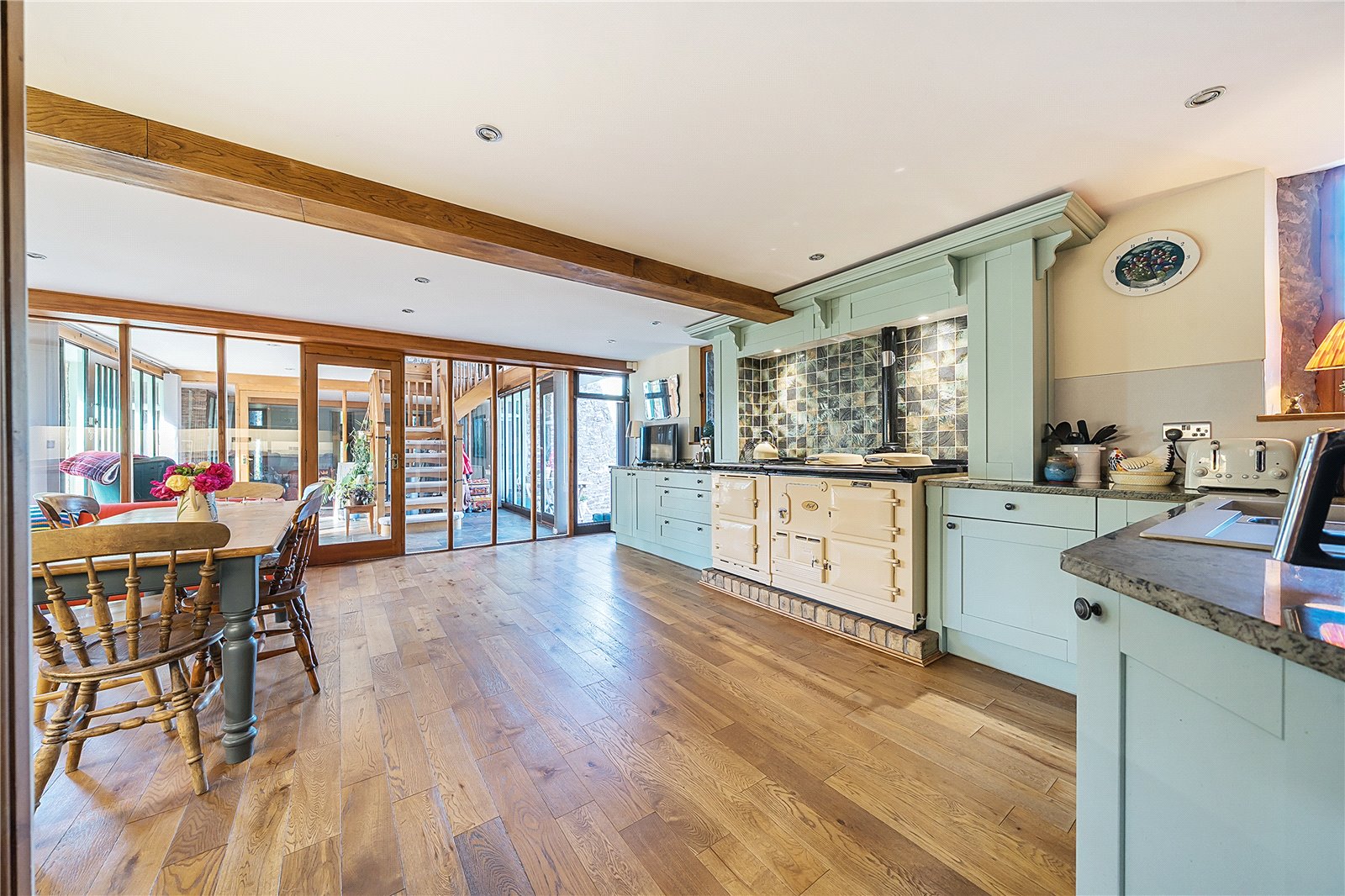 Step through the impressive glazed entrance screen into a welcoming hallway, where a galleried landing above and a full-height glazed screen opposite create an immediate sense of space and light. The attractive tiled floor underfoot adds a warm, rustic touch, setting the tone for the character and comfort found throughout the property.To the left, a cosy sitting room invites relaxation, centred around a striking stone fireplace with an inset wood-burning stove—an ideal retreat on cooler evenings.The heart of the home is undoubtedly the spacious kitchen/breakfast room. Designed with both family life and entertaining in mind, it features a stylish range of modern units, luxurious granite worktops, and an impressive oil/electric AGA—perfect for culinary enthusiasts. The generous layout provides ample space for dining, complemented by attractive flooring and a sociable, open feel that makes this room the natural hub of the home.