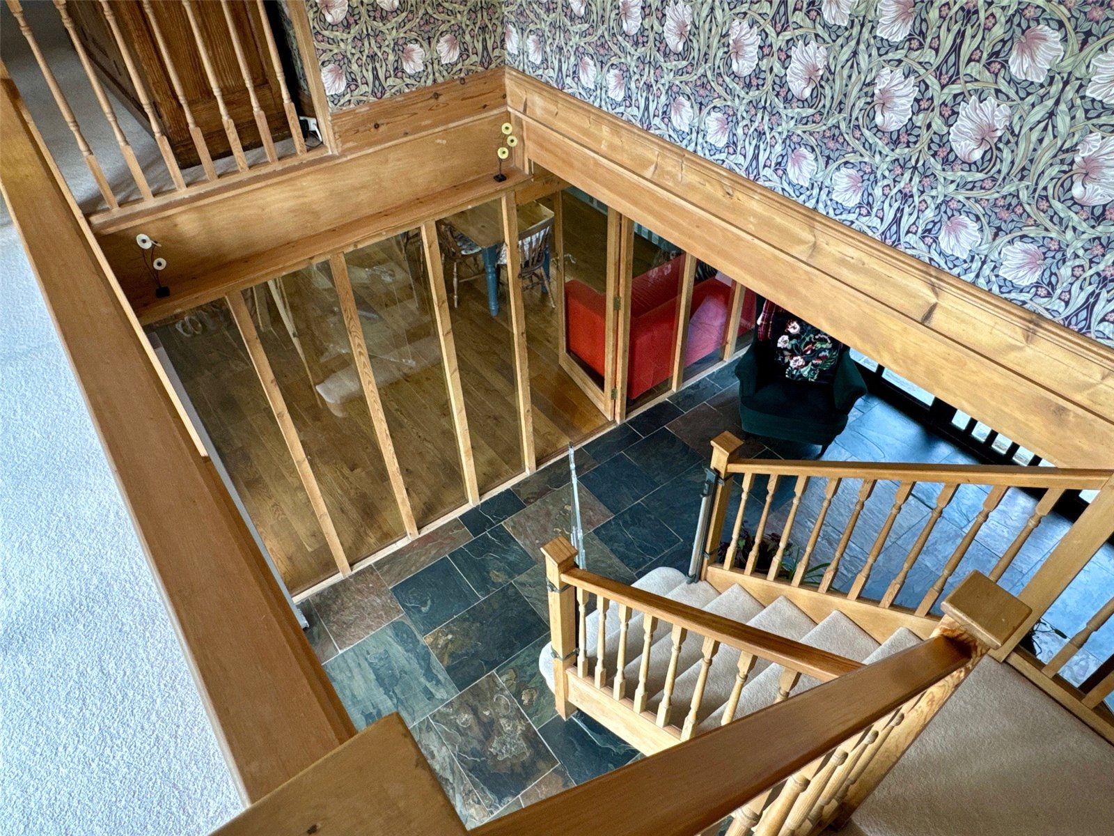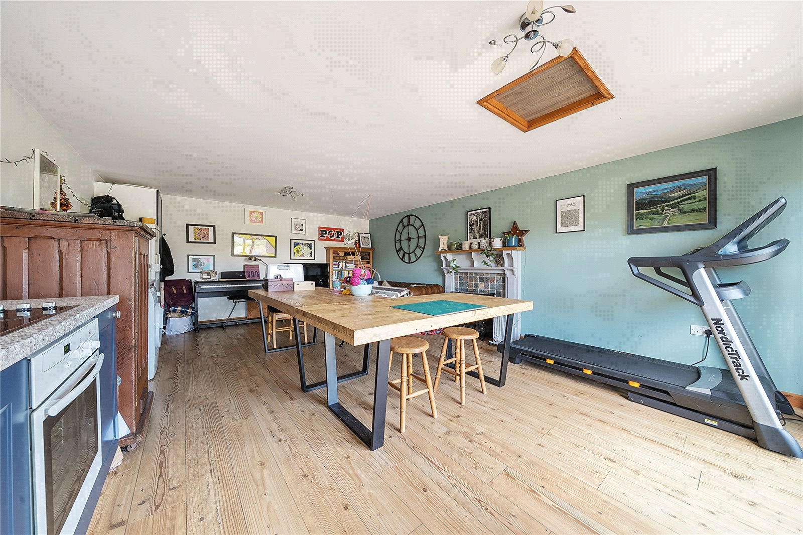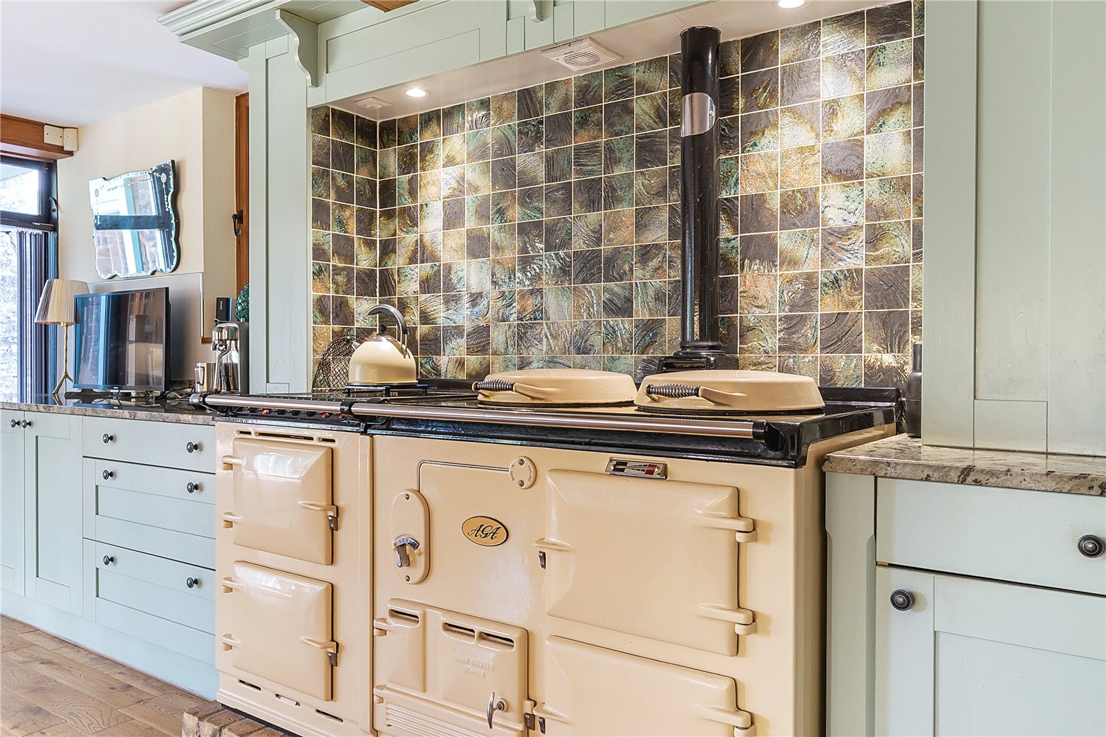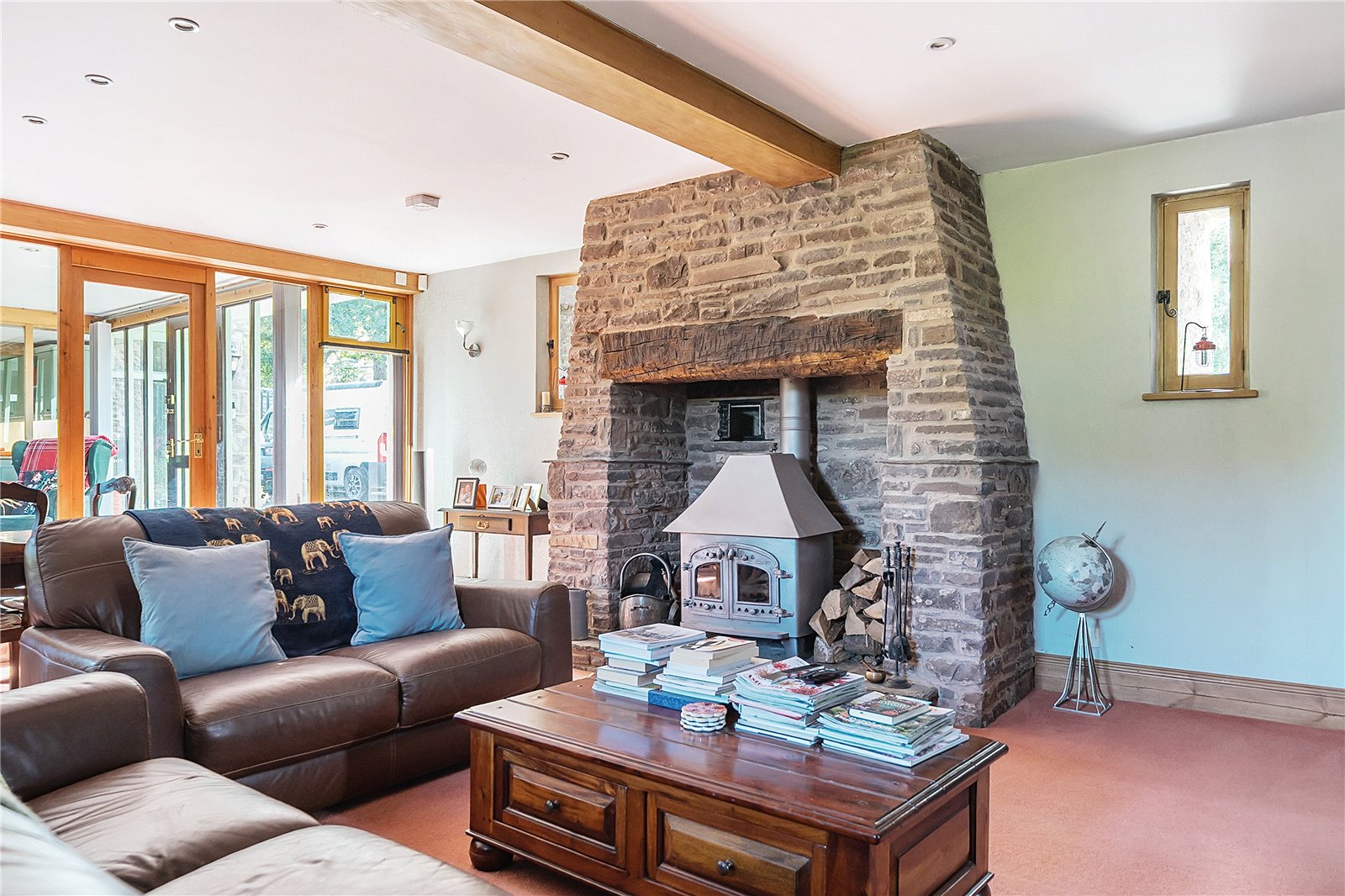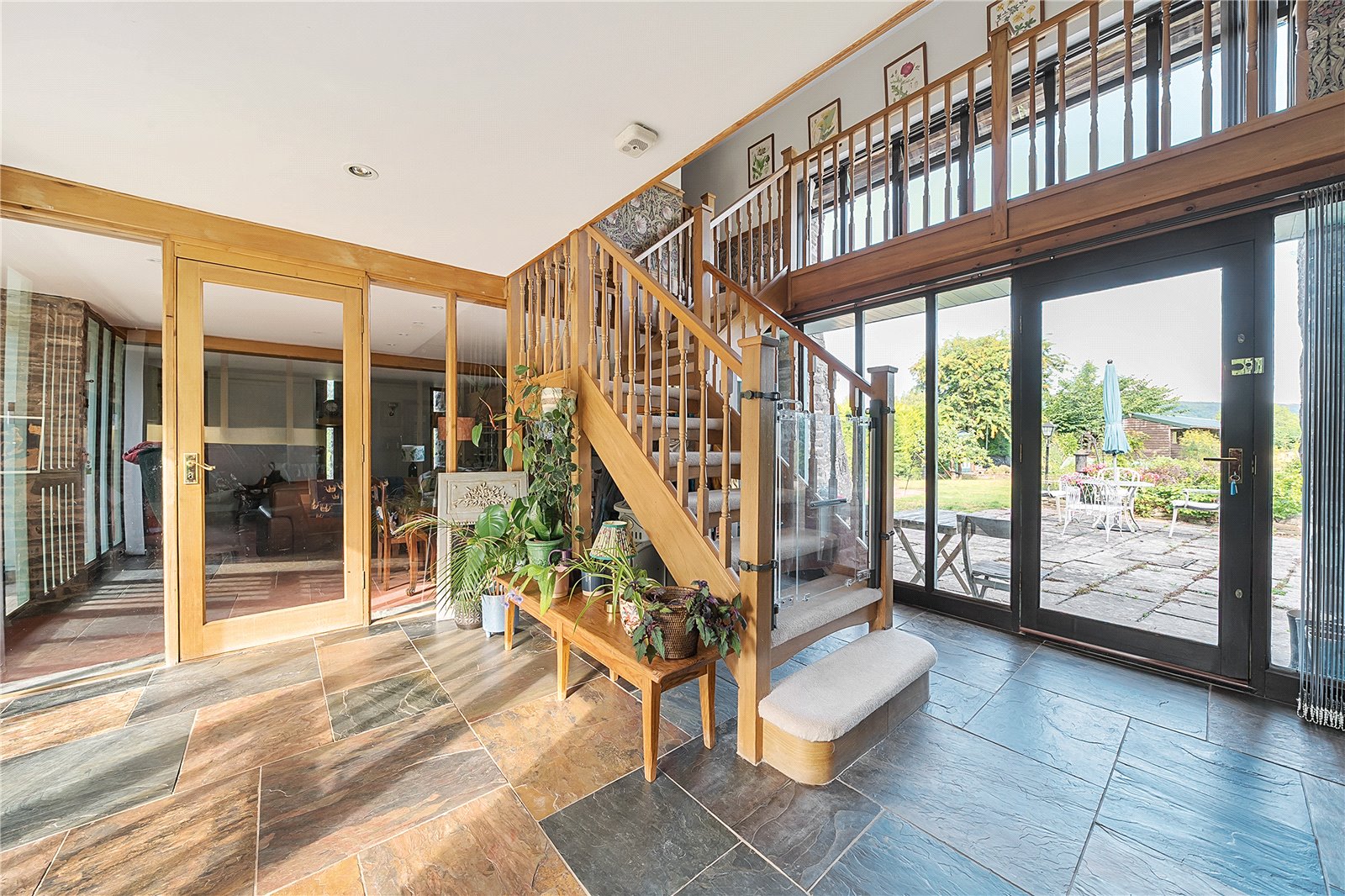 Step through the impressive glazed entrance screen into a welcoming hallway, where a galleried landing above and a full-height glazed screen opposite create an immediate sense of space and light. The attractive tiled floor underfoot adds a warm, rustic touch, setting the tone for the character and comfort found throughout the property.To the left, a cosy sitting room invites relaxation, centred around a striking stone fireplace with an inset wood-burning stove—an ideal retreat on cooler evenings.The heart of the home is undoubtedly the spacious kitchen/breakfast room. Designed with both family life and entertaining in mind, it features a stylish range of modern units, luxurious granite worktops, and an impressive oil/electric AGA—perfect for culinary enthusiasts. The generous layout provides ample space for dining, complemented by attractive flooring and a sociable, open feel that makes this room the natural hub of the home.