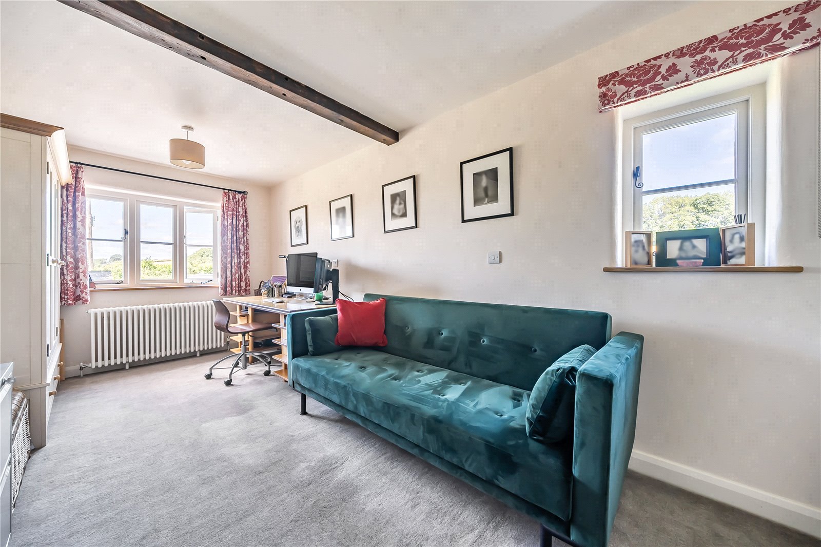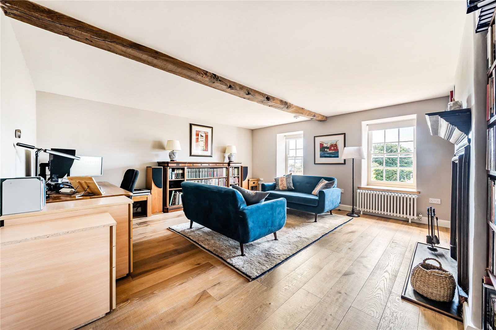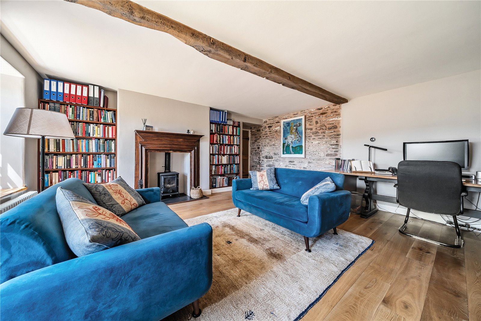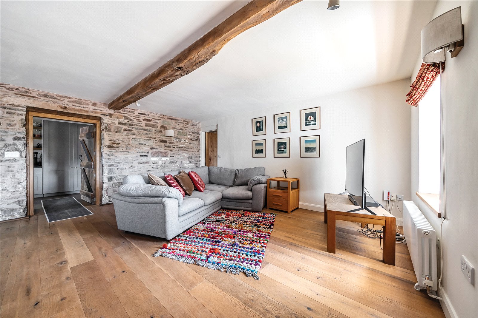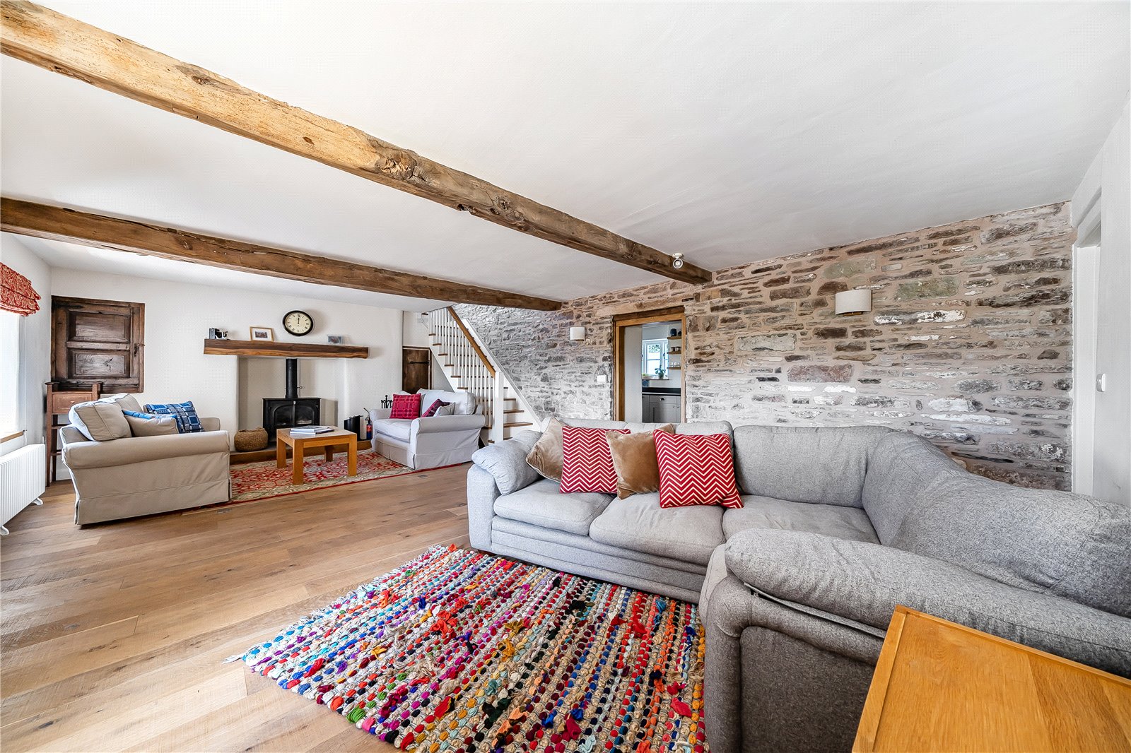 A charming entrance porch welcomes you into the property, complete with traditional flagstone flooring—an ideal space for shedding coats and boots before stepping inside. From here, a door leads through to the spacious sitting room, a wonderfully welcoming space that exudes character with exposed stone walls, original timber beams, and two front-facing windows that frame the captivating views. A feature fireplace with inset multifuel stove creates a warm focal point, and alongside a staircase rises gracefully to the first floor.A further door opens into a second reception room, equally brimming with charm —with an attractive fire surround housing a second multifuel stove. This room also enjoys a southerly aspect through windows to the front, and is again enhanced by exposed stonework and ceiling beams, creating a warm and intimate ambiance for winter nights.