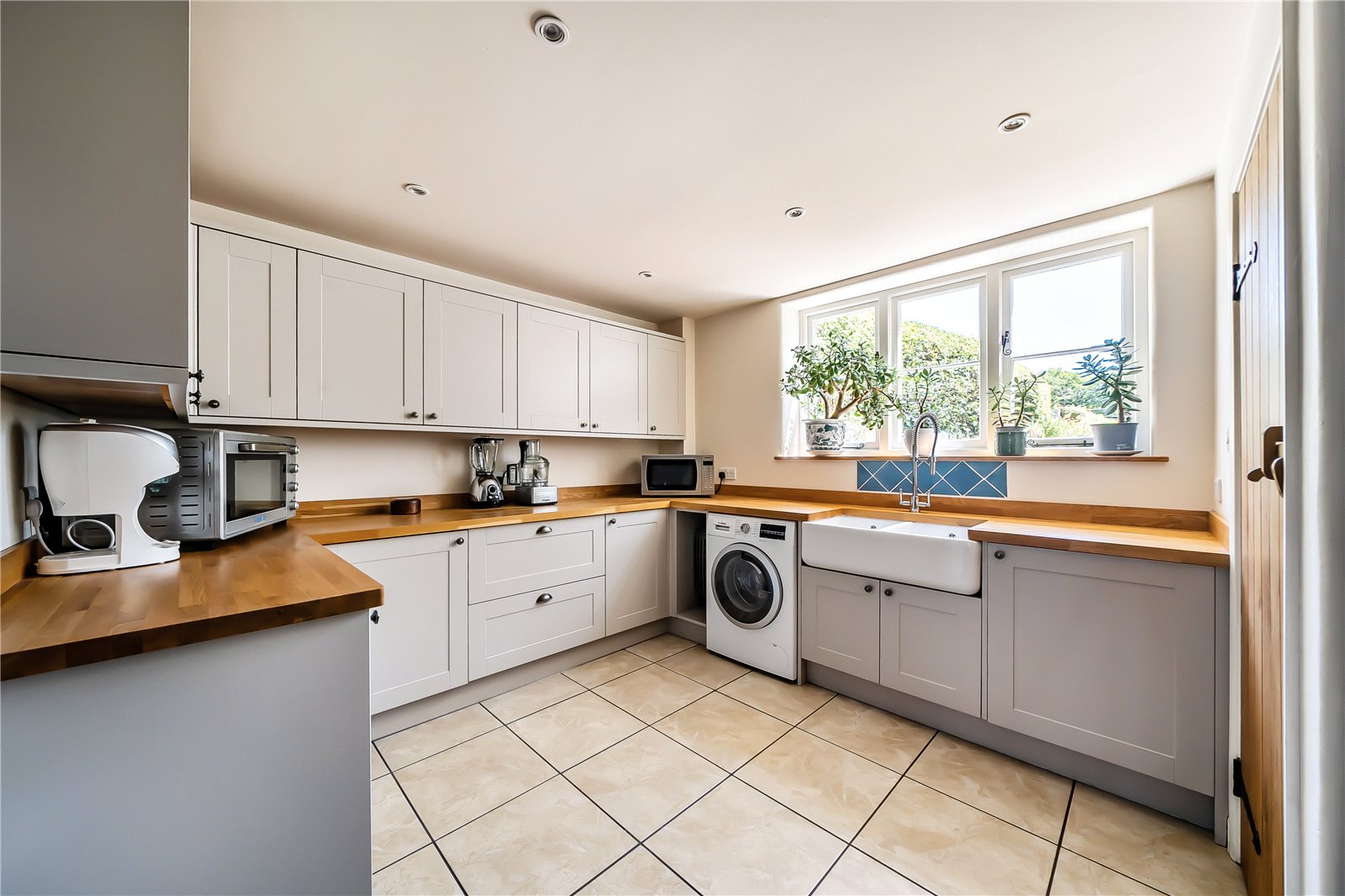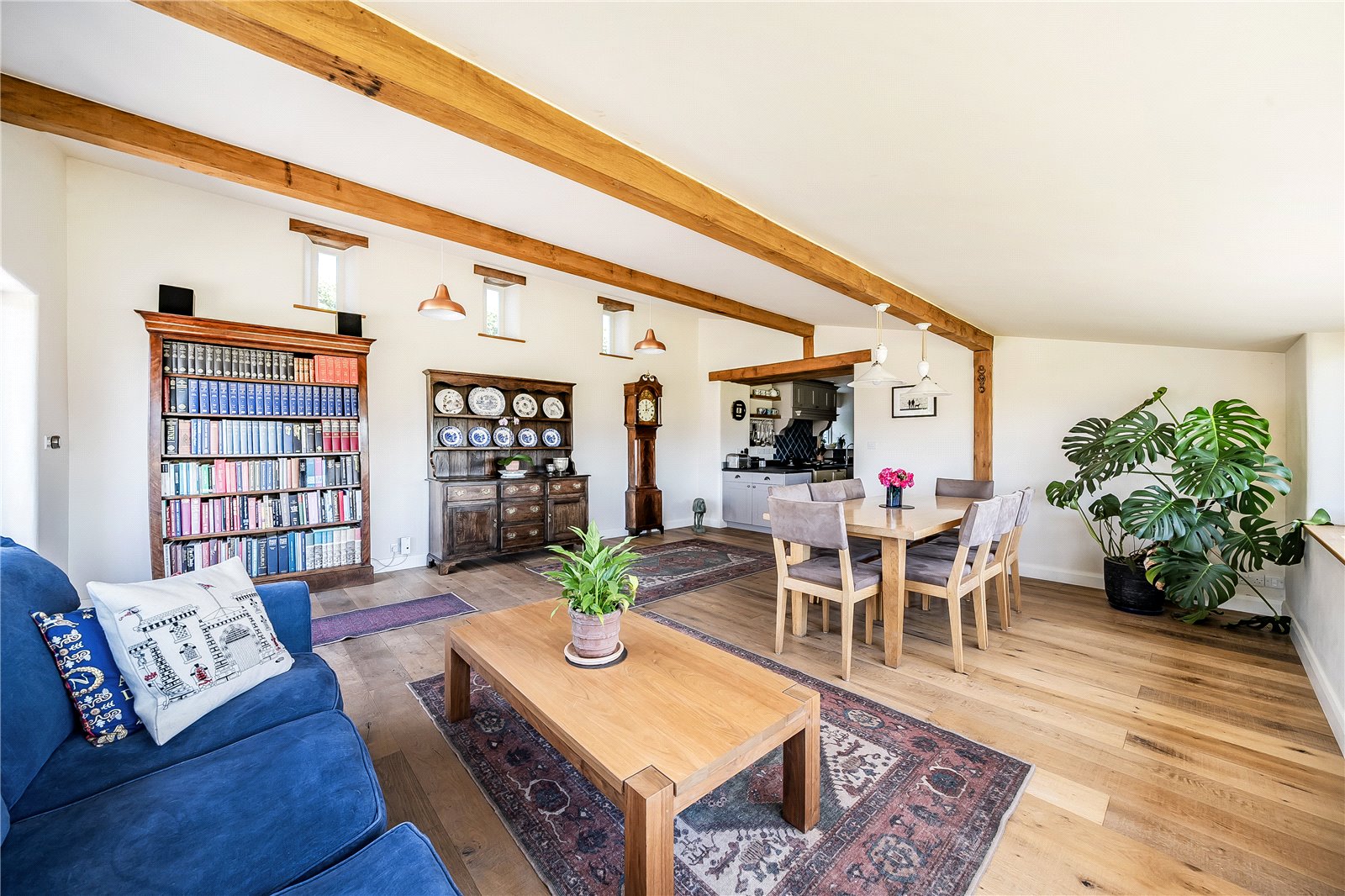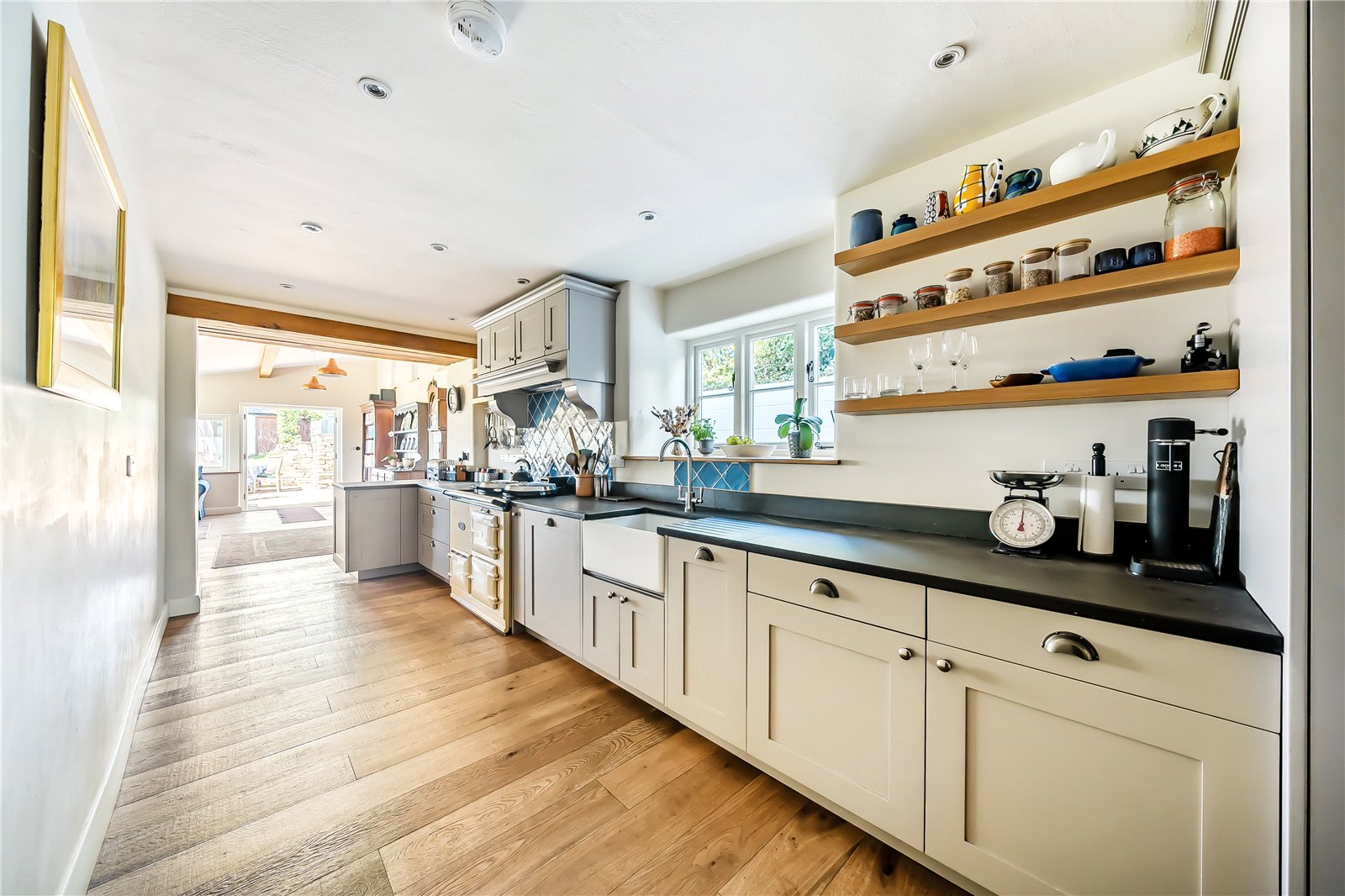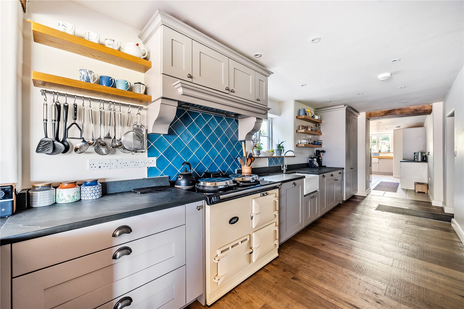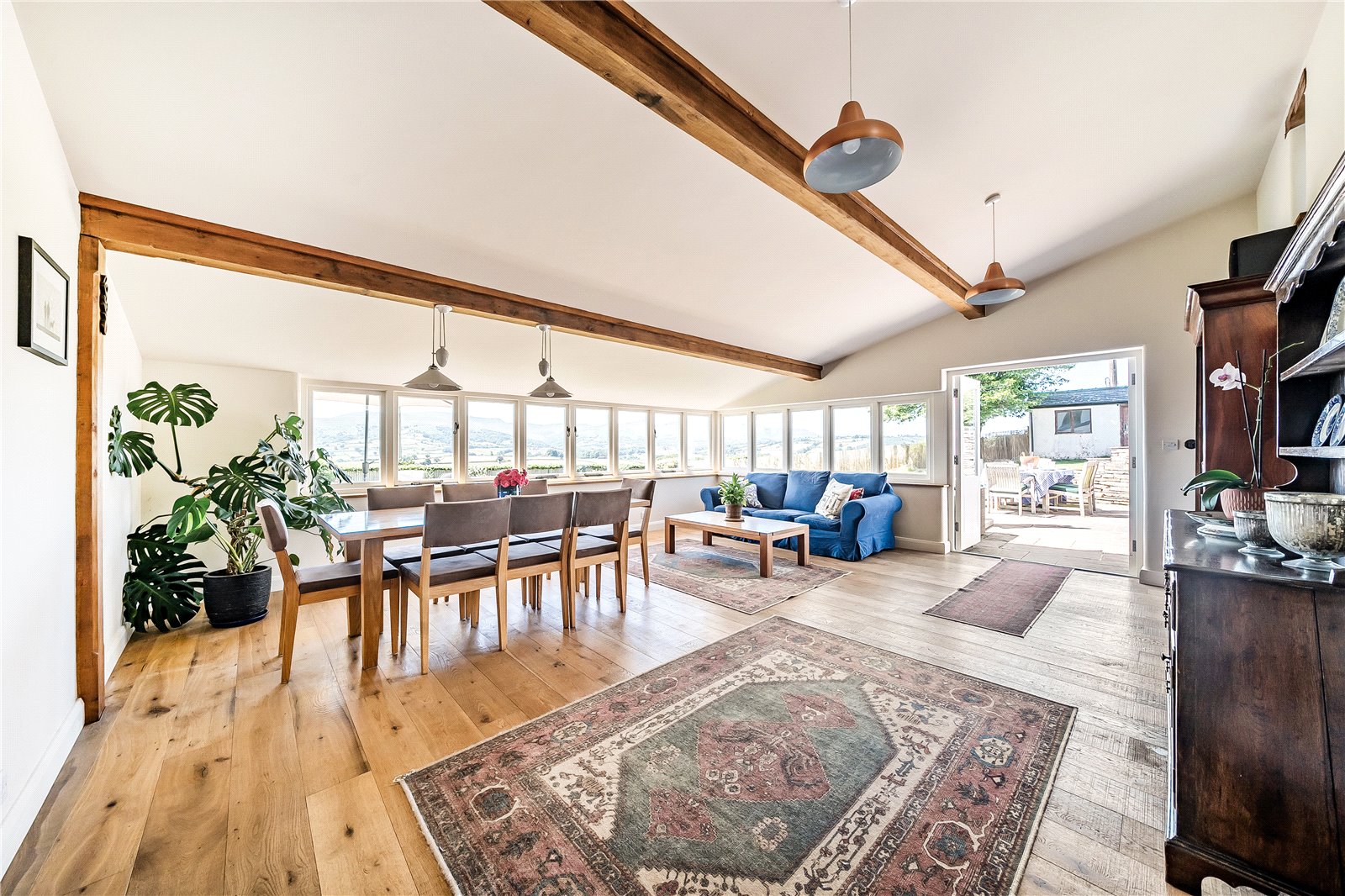To the rear of the property lies the well-appointed kitchen, fitted with a range of units incorporating an inset sink, integrated dishwasher, and an electric AGA—a quintessential feature of any true country home. Beyond, the kitchen flows seamlessly into the dining room, a light-filled space designed for entertaining and undoubtedly one of the home’s standout highlights. With its dual-aspect windows to the front and side, it perfectly captures the sweeping, panoramic views of the Brecon Beacons mountain range. Both the kitchen and dining room benefit from underfloor heating, ensuring comfort throughout the seasons. Adjacent to the kitchen lies a generously sized utility room, superbly equipped with additional fitted units, space and plumbing for white goods, an inset sink, and underfloor heating—ideal for the demands of modern family living. A rear hall gives access to a cloakroom and external passageway which leads to a useful enclosed heated storage area.