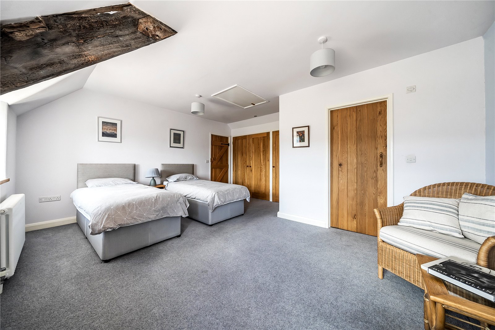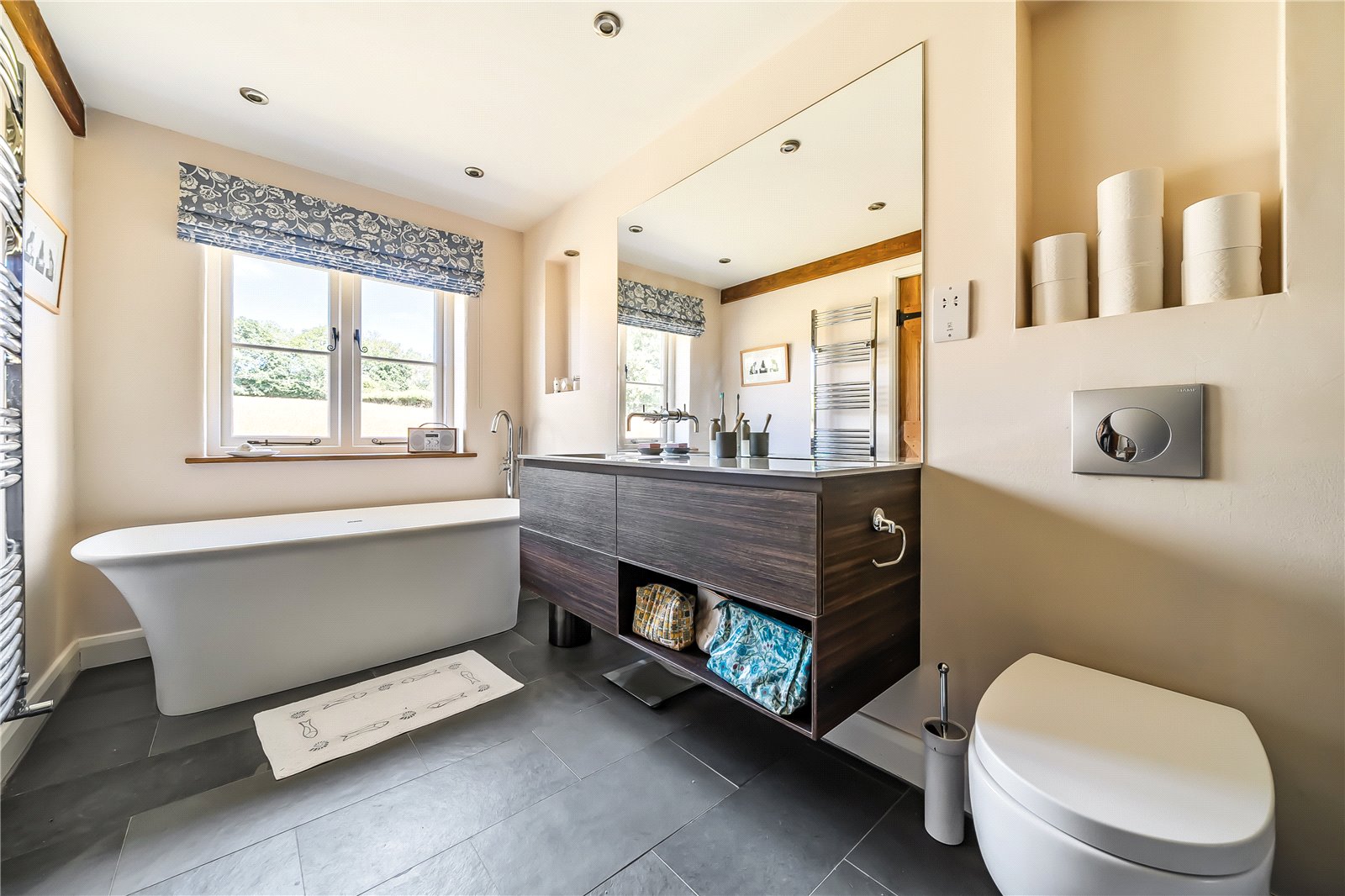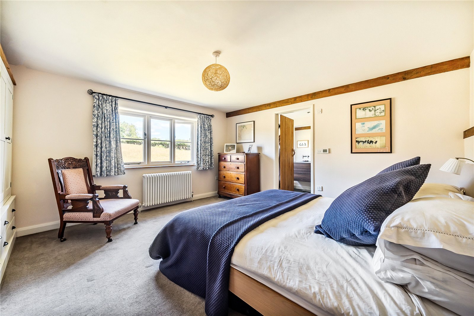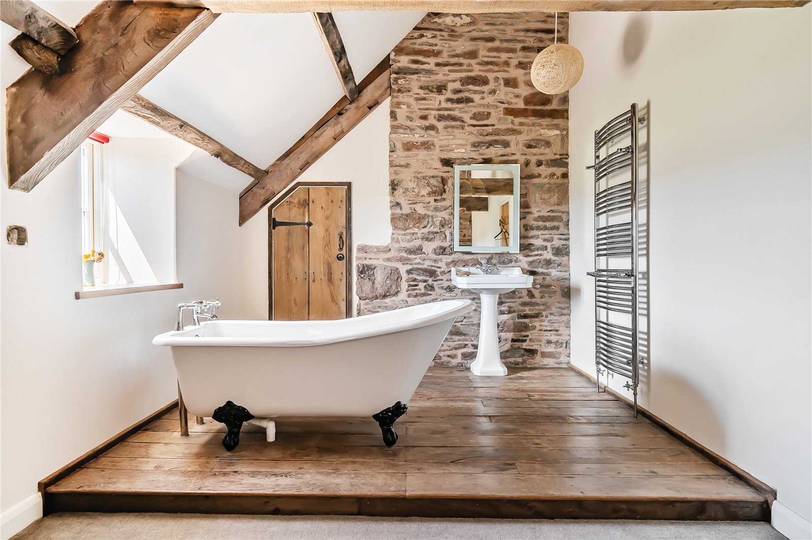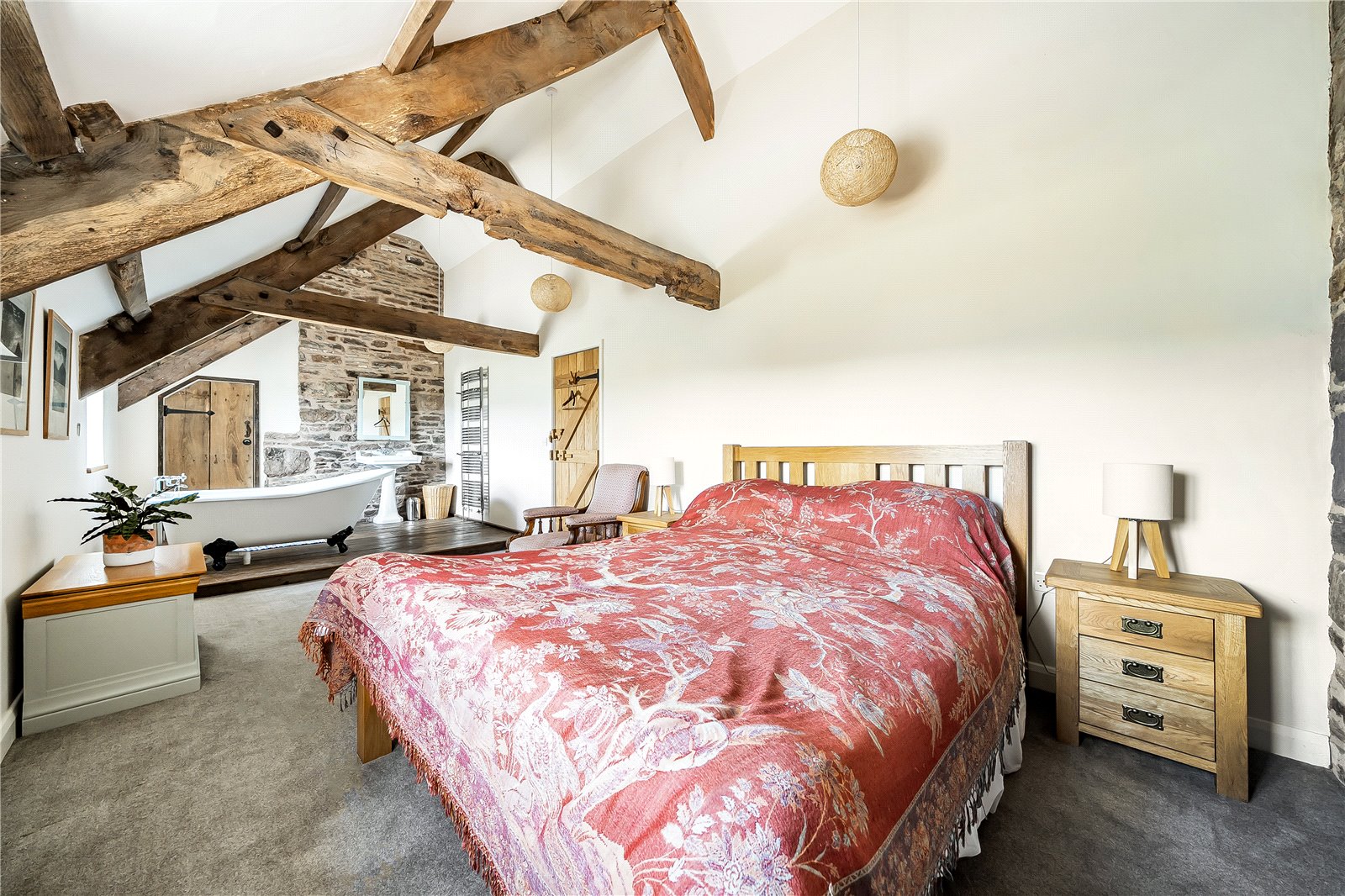 Ascending to the first floor you get further glimpses of the magnificent mountain vista through a large window, while the spacious landing retains the character of the home with its exposed beams and stonework. All four bedrooms are generously proportioned and benefit from their own beautifully appointed en-suite facilities.One particularly impressive bedroom effortlessly combines rustic elegance with contemporary comfort, showcasing striking exposed beams, a vaulted ceiling, and a sumptuous freestanding roll-top bath—perfect for indulgent soaks—alongside a pedestal sink and separate W.C. An adjoining bedroom offers excellent proportions and enjoys a southerly front aspect, complete with an en-suite and built-in wardrobes. To the rear lies another elegant double bedroom with a contemporary en-suite, featuring a modern bath, large walk-in shower, vanity unit, and W.C. Completing the accommodation is the fourth bedroom, enjoying views across the garden towards the mountains, and bene...