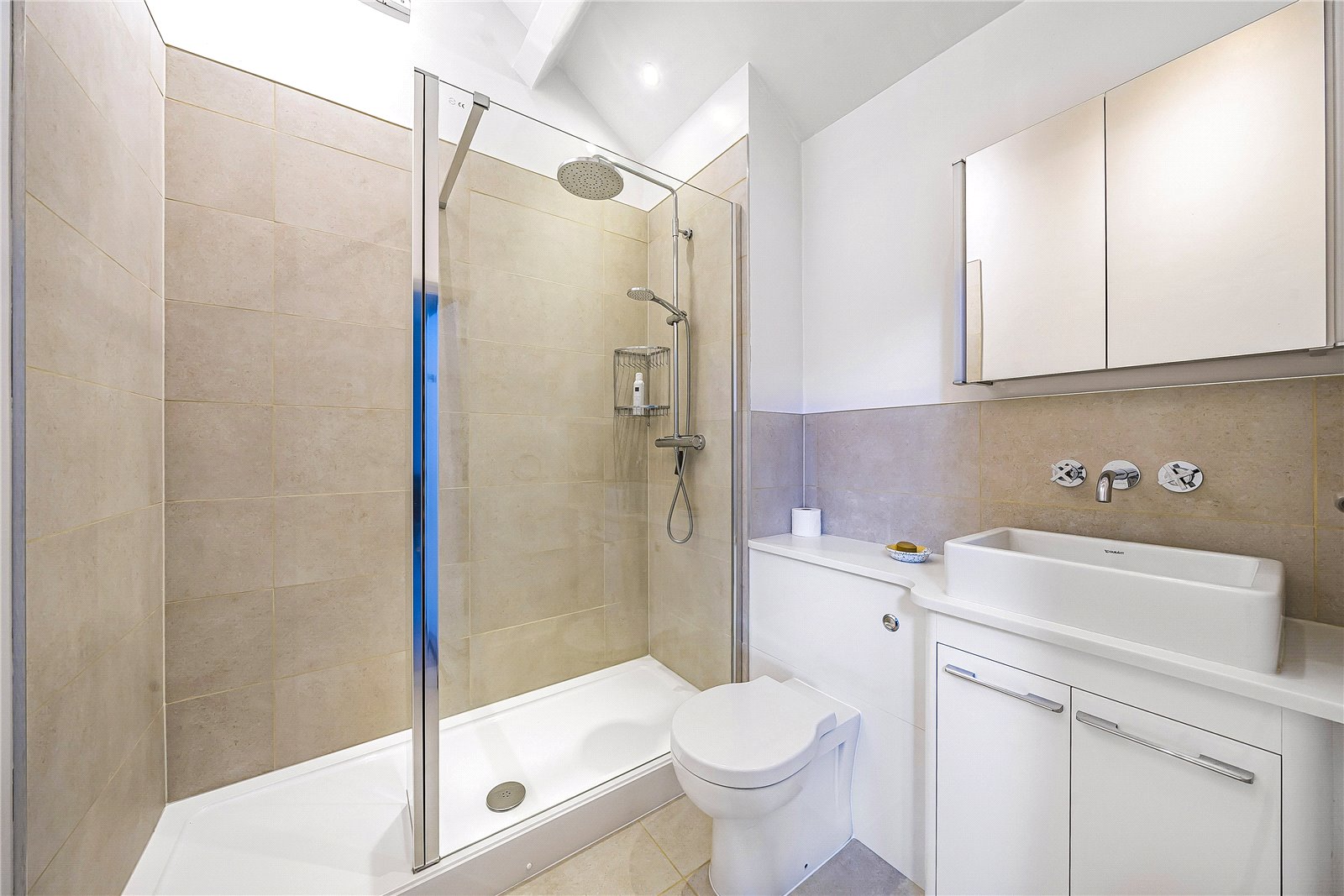 Ascending a further staircase adorned with built-in storage, you'll find yourself on a landing leading to a generously sized double room. This inviting space boasts a vaulted ceiling and expansive vistas. A modern ensuite shower room accompanies the room, featuring a spacious walk-in shower, vanity sink, and w.c.