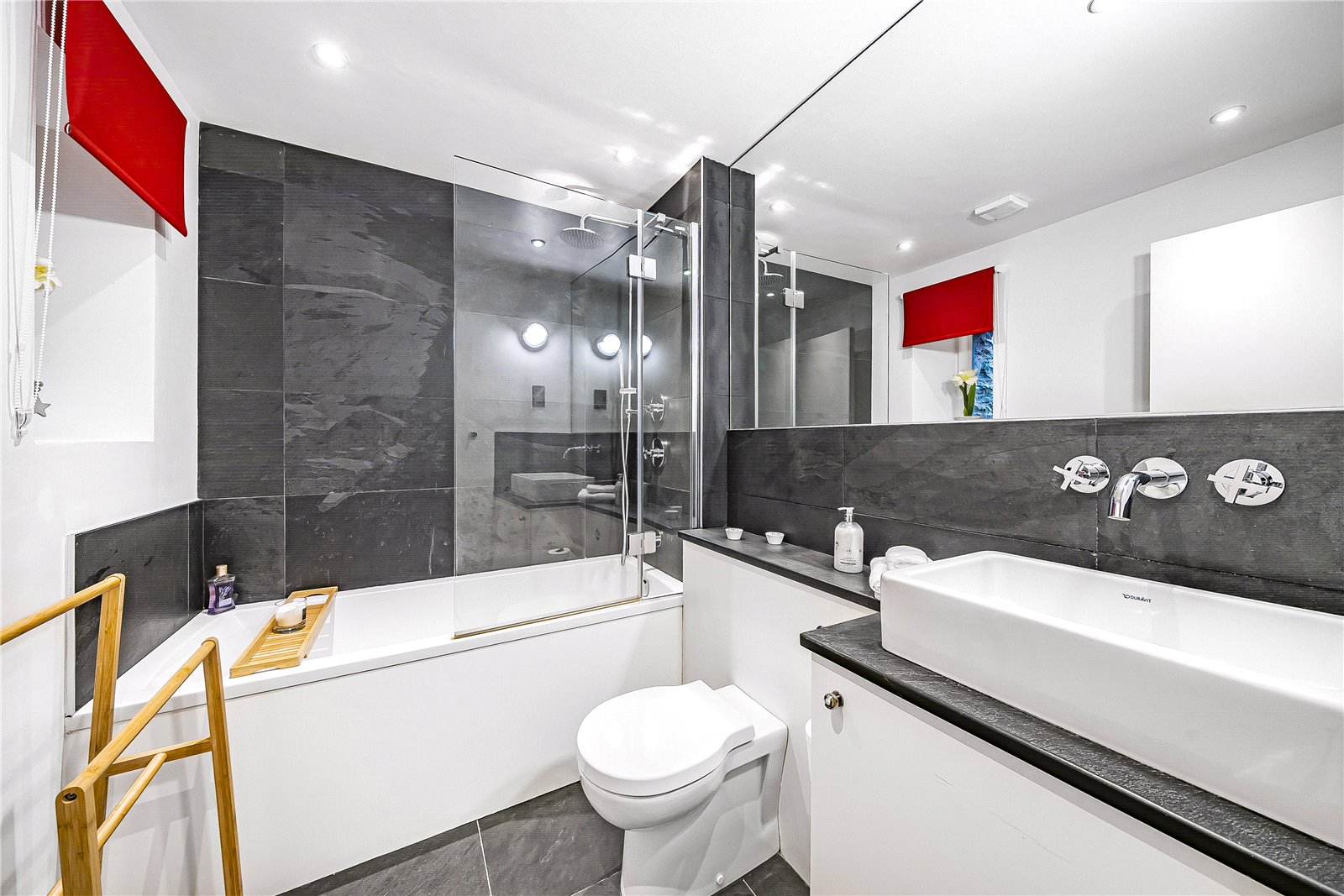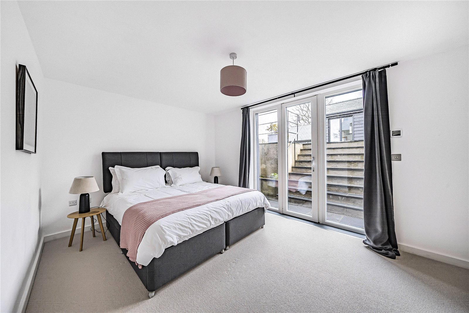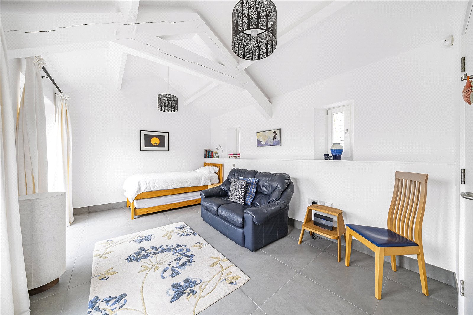 The northern wing of the property offers a split-level layout. On the first floor, a sizable reception room awaits, complete with a Juliet balcony overlooking the courtyard and a wood-burning stove set upon a slate hearth. This versatile room can alternatively serve as a master bedroom suite, complete with its own ensuite shower room featuring a large walk-in shower, vanity sink unit, and w.c.Descending to the lower level, two additional double rooms await, each equipped with French doors opening onto the courtyard. A family bathroom completes this level, featuring a panelled bath with a shower overhead, a vanity sink unit, and a wash hand basin.