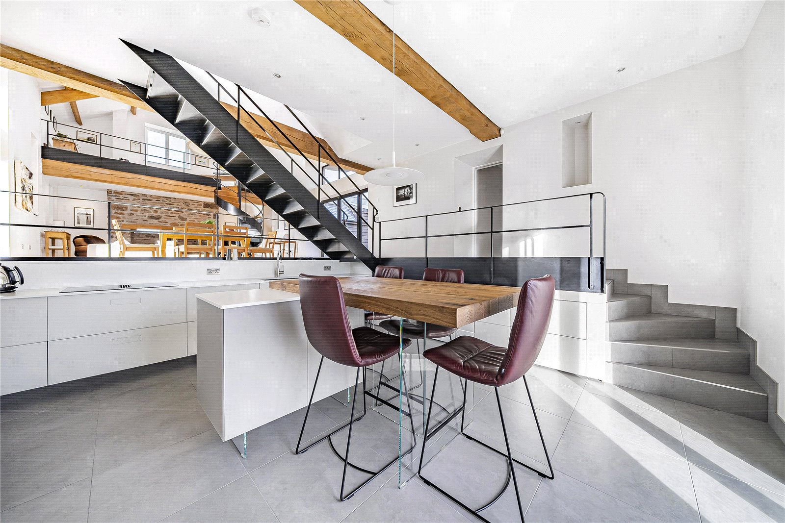 At the opposite end of the hall, a sliding door reveals the open-plan kitchen/living/dining room, meticulously designed to blend style with functionality. This space exudes a captivating ambiance, characterised by vaulted ceilings, exposed beams, and an abundance of natural light streaming in through the floor-to-ceiling windows and 'bi-fold' doors, creating an ideal setting for outdoor dining. Descending steps lead to the handcrafted Italian Lago kitchen, featuring floating units, an inset sink, and integrated appliances including an induction hob, eye-level oven, microwave, and fridge/freezer. A stunning central island doubles as a breakfast bar, while French doors open onto a quaint patio, providing a delightful spot to savor morning coffee amidst the picturesque surroundings. Wood flooring flows seamlessly throughout the dining and seating area, accentuating the charm of the exposed stone fireplace housing an inset wood burner atop a slate hearth. Ascending via a spiral stairca...