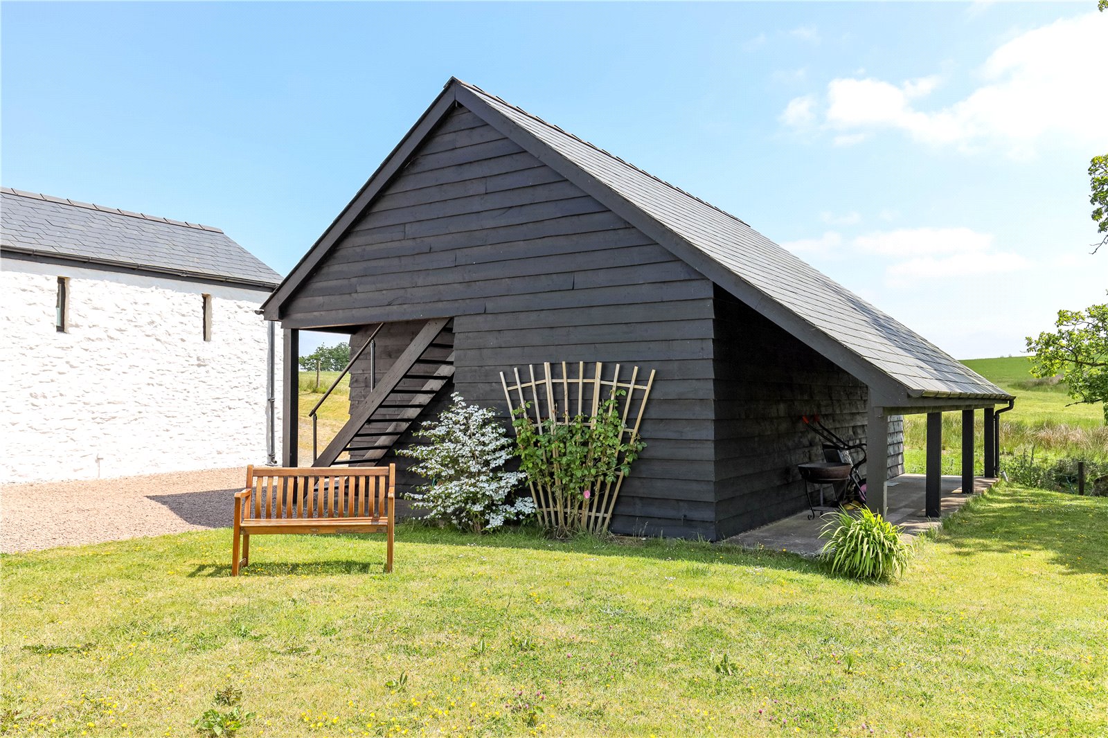 The barn is located at the top of a steep gravel track which meanders through woodland and an open field until reaching the private driveway to the barn. The property boasts panoramic views of the surrounding countryside, offering a dynamic backdrop that evolves with the seasons. Gaze upon the ever-changing vista from the grounds, providing a sense of serenity and natural beauty. A detached double garage with an additional workshop/room above sits elegantly behind the barn, offering practical space for storage or creative pursuits. At the front of the barn, a delightful courtyard welcomes you, providing multiple access points into the property and a serene space to unwind and enjoy the outdoors. Surrounded by extensive lawns, the property features a lovely patio seating area, seamlessly connected to the kitchen. This idyllic spot invites alfresco dining, allowing residents to savor the stunning views.