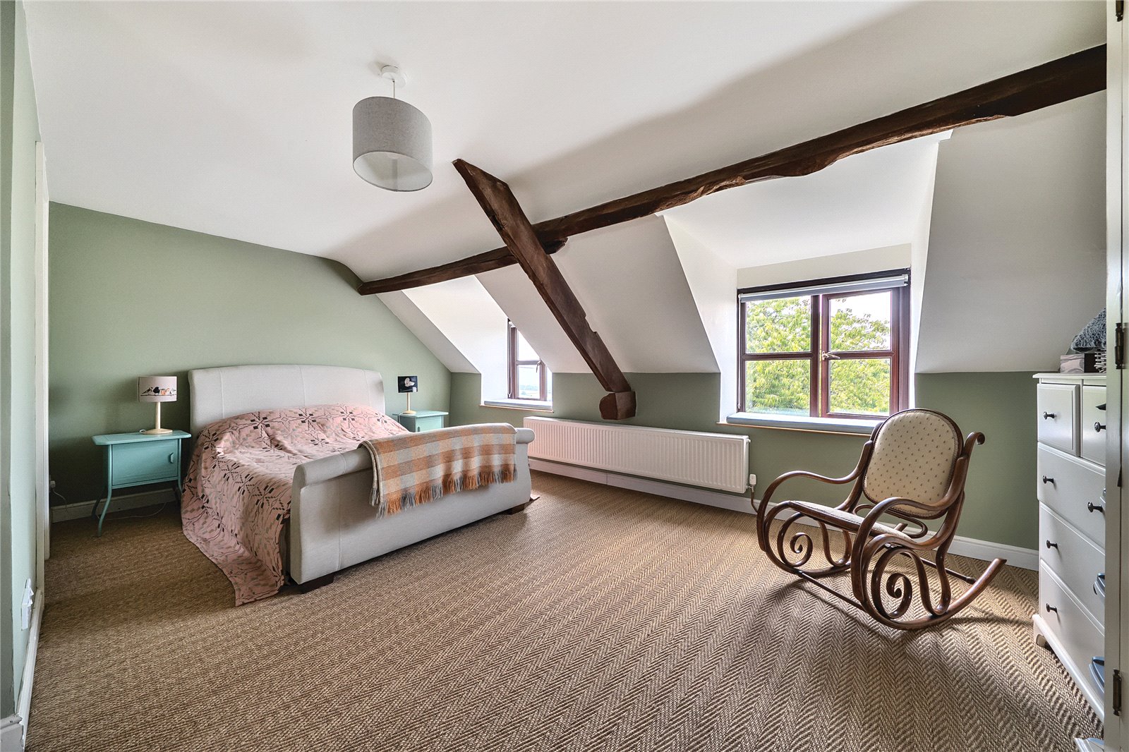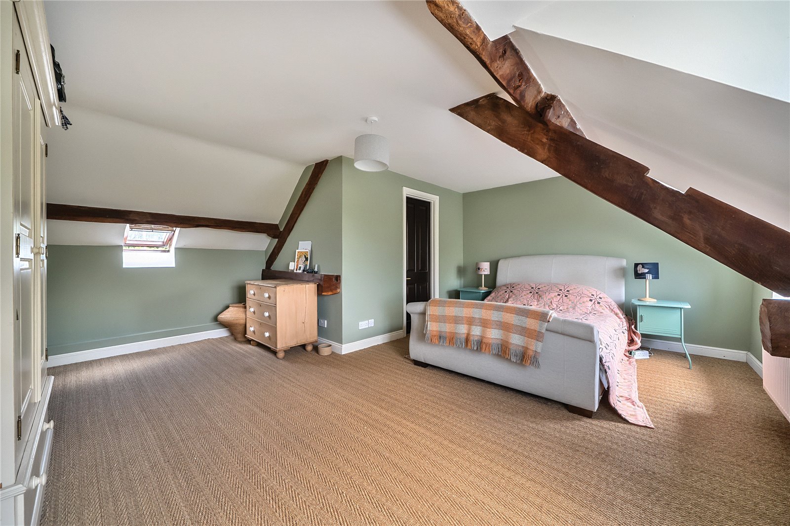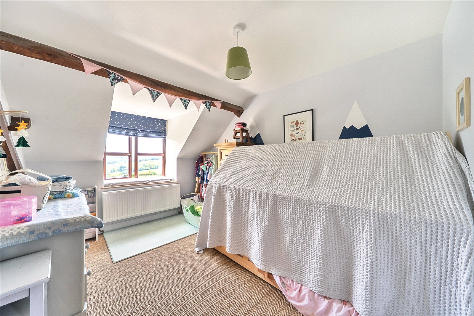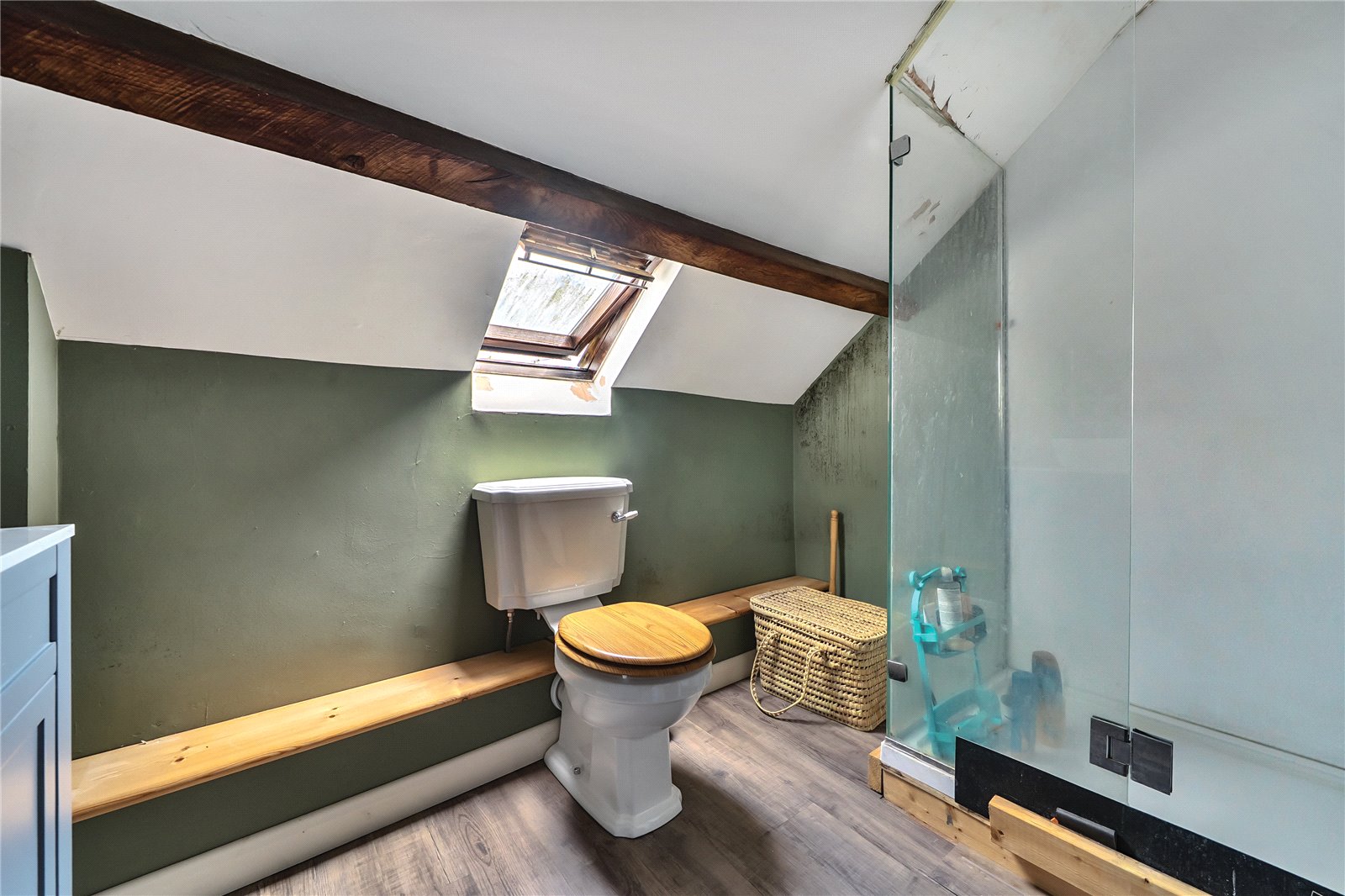 The main landing—complete with airing cupboard—gives access to three bedrooms and a family bathroom. Each bedroom showcases charming exposed beams and front-facing windows offering breathtaking, far-reaching views towards the distant mountains. One bedroom includes a built-in wardrobe, while the spacious master suite benefits from a en-suite shower room featuring a shower, WC, and sink.The secondary staircase leads to two further bedrooms, both enjoying countryside views from their front-facing windows and built-in storage. A modern shower room serves this area, complete with walk-in shower, WC, and vanity sink—perfect for guests or extended family.