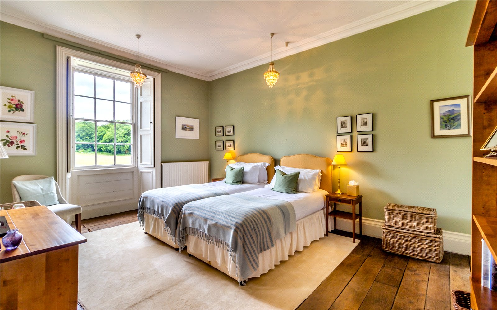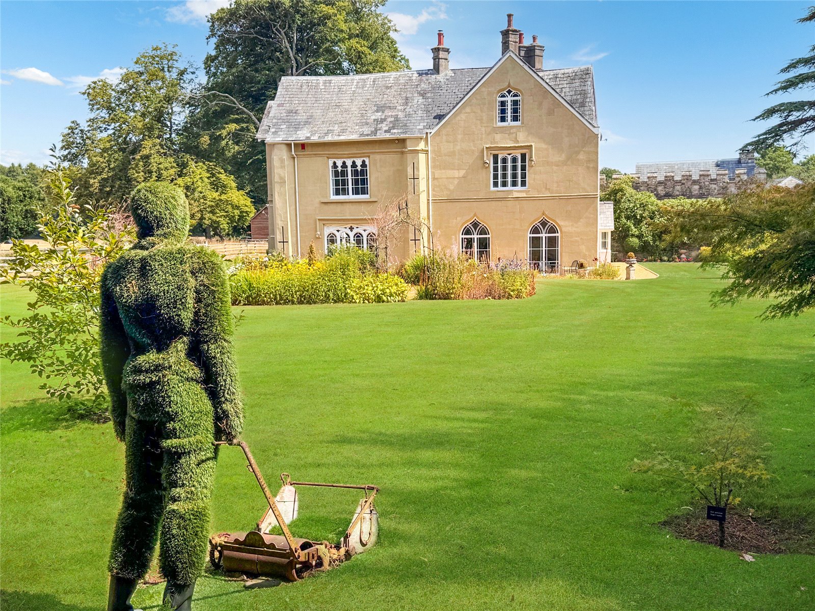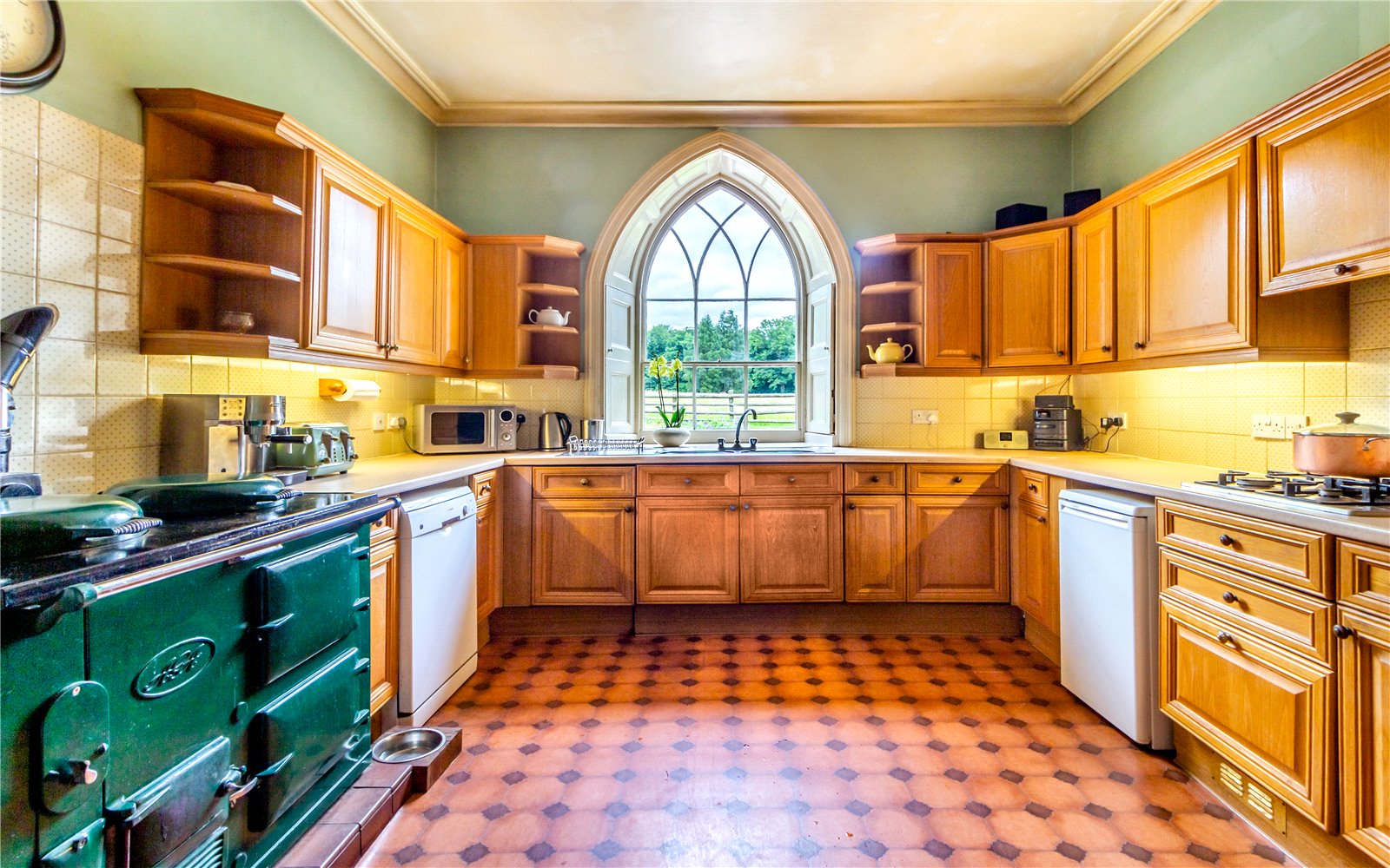 The remainder of the ground floor includes a practical boot room and WC off the main entrance hall, as well as a resplendent inner hall leading to the kitchen, which features a range of matching units and an AGA, and a study/breakfast room, both enjoying views over the front parkland. Additional spaces include a utility and boiler room, pantry, integrated garage, and a cellar. Planning and Listed Building consent have been obtained by the sellers for a substantial extension to create a contemporary 'L'-shaped kitchen and breakfast area (details available on request).